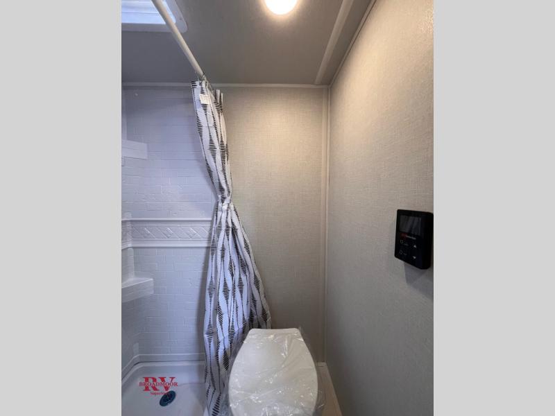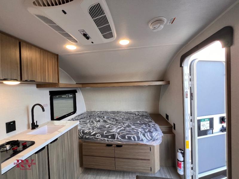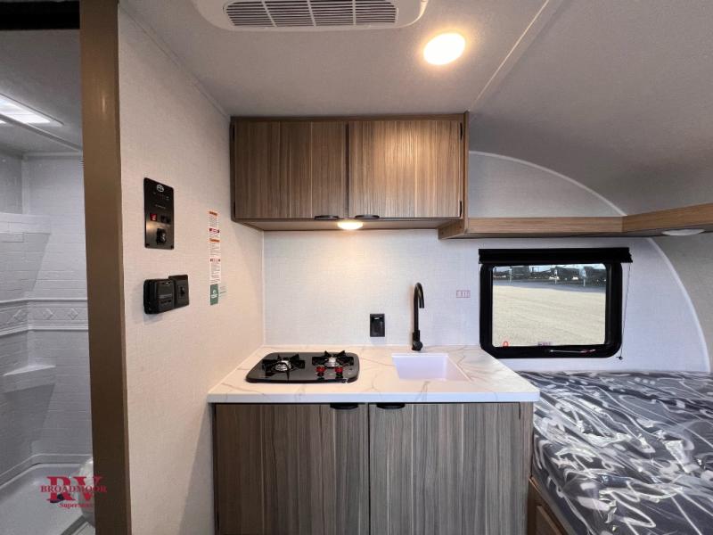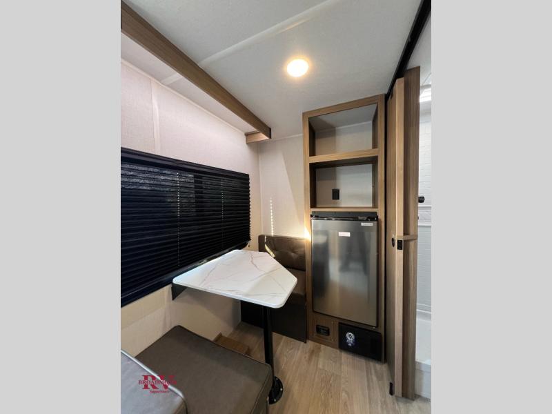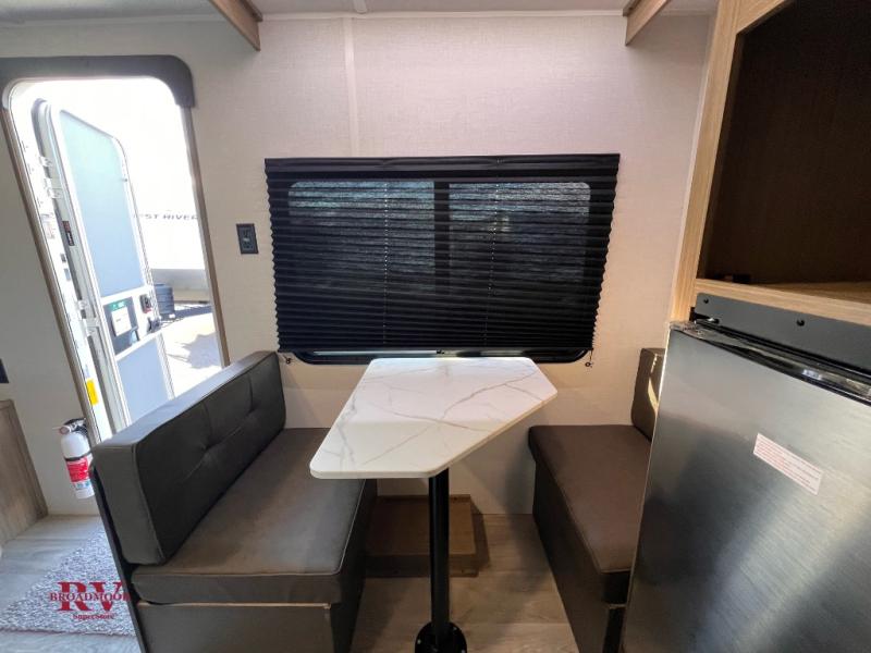This lightweight travel trailer has everything you need to enjoy camping trips! There is a front east to west custom king bed with storage at the foot of the bed and overhead for your valuables. A private bath includes a toilet and walk-in shower so you can easily get ready each day, and you can prepare your meals on the two-burner cooktop when you get hungry. The booth dinette will provide dining space, along with sleeping space for one to two little ones. Don't let this trailer get away!