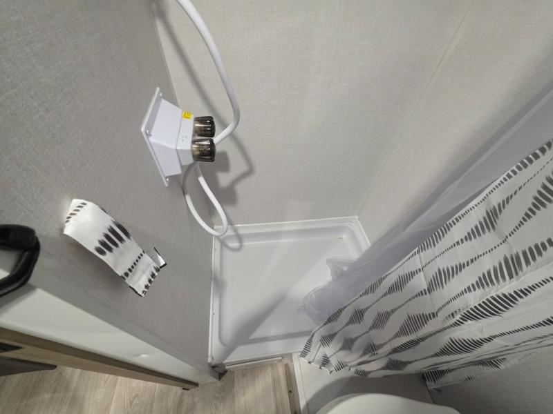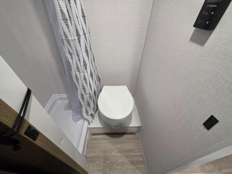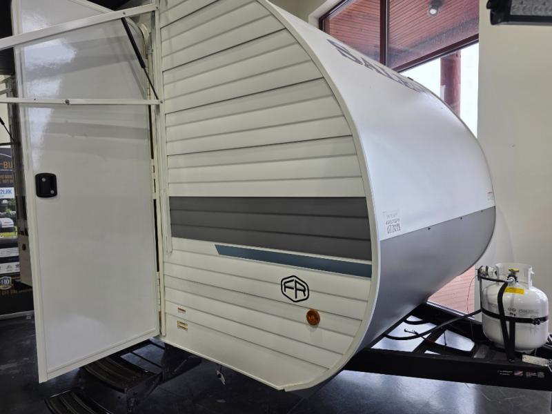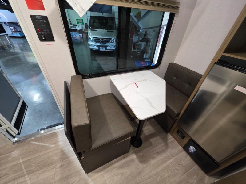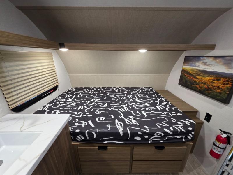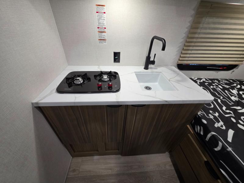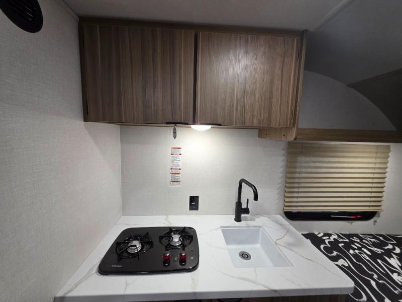 This lightweight travel trailer has everything you need to enjoy camping trips! There is a front east to west custom king bed with storage at the foot of the bed and overhead for your valuables. A private bath includes a toilet and walk-in shower so you can easily get ready each day, and you can prepare your meals on the two-burner cooktop when you get hungry. The booth dinette will provide dining space, along with sleeping space for one to two little ones. Don't let this trailer get away!