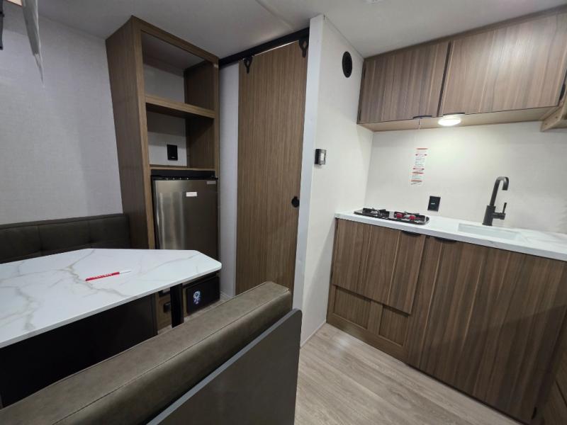 This lightweight travel trailer has everything you need to enjoy camping trips! There is a front east to west custom king bed with storage at the foot of the bed and overhead for your valuables. A private bath includes a toilet and walk-in shower so you can easily get ready each day, and you can prepare your meals on the two-burner cooktop when you get hungry. The booth dinette will provide dining space, along with sleeping space for one to two little ones. Don't let this trailer get away!