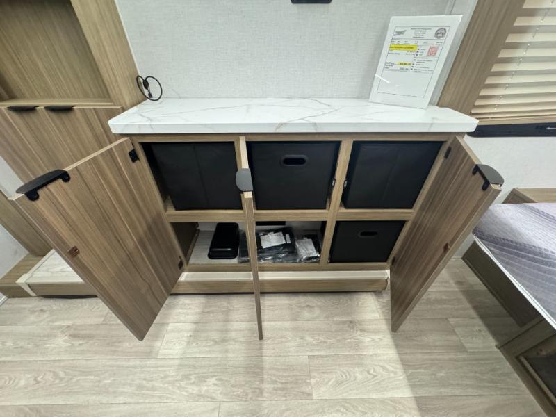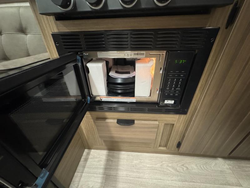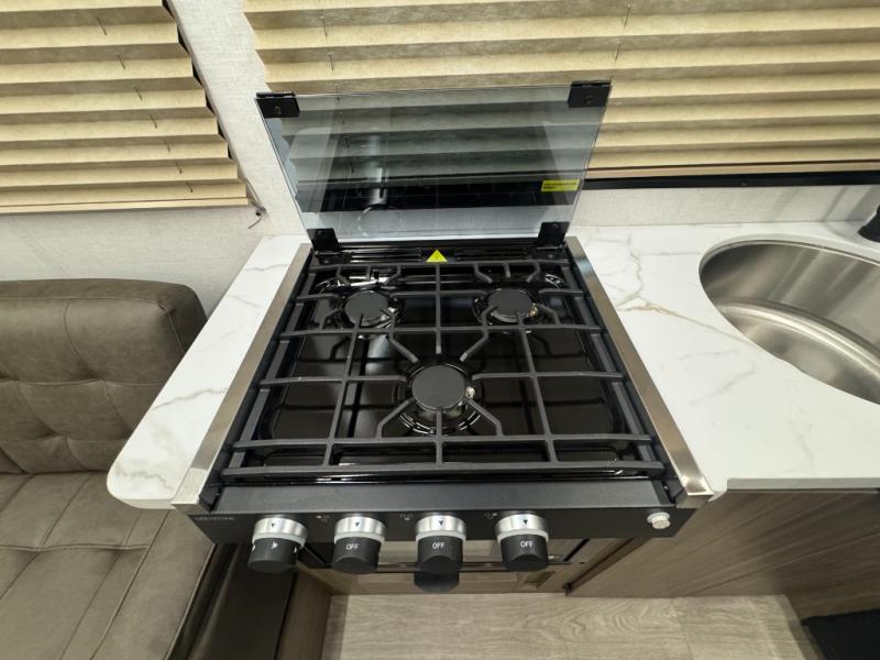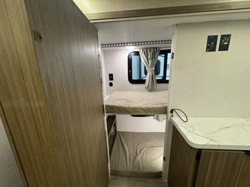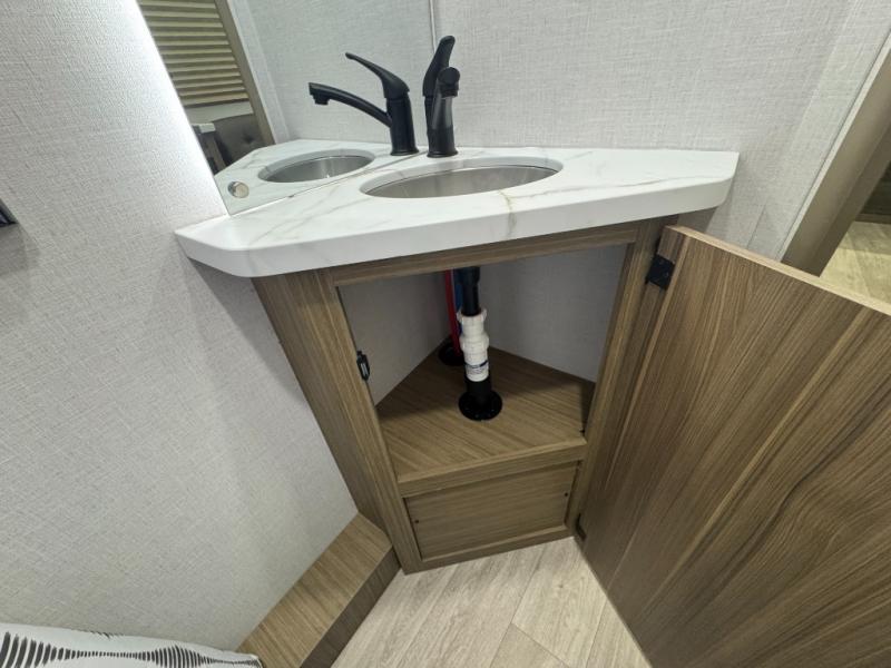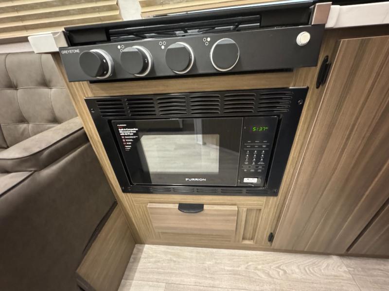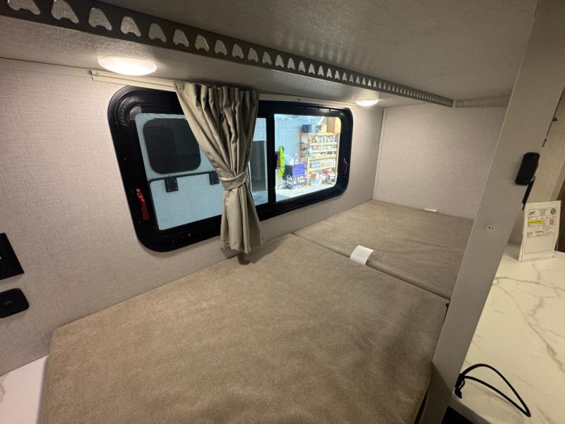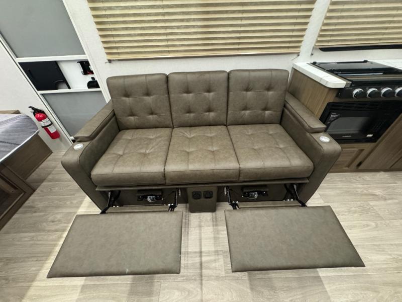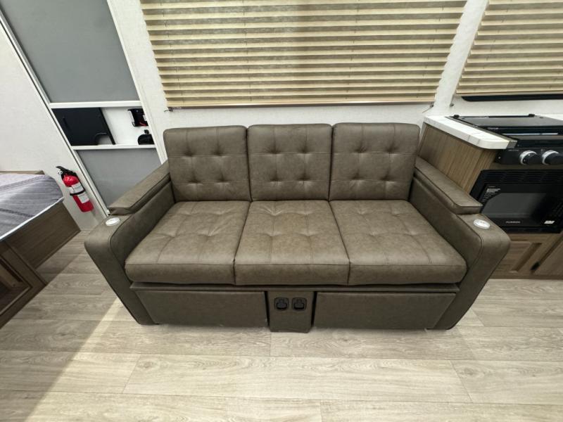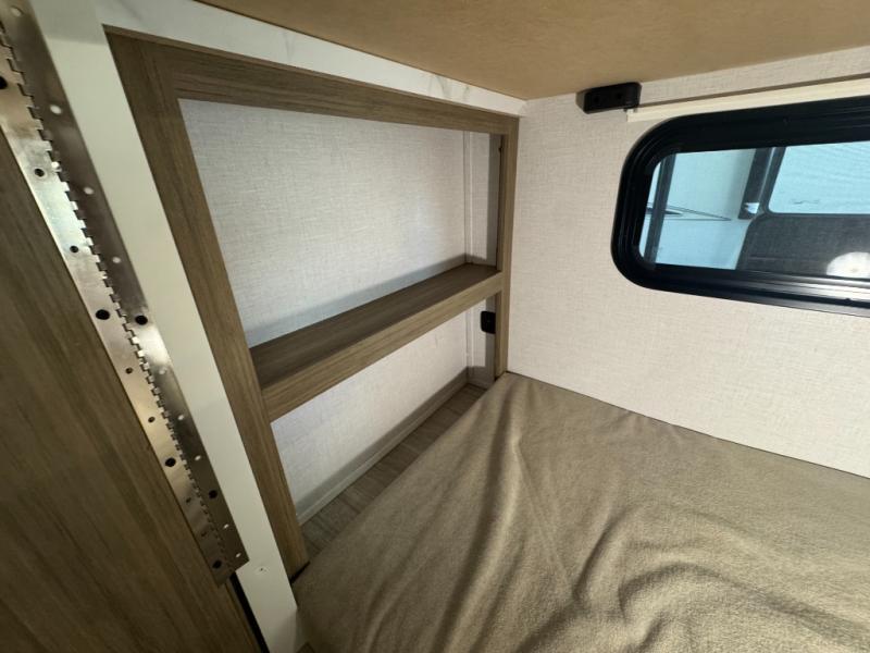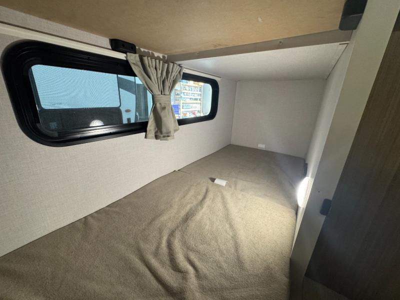 Perfect for your family, this single slide with split bunk and queen bed provides your family comfortable sleeping for four, and the slide adds a bit more interior space in camp. The split bunk is located behind the spice rack door and TV for your entertainment and cooking needs. Speaking of cooking, you can prepare your best home cooked meals with the cooktop, and store any leftovers in the 12V refrigerator. Relax each night in the theater seating and freshen up in the rear corner bathroom each morning which features a skylight over the shower for more natural lighting.