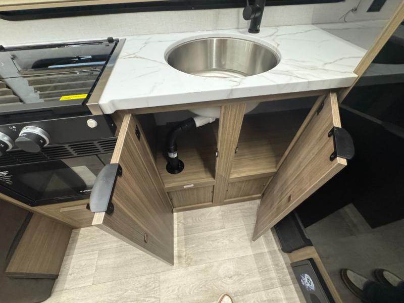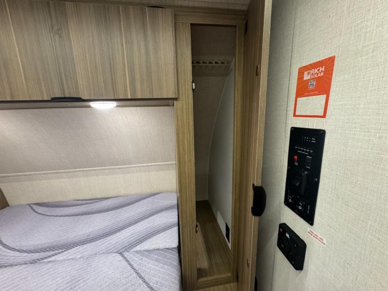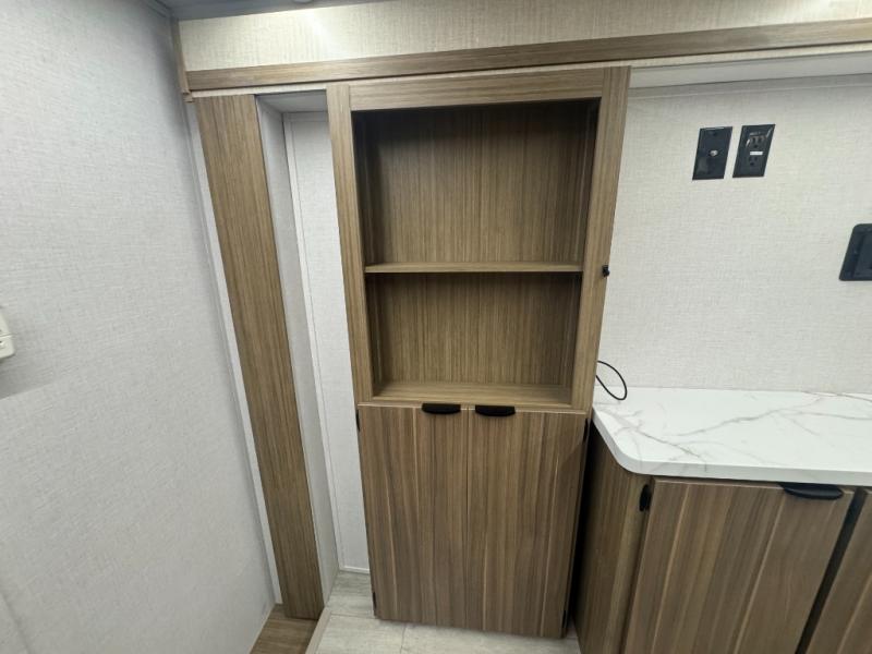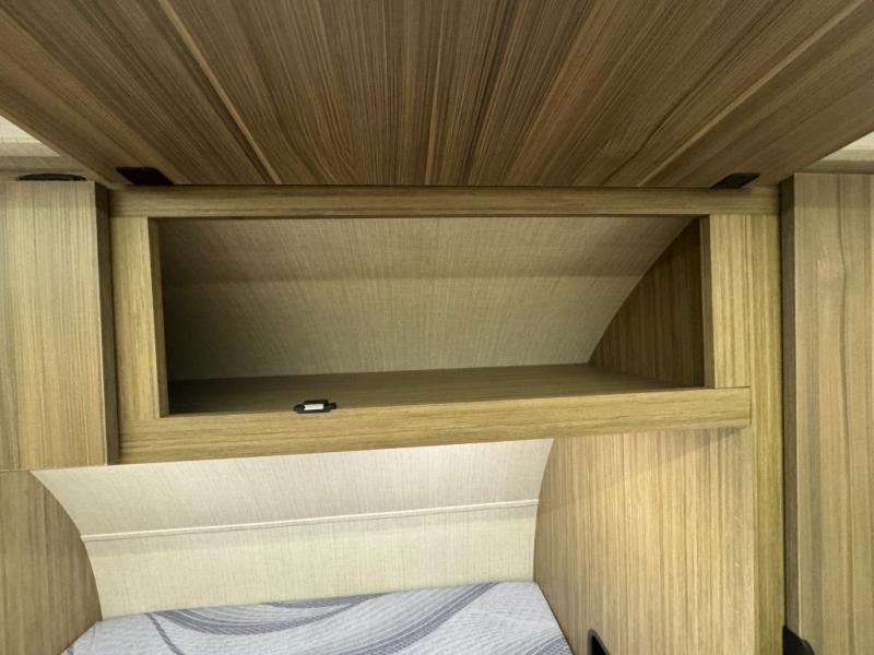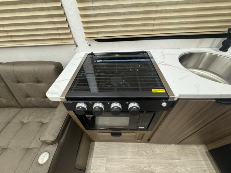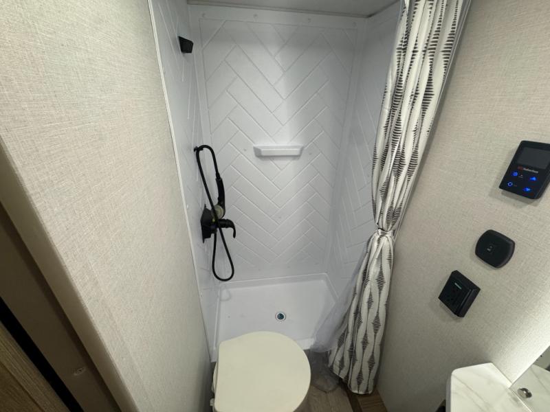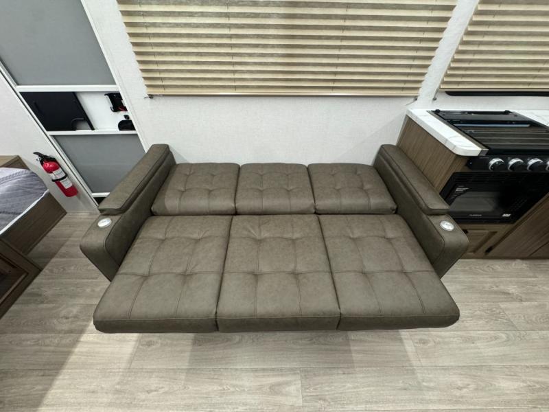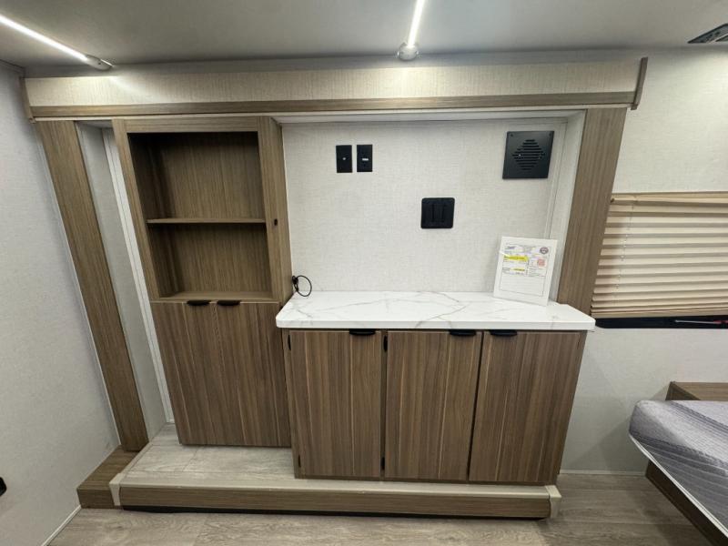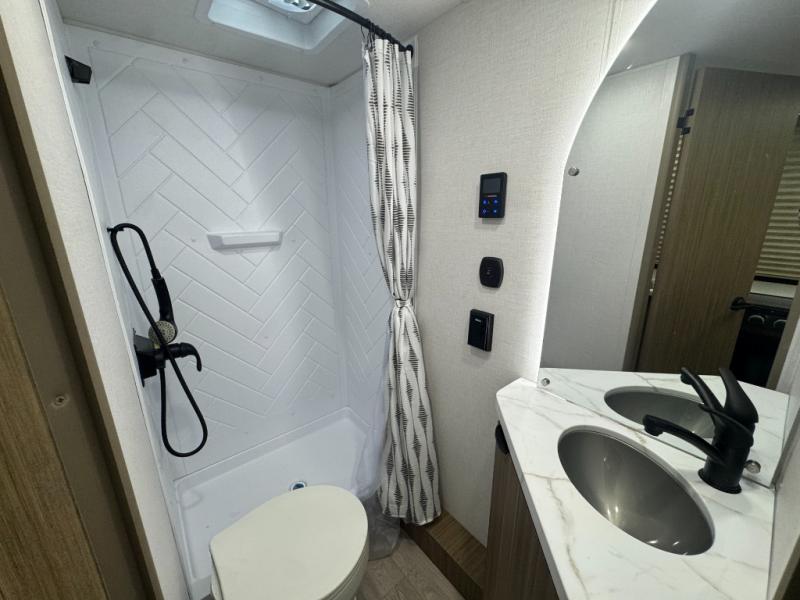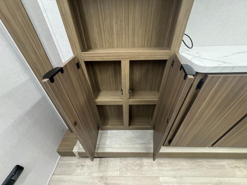 Perfect for your family, this single slide with split bunk and queen bed provides your family comfortable sleeping for four, and the slide adds a bit more interior space in camp. The split bunk is located behind the spice rack door and TV for your entertainment and cooking needs. Speaking of cooking, you can prepare your best home cooked meals with the cooktop, and store any leftovers in the 12V refrigerator. Relax each night in the theater seating and freshen up in the rear corner bathroom each morning which features a skylight over the shower for more natural lighting.