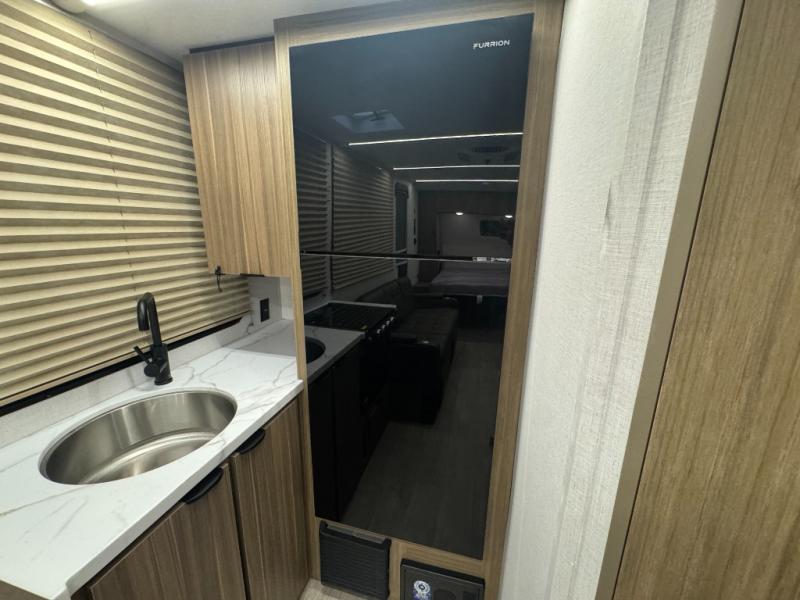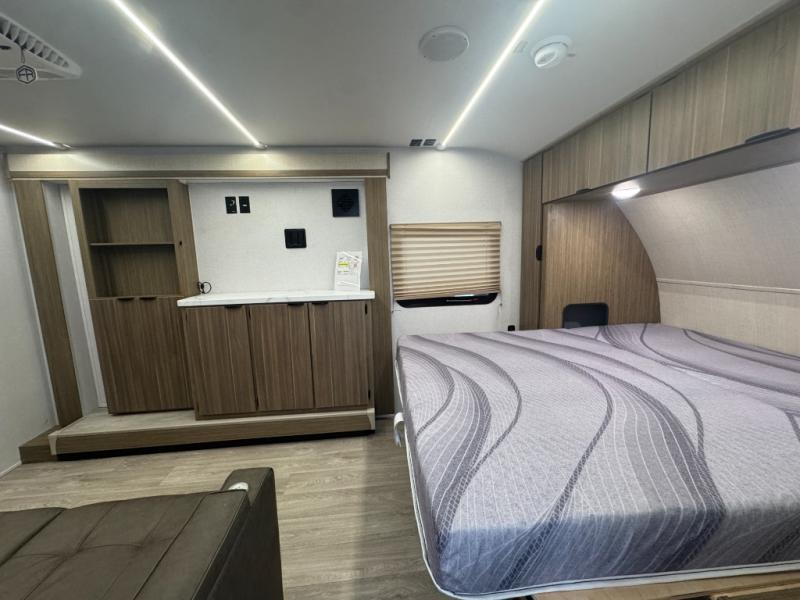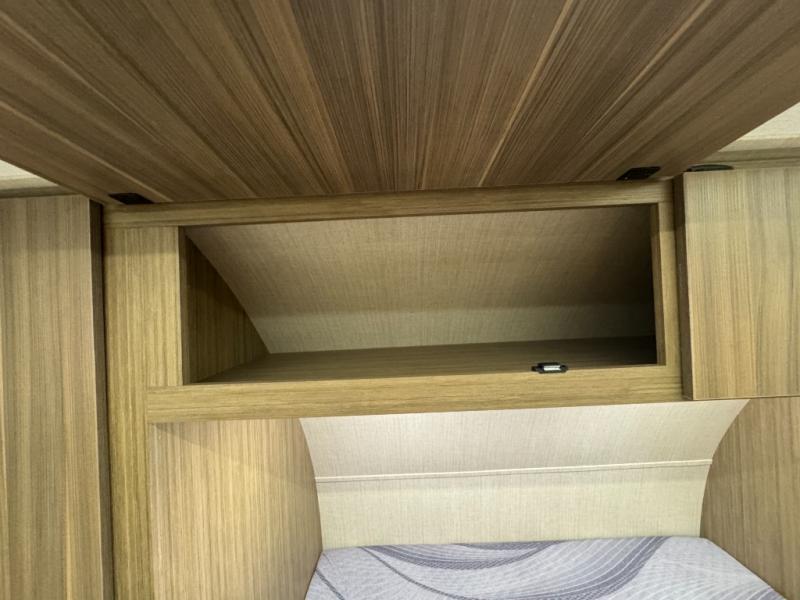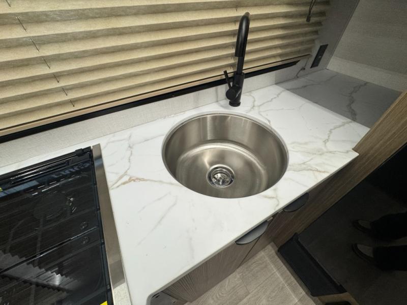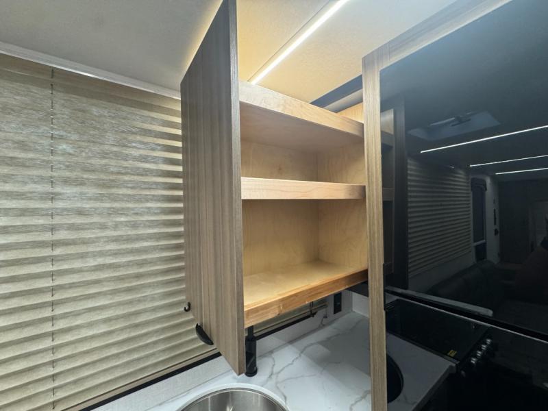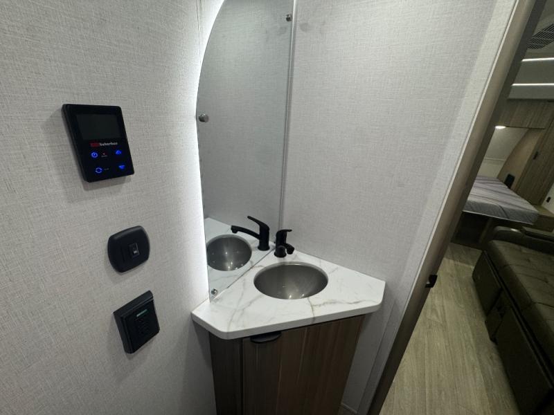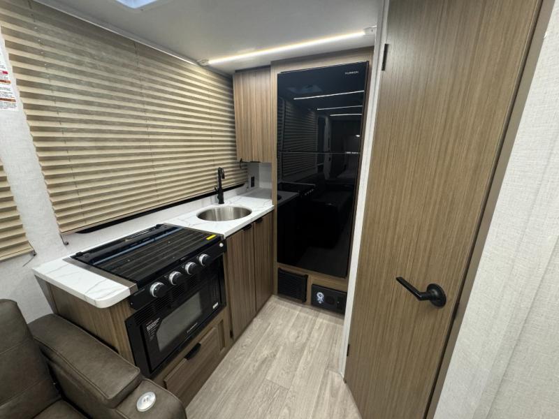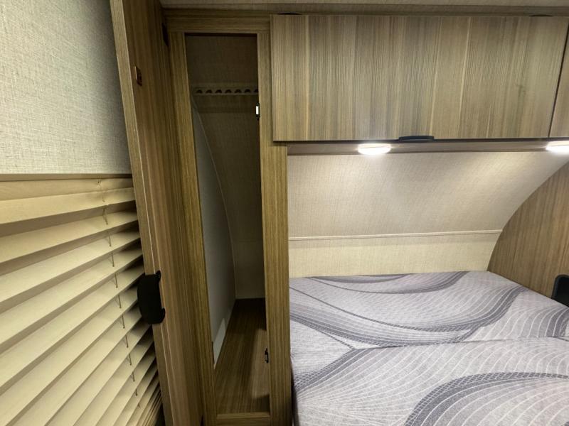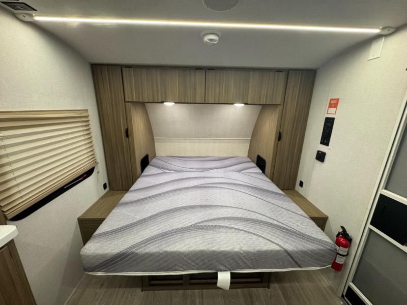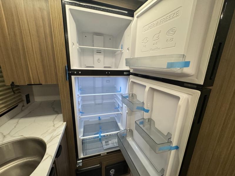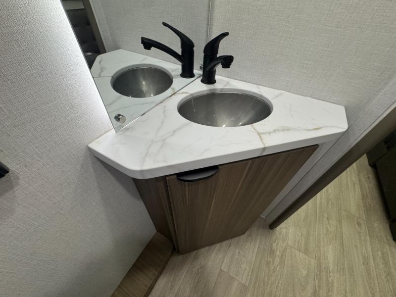 Perfect for your family, this single slide with split bunk and queen bed provides your family comfortable sleeping for four, and the slide adds a bit more interior space in camp. The split bunk is located behind the spice rack door and TV for your entertainment and cooking needs. Speaking of cooking, you can prepare your best home cooked meals with the cooktop, and store any leftovers in the 12V refrigerator. Relax each night in the theater seating and freshen up in the rear corner bathroom each morning which features a skylight over the shower for more natural lighting.