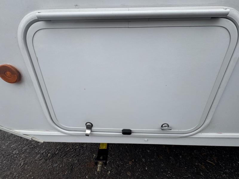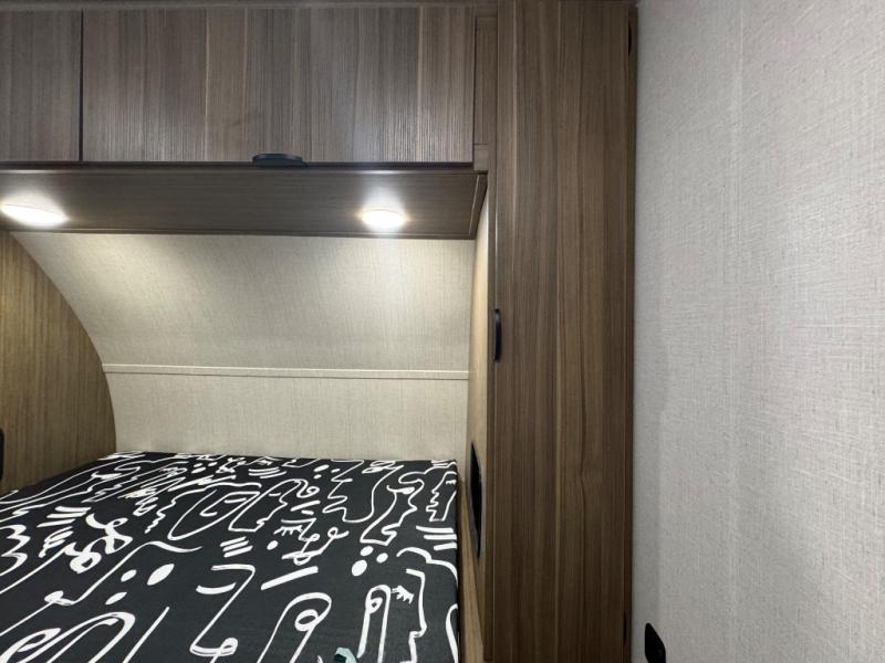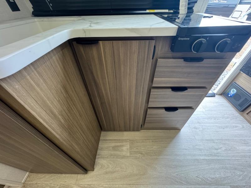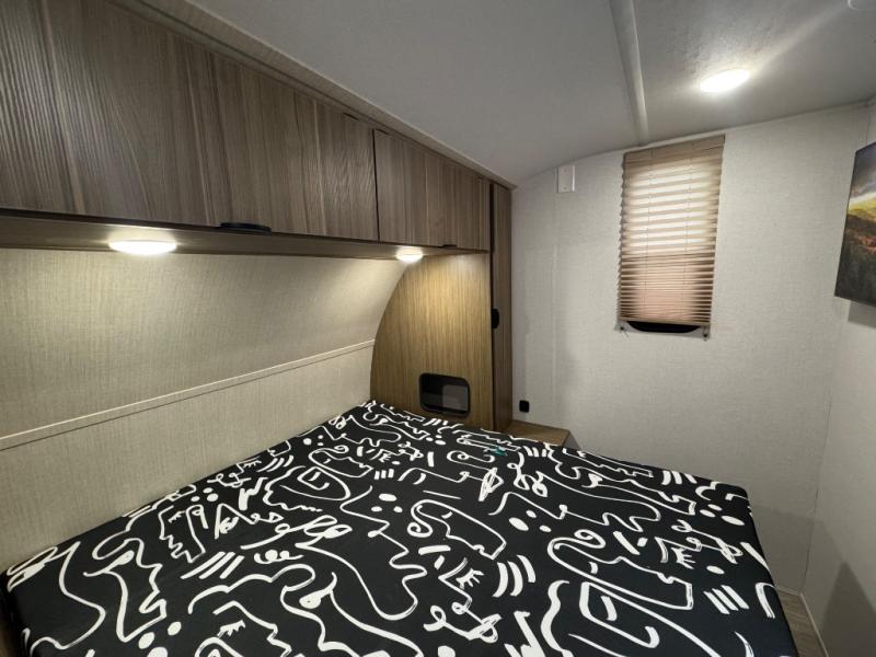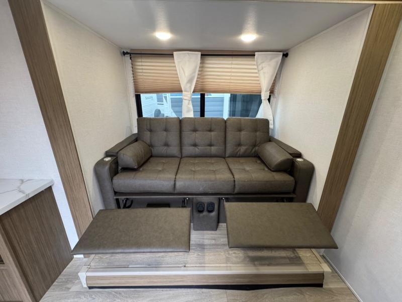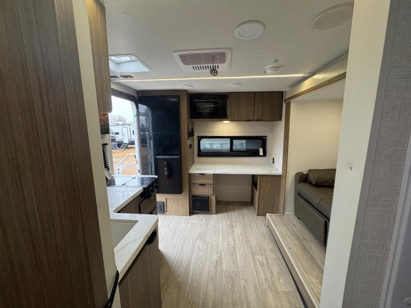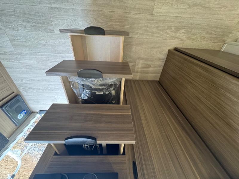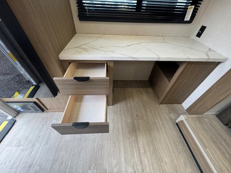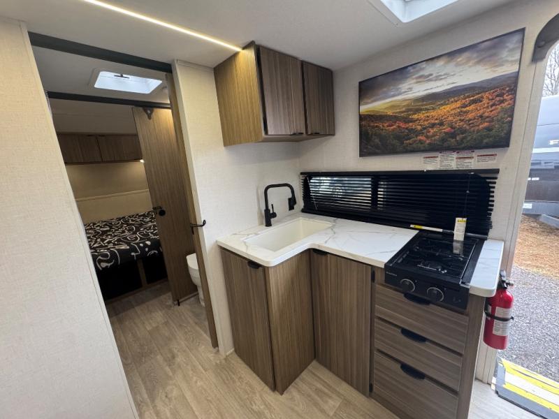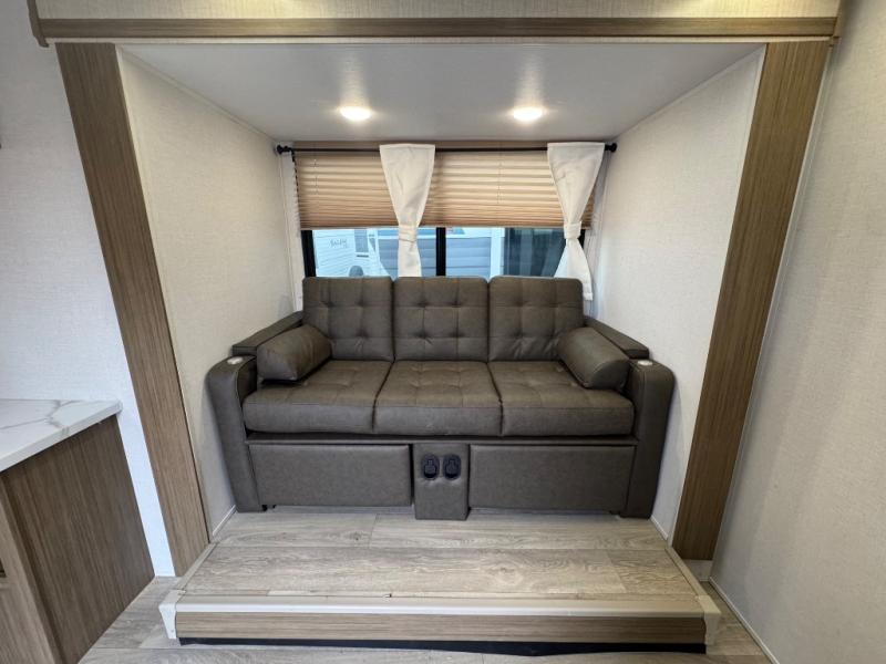 You're going to love every minute spent in this couple's trailer. The queen bed in the front private bedroom will provide a great night's rest, and there are dual wardrobes to easily get dressed in the morning. Head to the kitchen through the bath, then prepare eggs and bacon on the two-burner cooktop. There is a sofa slide out here to enjoy your coffee at each morning, or you may want to get some work done at the mobile workstation!