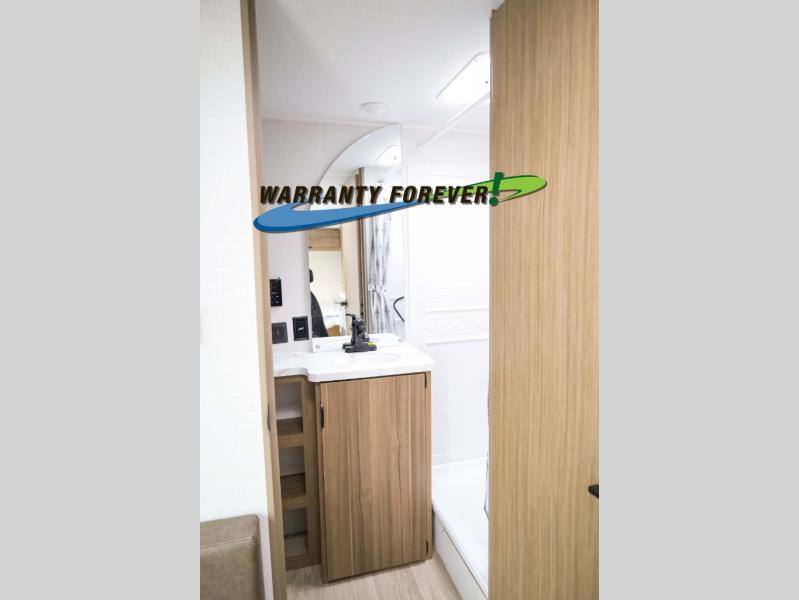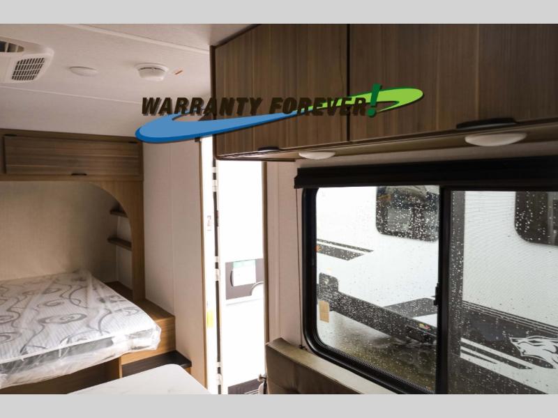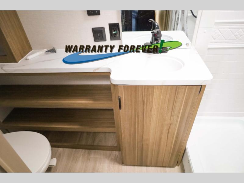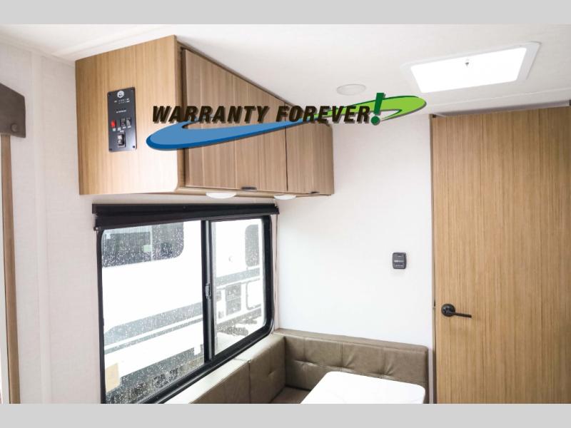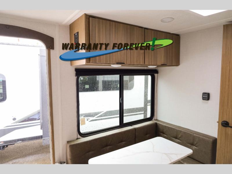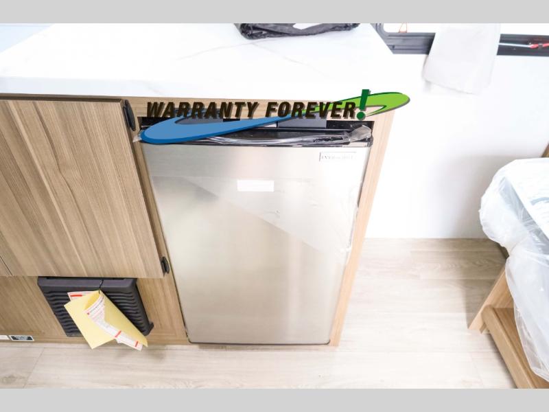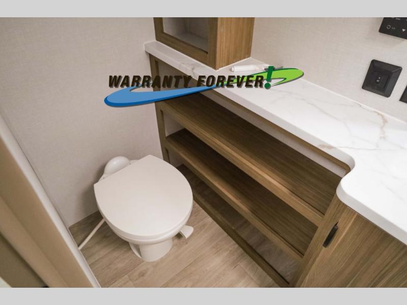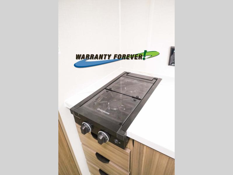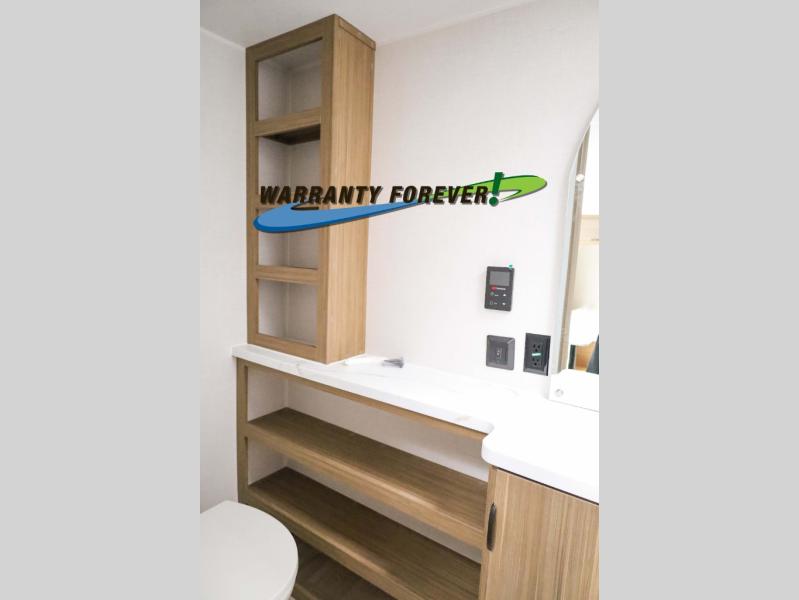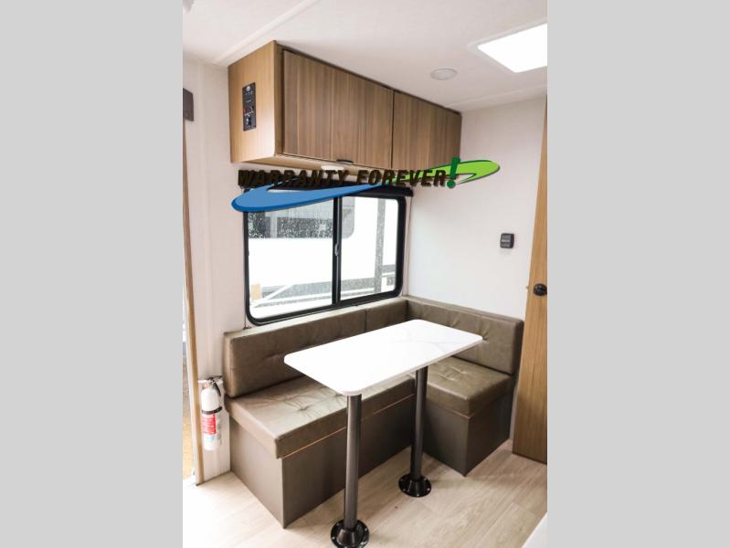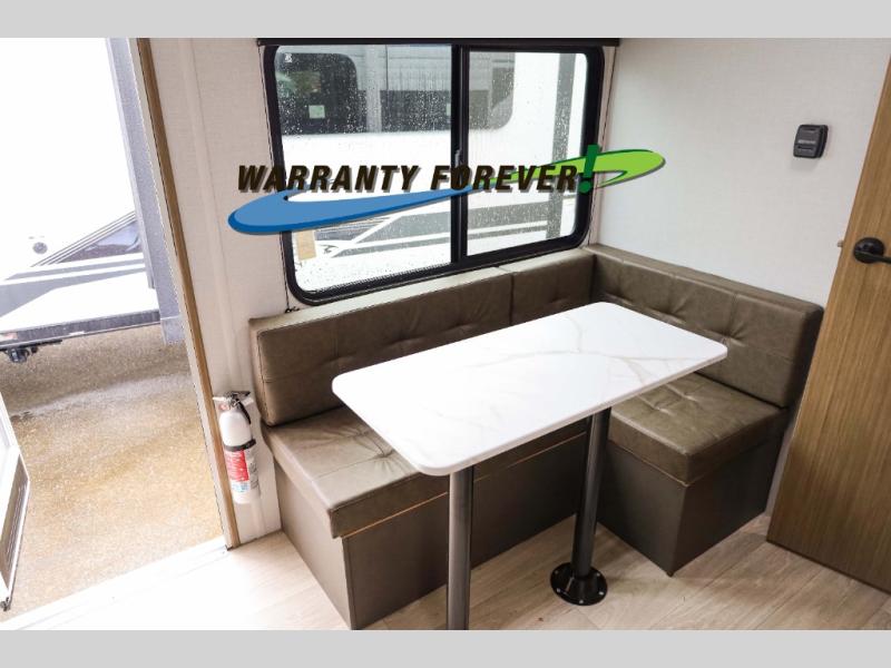 You can enjoy at-home comforts wherever you decide to camp in this travel trailer. The custom king bed with Versa Tilt includes dual shelves and a wardrobe so you can keep your space tidy. If you have a guest or two little ones, they can sleep on the jackknife sofa within the large slide out or on the double-size bunks right next to the full bath. Once you've made breakfast in the fully equipped kitchen, you can utilize the pull-out table to dine at. There is also a fireplace below the table, which will be perfect for cozy evenings indoors.
