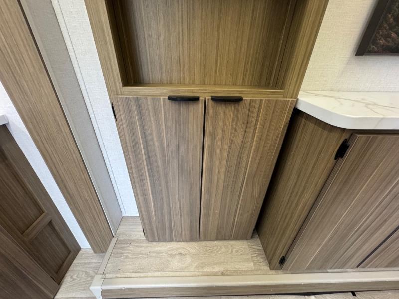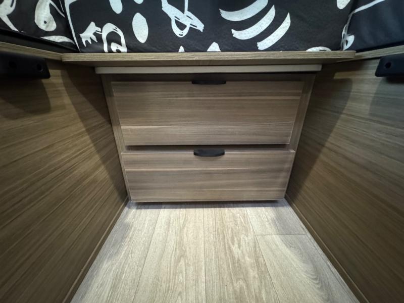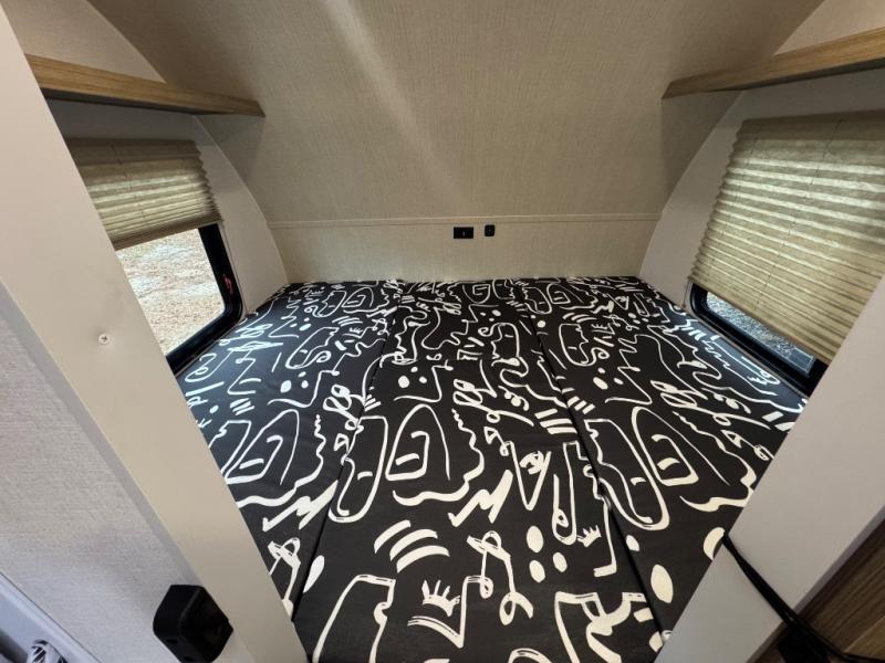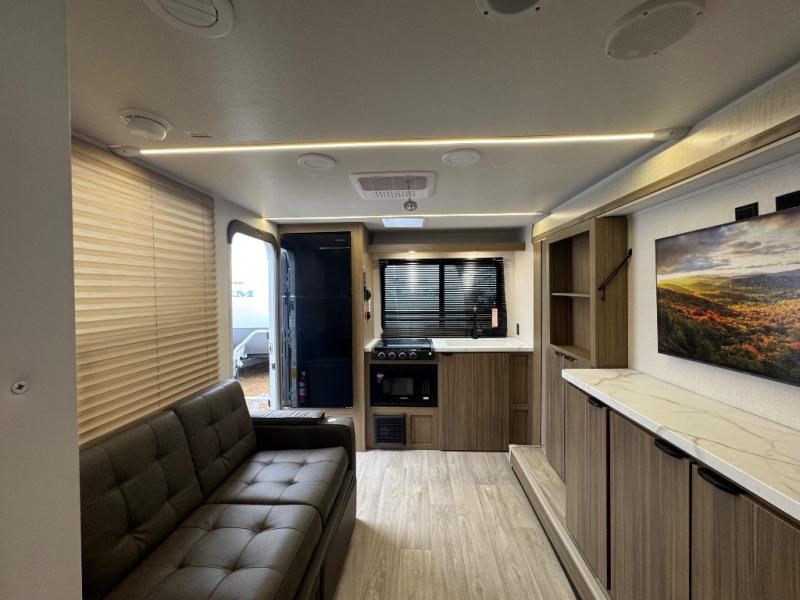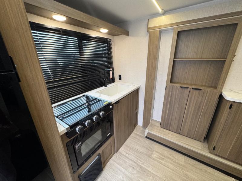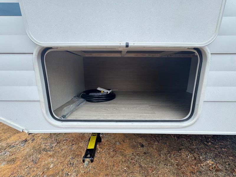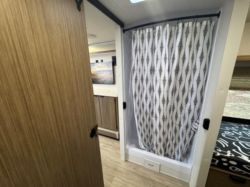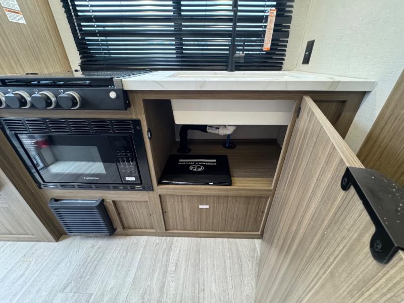 You'll love this versatile and spacious travel trailer for four to five! The rear kitchen includes a two-burner cooktop and microwave oven to cook meals, plus a 12V refrigerator for food storage. There is also a spice rack door that opens up to the hidden split bunk bed the little ones are sure to love. After a day outdoors, you can freshen up in the walk-thru bath, then relax on the sofa across from the entertainment center. A front bedroom includes twin beds, or you can convert them to a king-size bed depending on your needs!