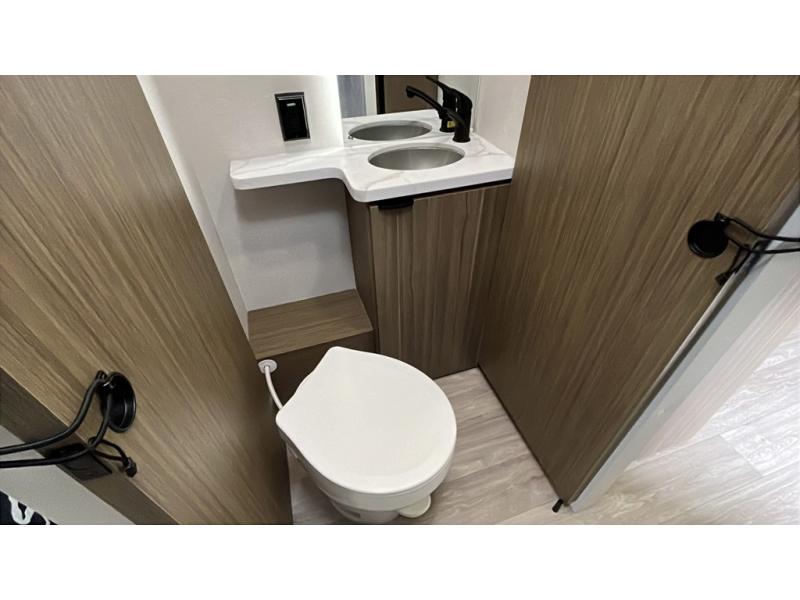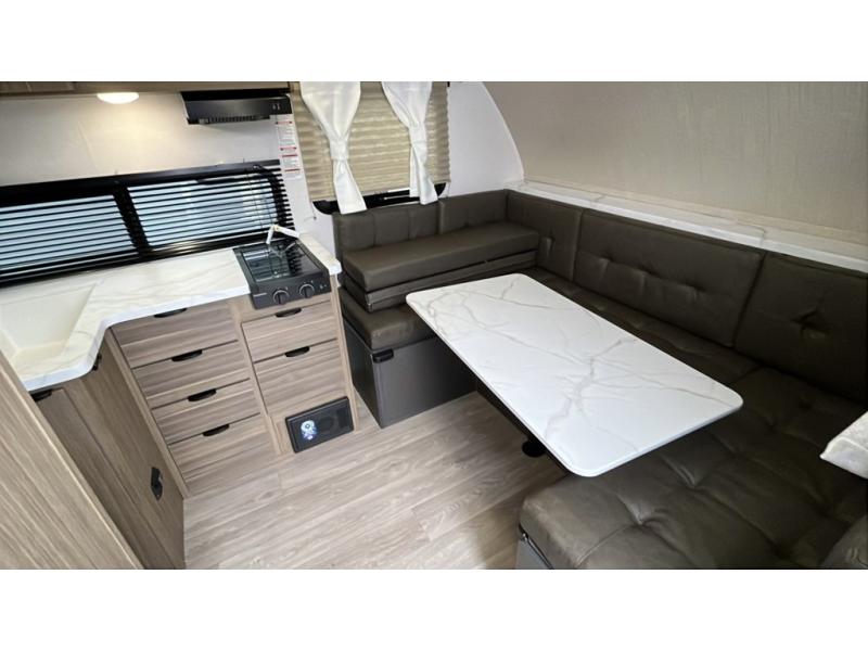 This travel trailer is perfect for couples who want to explore the great outdoors together! There is a rear private bedroom with a queen bed slide for more interior space, a dresser and wardrobes on either side of it for your clothes. Plus, it enters right into the split style bathroom which will come in handy when one person wants to freshen up in the shower while another uses the private toilet and sink. You can prepare your best home cooked meals with the two-burner cooktop then enjoy it at the front U-shaped dinette which can also transform into an extra sleeping space. Enjoy making pancakes on the outdoor kitchen under the 15' power awning!