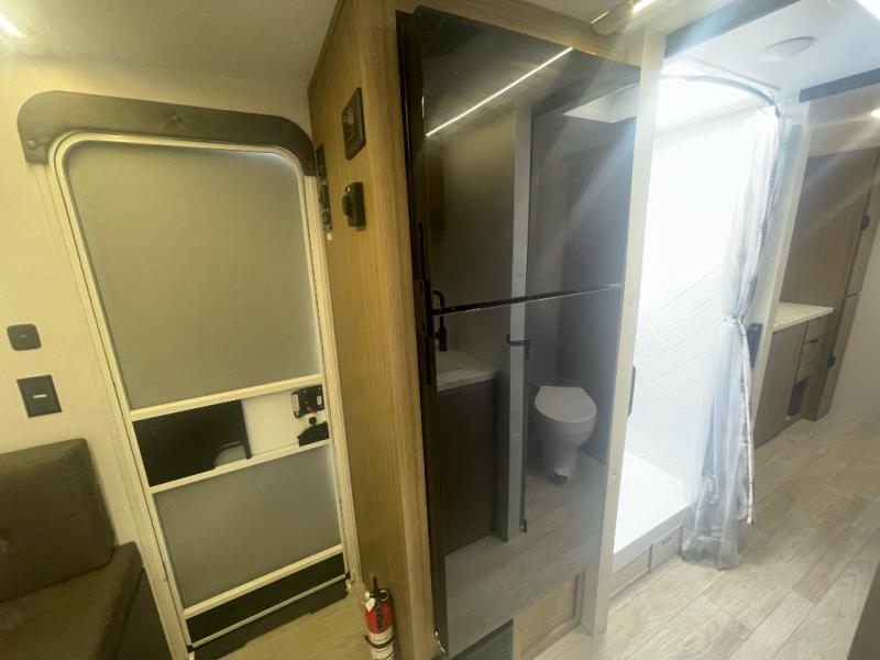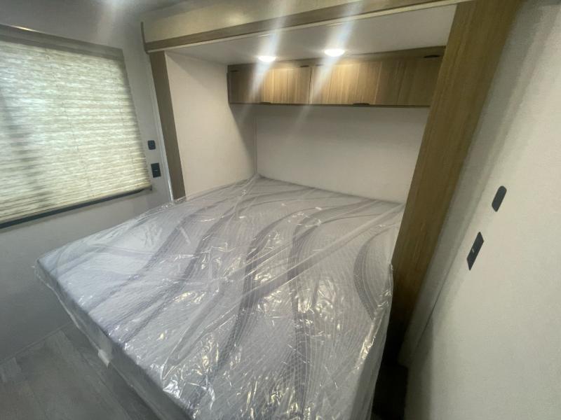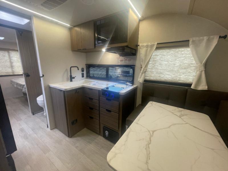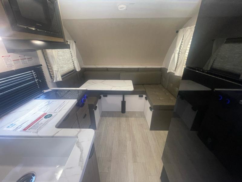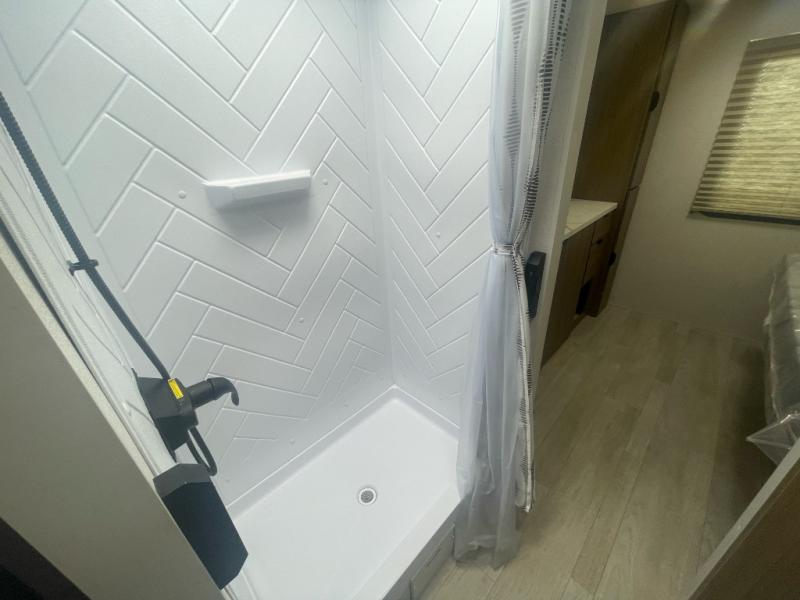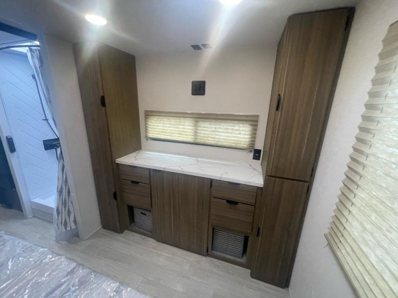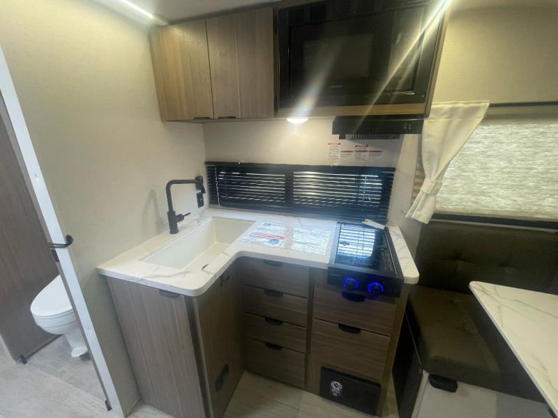 This travel trailer is perfect for couples who want to explore the great outdoors together! There is a rear private bedroom with a queen bed slide for more interior space, a dresser and wardrobes on either side of it for your clothes. Plus, it enters right into the split style bathroom which will come in handy when one person wants to freshen up in the shower while another uses the private toilet and sink. You can prepare your best home cooked meals with the two burner cooktop then enjoy it at the front U-shaped dinette which can also transform into an extra sleeping space. Enjoy making pancakes on the outdoor kitchen under the 15' power awning!