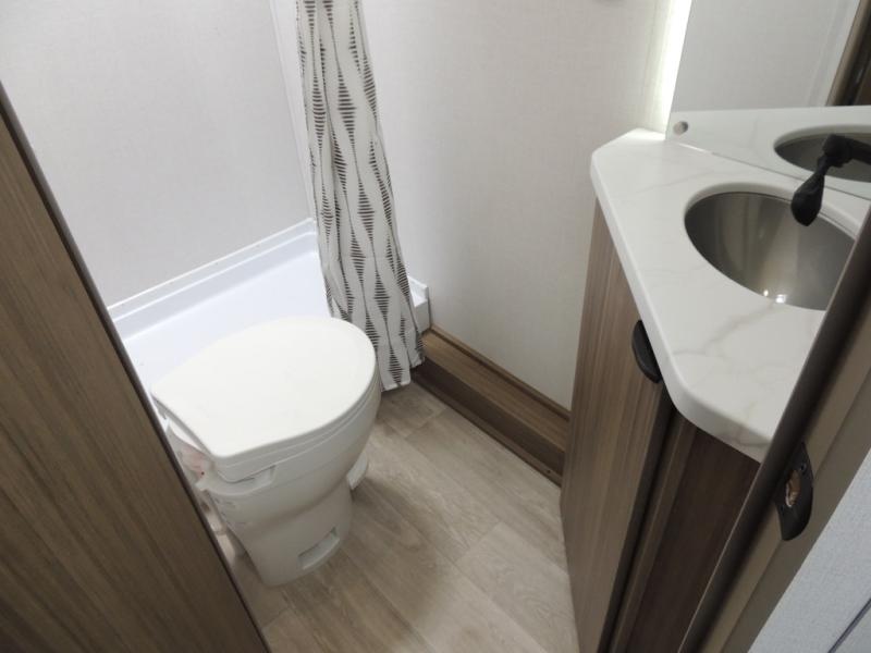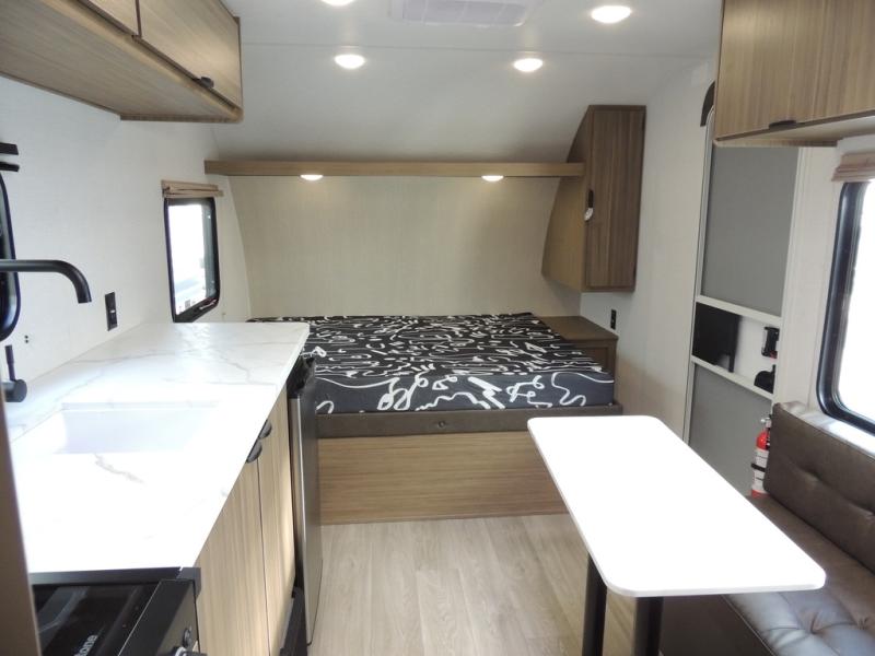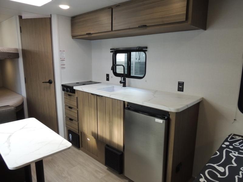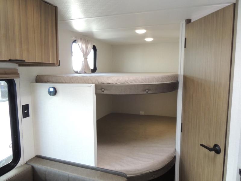 Camping is made easy in this Limited Edition Value trailer that can sleep five to six each night thanks to the bunk beds, front queen bed, and sofa! There is a private shower and toilet so you can freshen up each day, and a kitchen with a two burner cooktop to make meals. You will also find a large baggage door for exterior storage, a powder coated I-beam chassis for durability, plus backup camera prep to make parking easier!