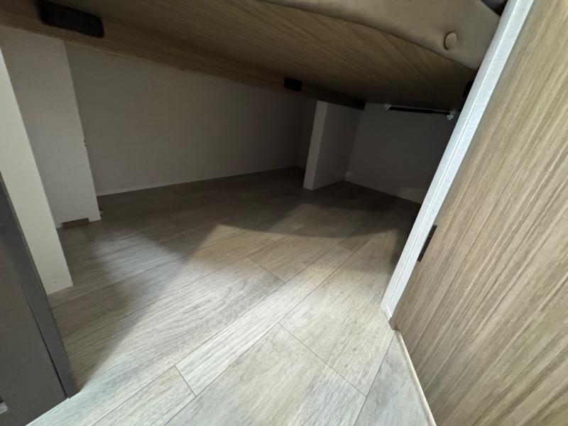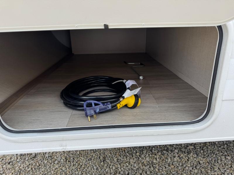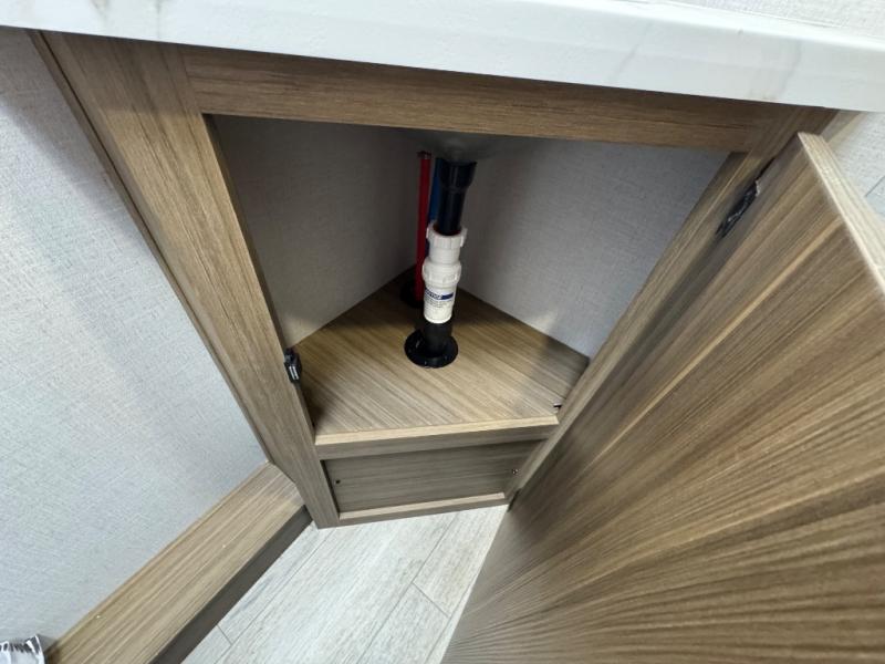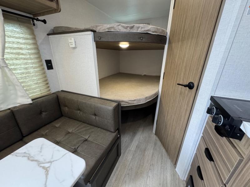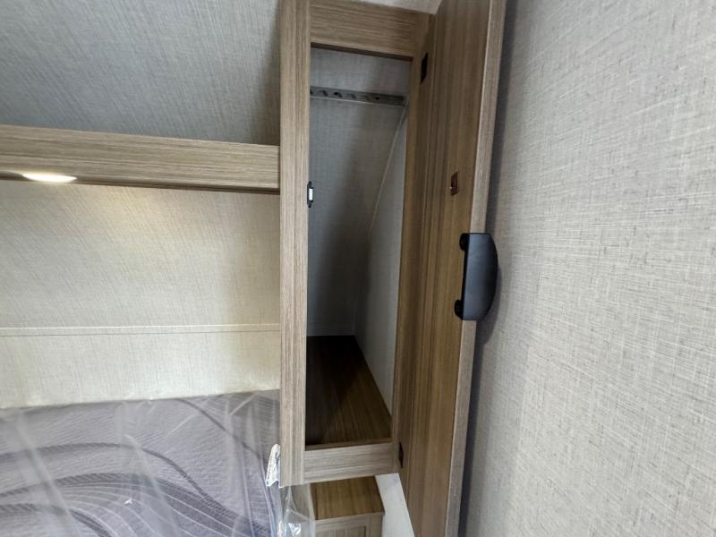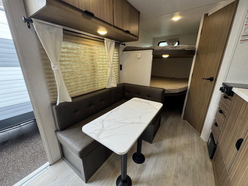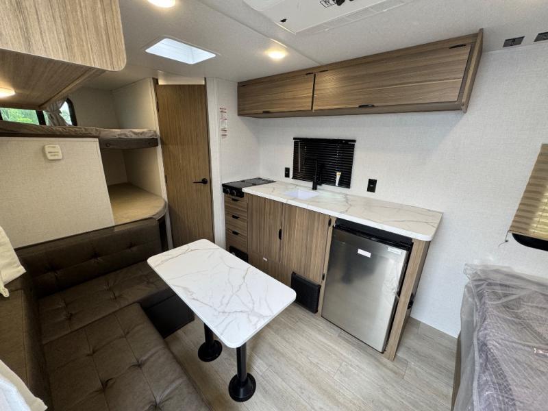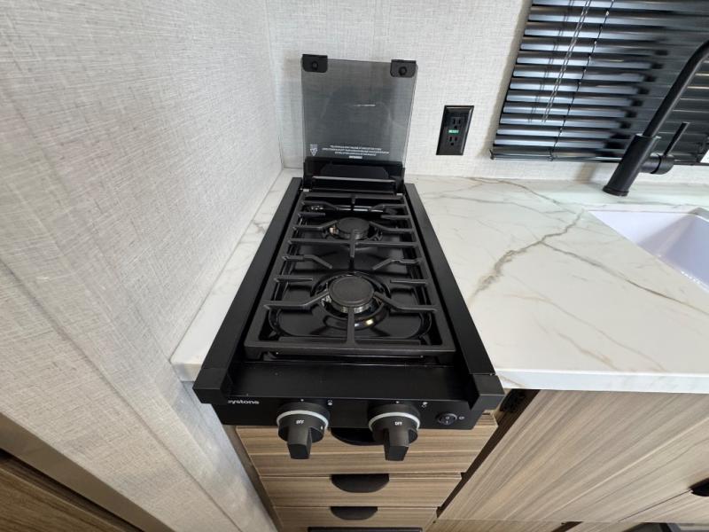 The double-size bunks with storage will be a big selling point in this travel trailer! While your guests take the bunks, you can have the front queen bed all to yourselves, and there is a wardrobe to keep your things organized. A two burner cooktop and microwave will let you make meals each day, and you can dine at the open lounge with a table.