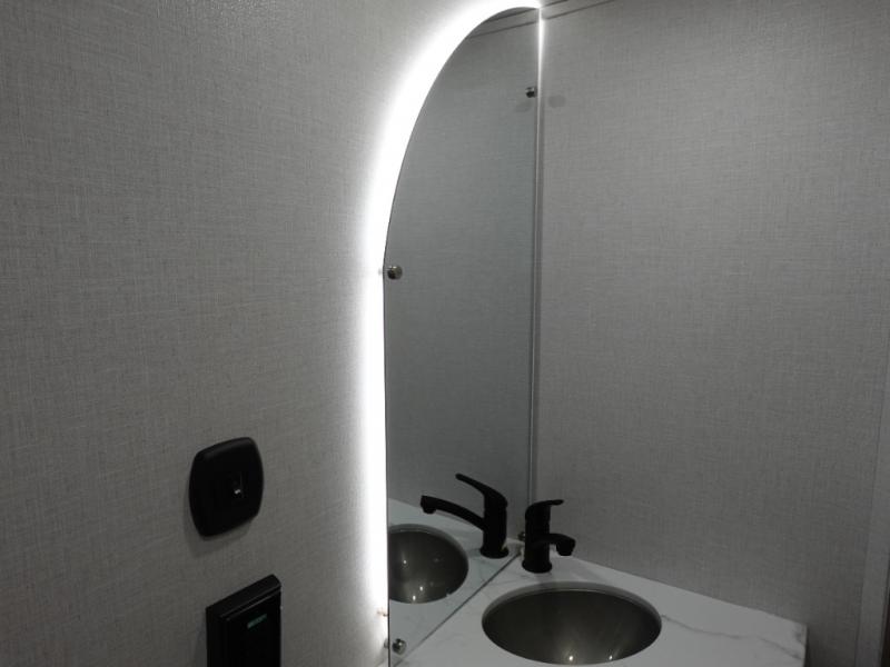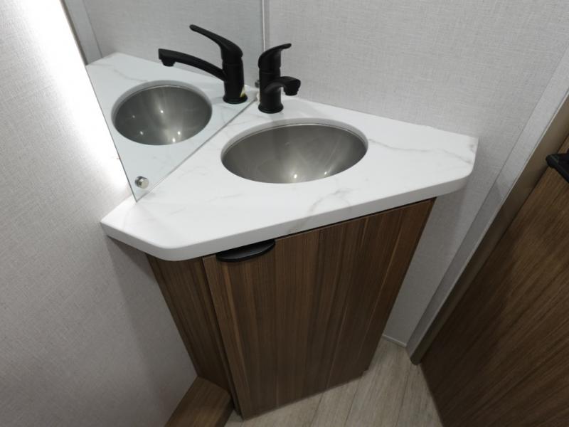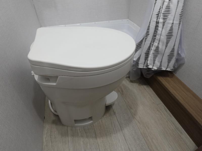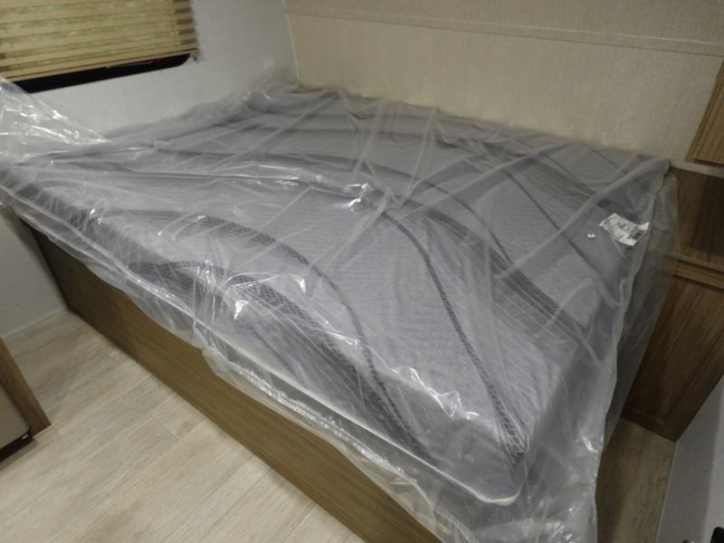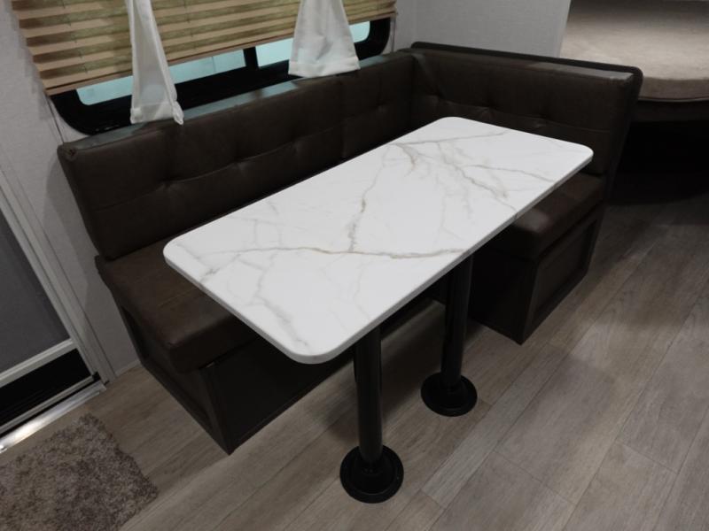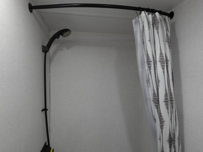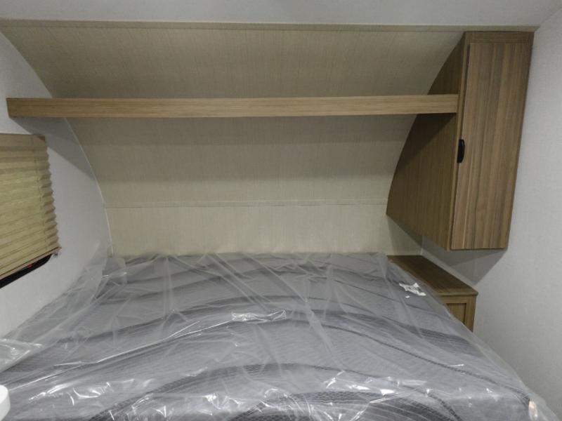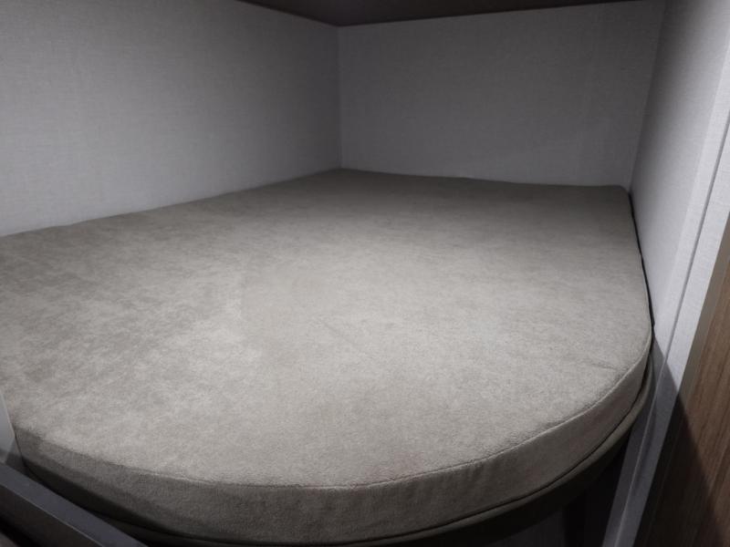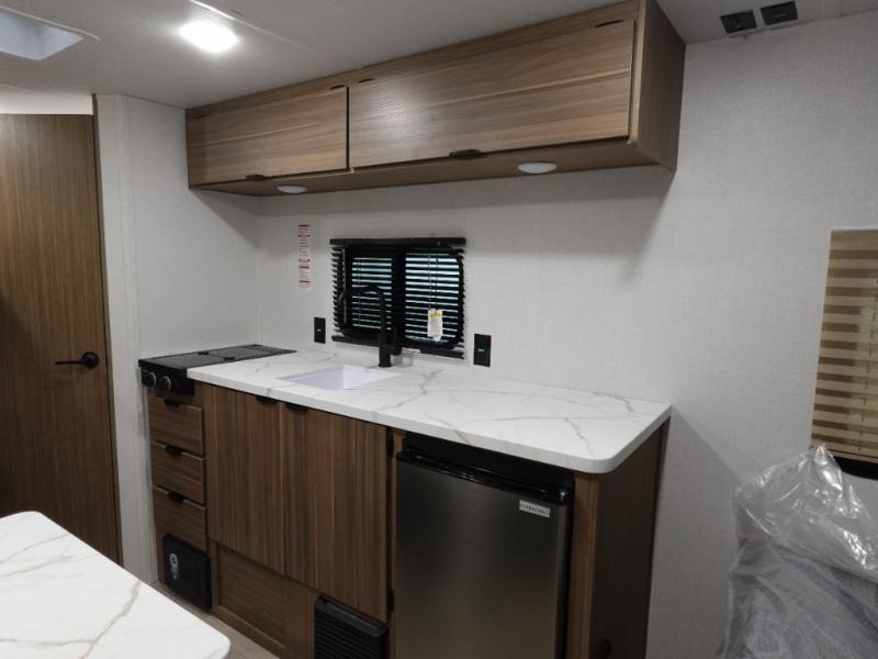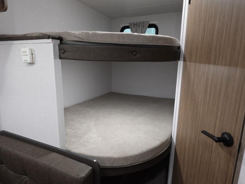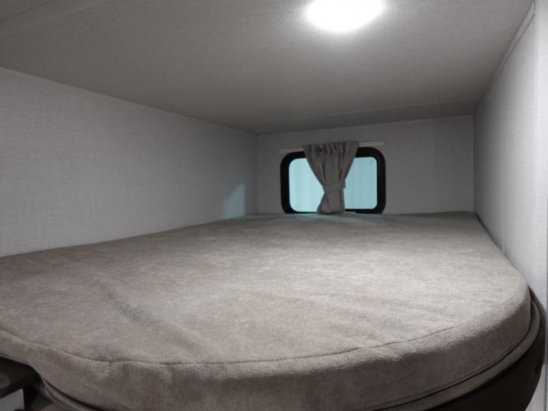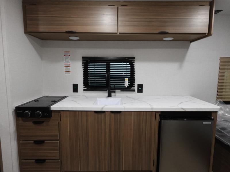 The double-size bunks with storage will be a big selling point in this travel trailer! While your guests take the bunks, you can have the front queen bed all to yourselves, and there is a wardrobe to keep your things organized. A two burner cooktop and microwave will let you make meals each day, and you can dine at the open lounge with a table.