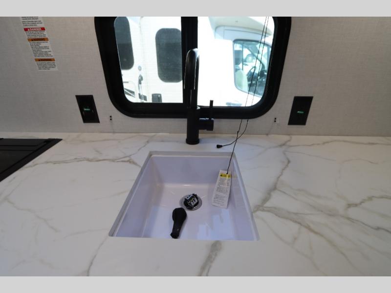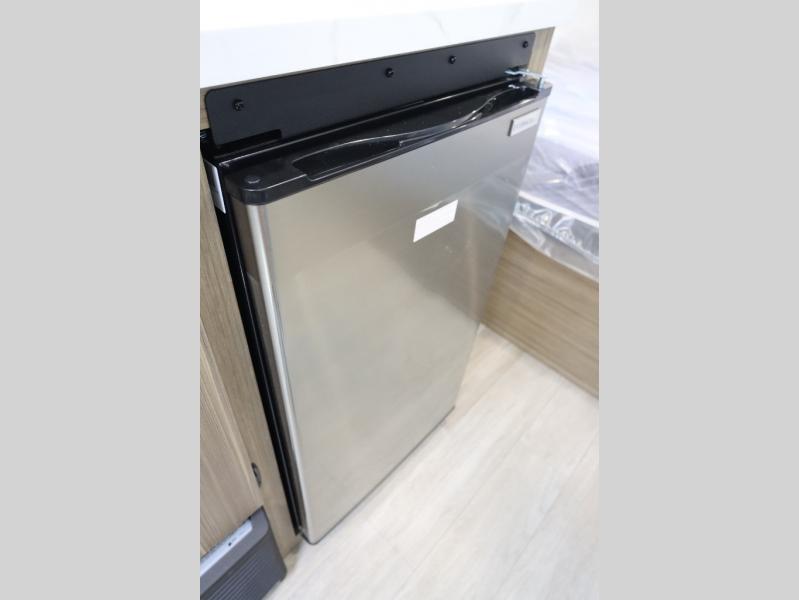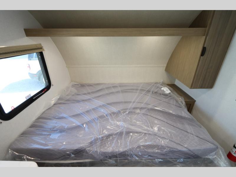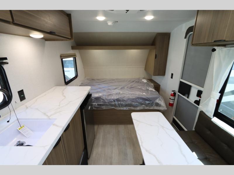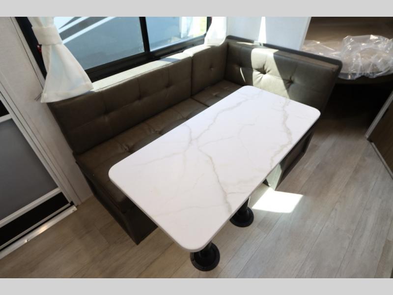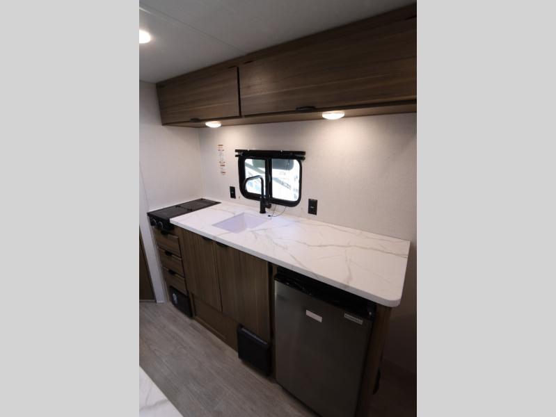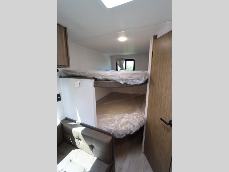 The double-size bunks with storage will be a big selling point in this travel trailer! While your guests take the bunks, you can have the front queen bed all to yourselves, and there is a wardrobe to keep your things organized. A two burner cooktop and microwave will let you make meals each day, and you can dine at the open lounge with a table.