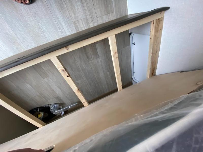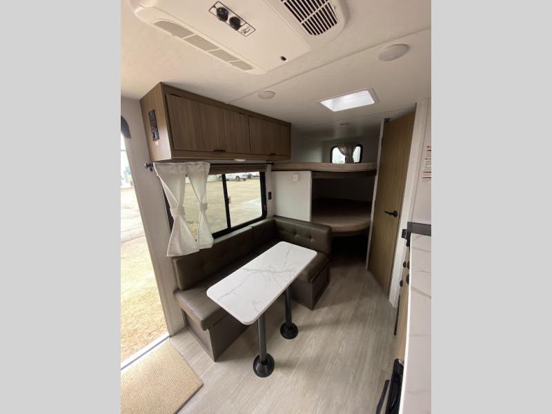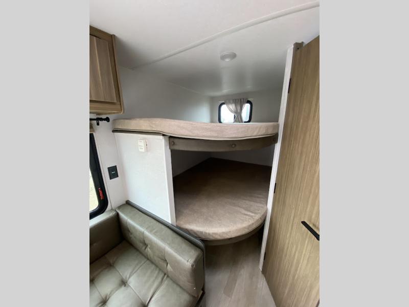 The double-size bunks with storage will be a big selling point in this travel trailer! While your guests take the bunks, you can have the front queen bed all to yourselves, and there is a wardrobe to keep your things organized. A two burner cooktop and microwave will let you make meals each day, and you can dine at the open lounge with a table.