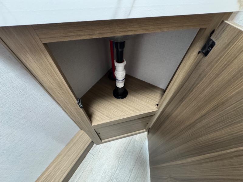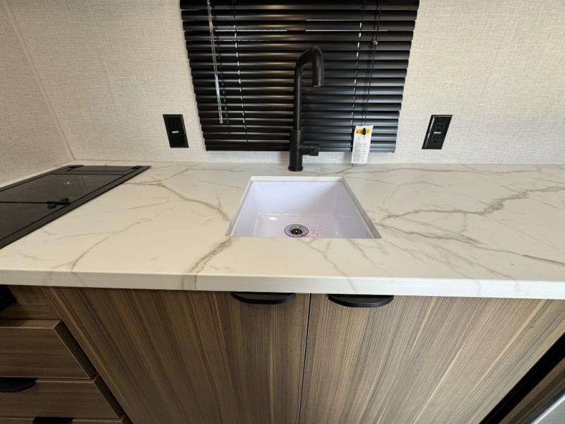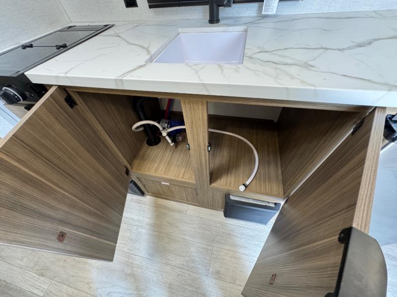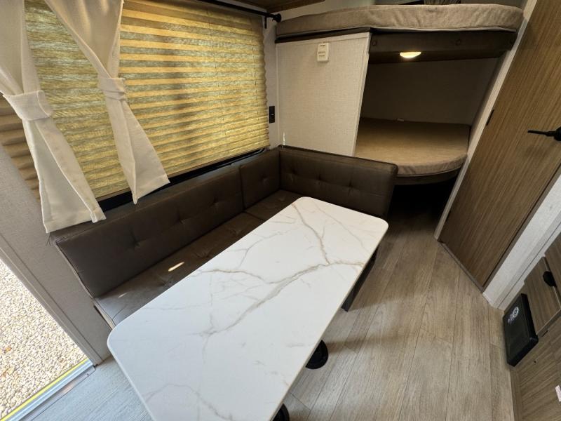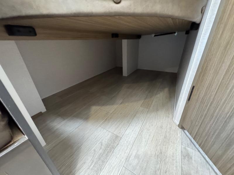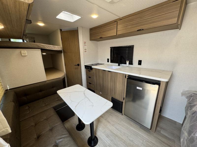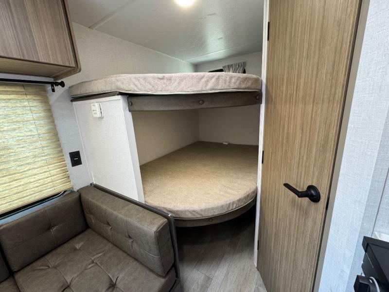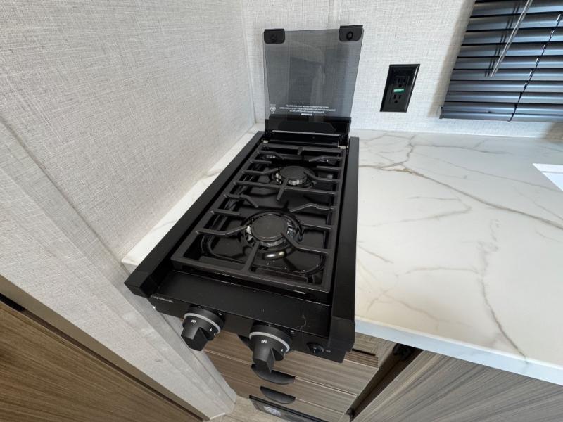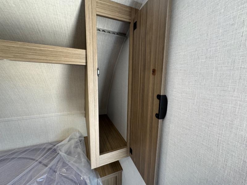 The double-size bunks with storage will be a big selling point in this travel trailer! While your guests take the bunks, you can have the front queen bed all to yourselves, and there is a wardrobe to keep your things organized. A two burner cooktop and microwave will let you make meals each day, and you can dine at the open lounge with a table.