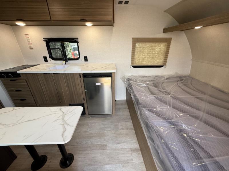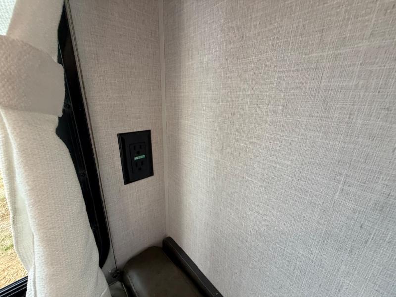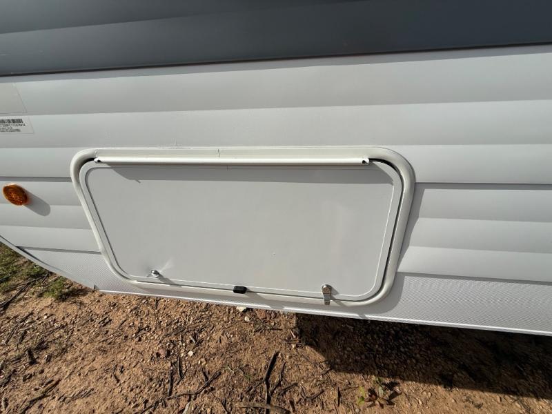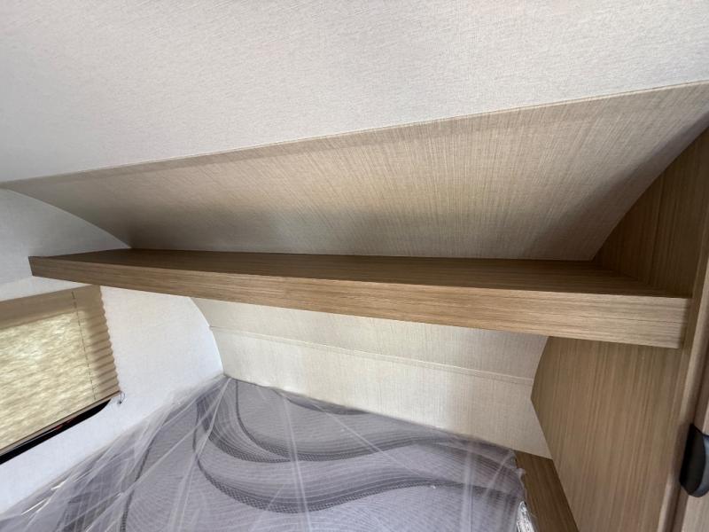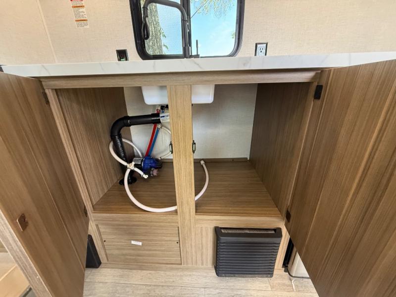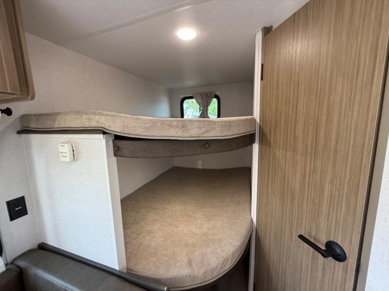 The double-size bunks with storage will be a big selling point in this travel trailer! While your guests take the bunks, you can have the front queen bed all to yourselves, and there is a wardrobe to keep your things organized. A two burner cooktop and microwave will let you make meals each day, and you can dine at the open lounge with a table.