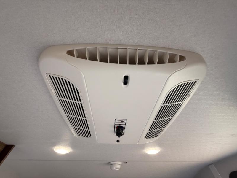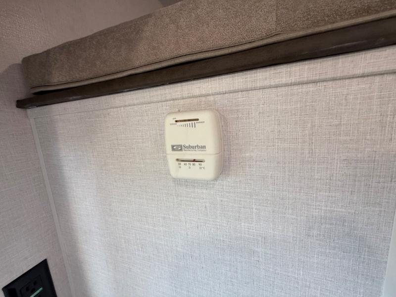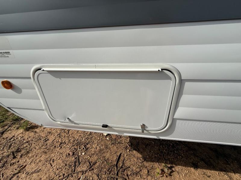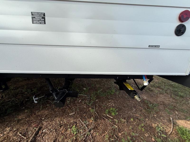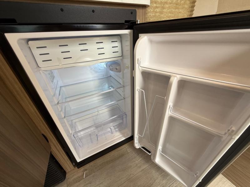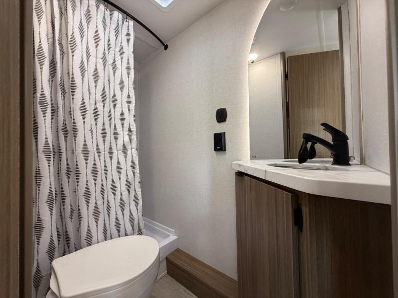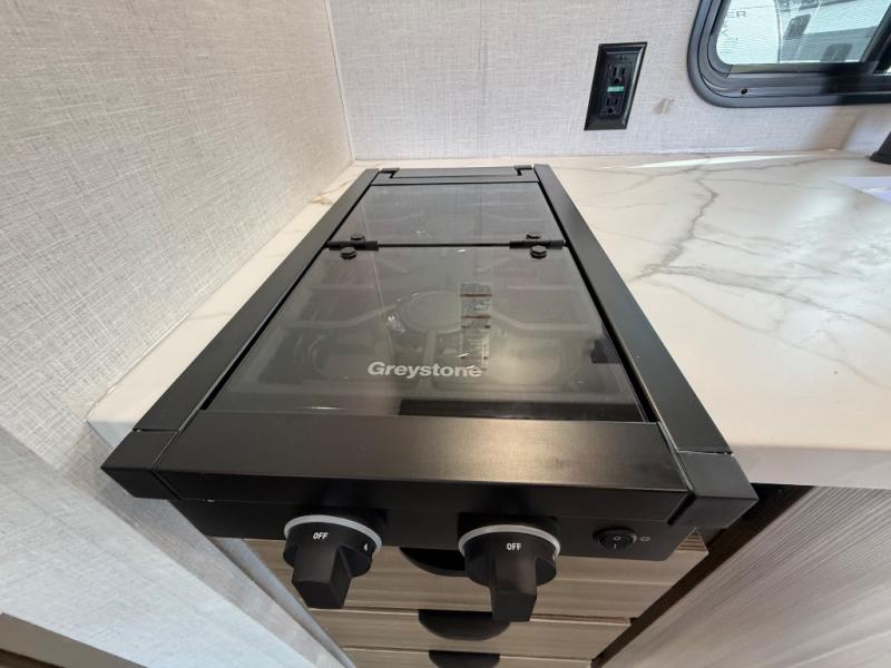 The double-size bunks with storage will be a big selling point in this travel trailer! While your guests take the bunks, you can have the front queen bed all to yourselves, and there is a wardrobe to keep your things organized. A two burner cooktop and microwave will let you make meals each day, and you can dine at the open lounge with a table.