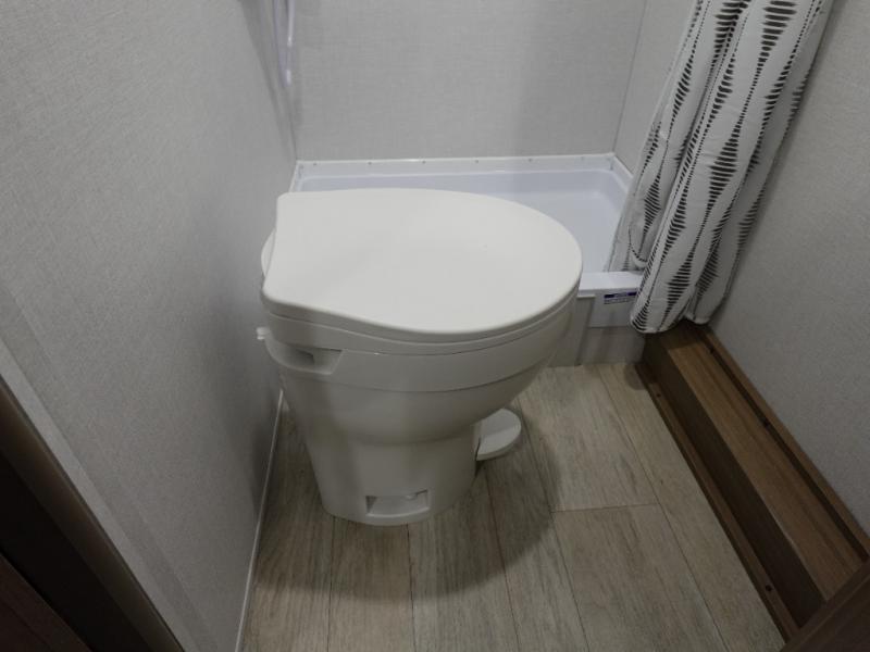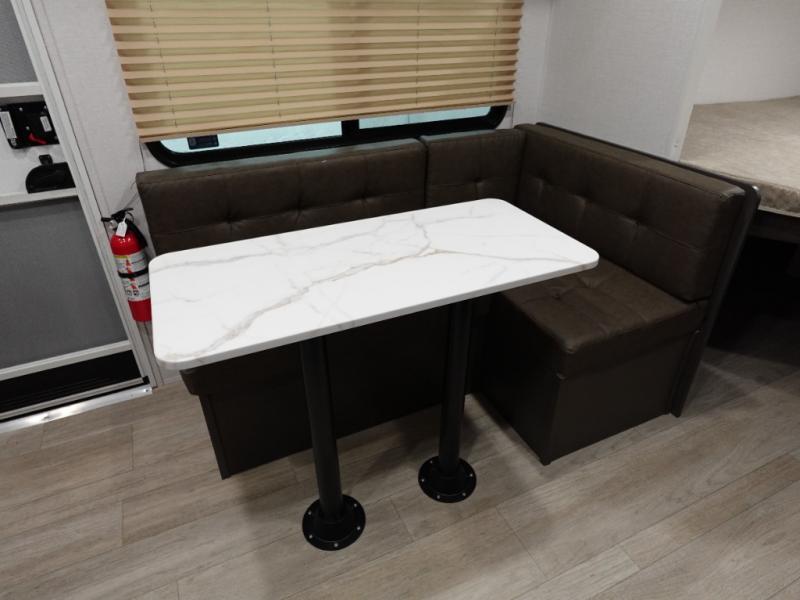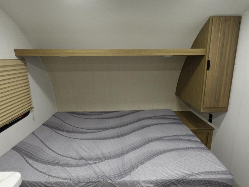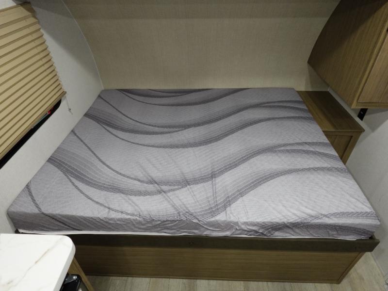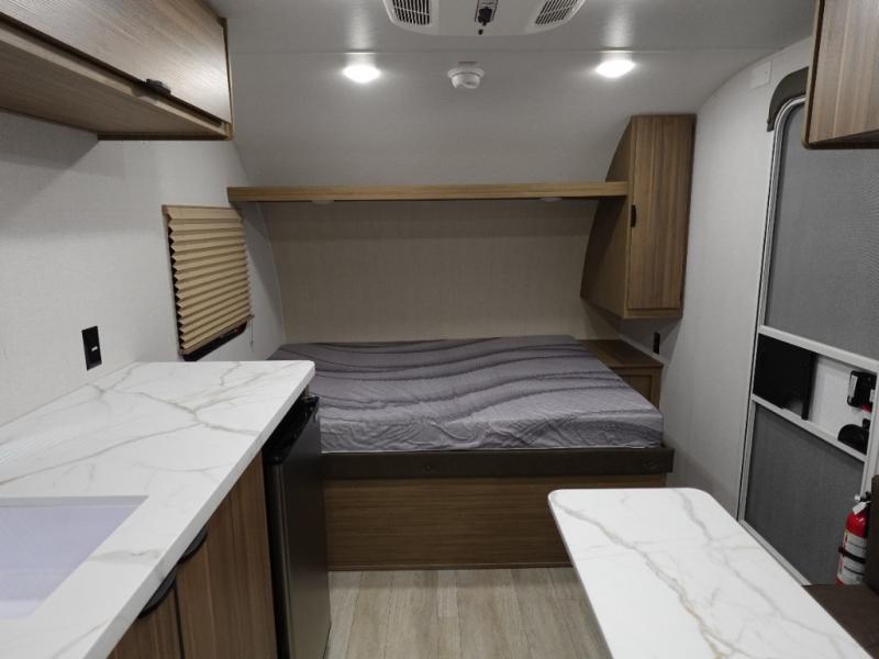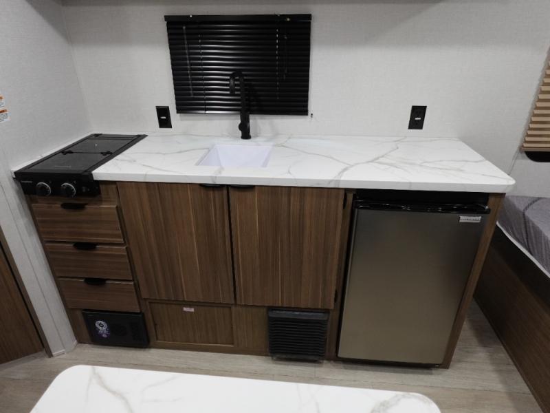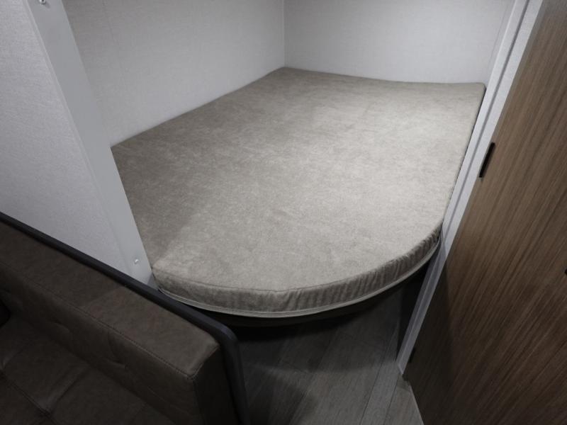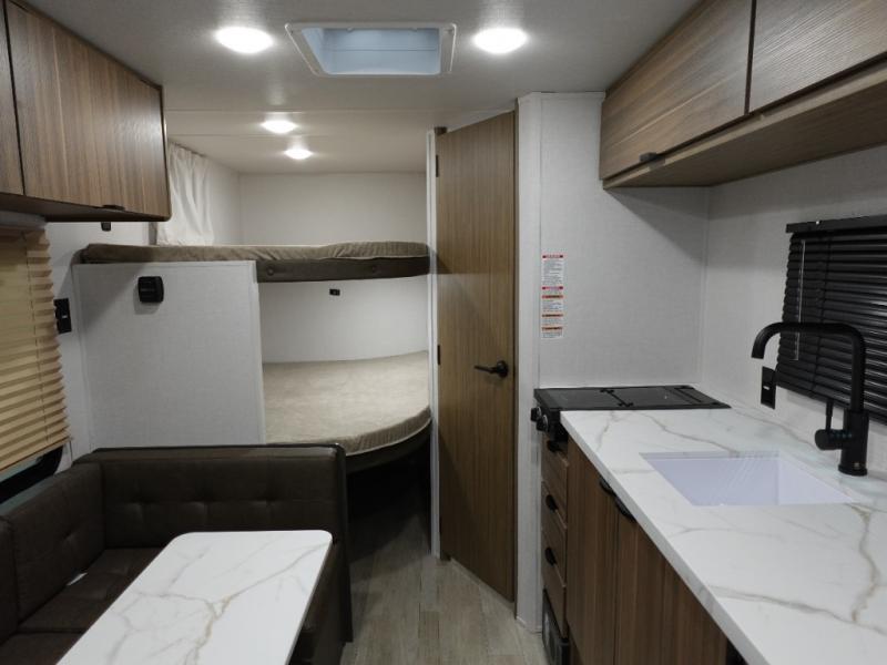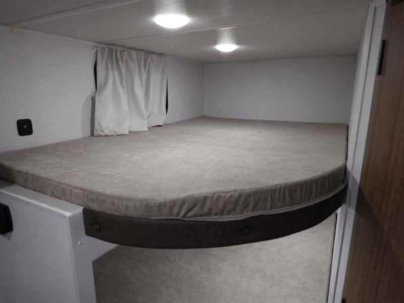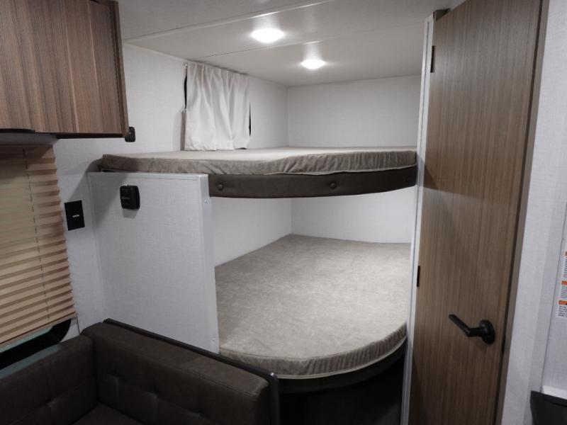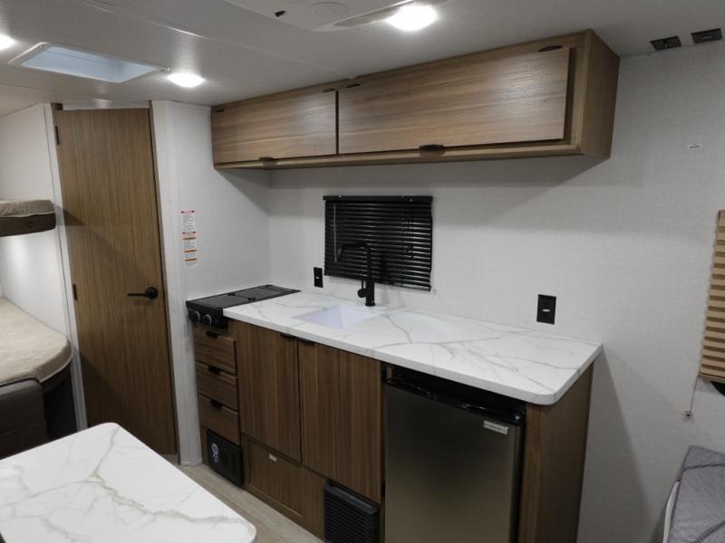 The double-size bunks with storage will be a big selling point in this travel trailer! While your guests take the bunks, you can have the front queen bed all to yourselves, and there is a wardrobe to keep your things organized. A two burner cooktop and microwave will let you make meals each day, and you can dine at the open lounge with a table.