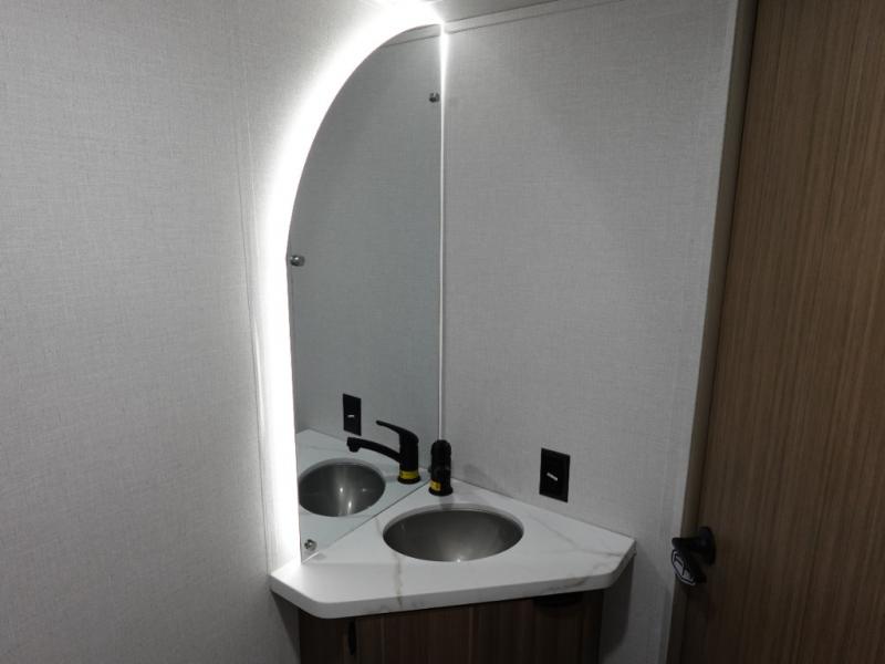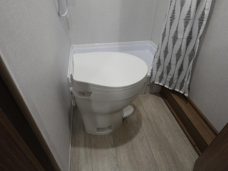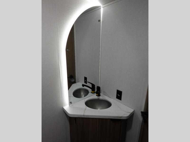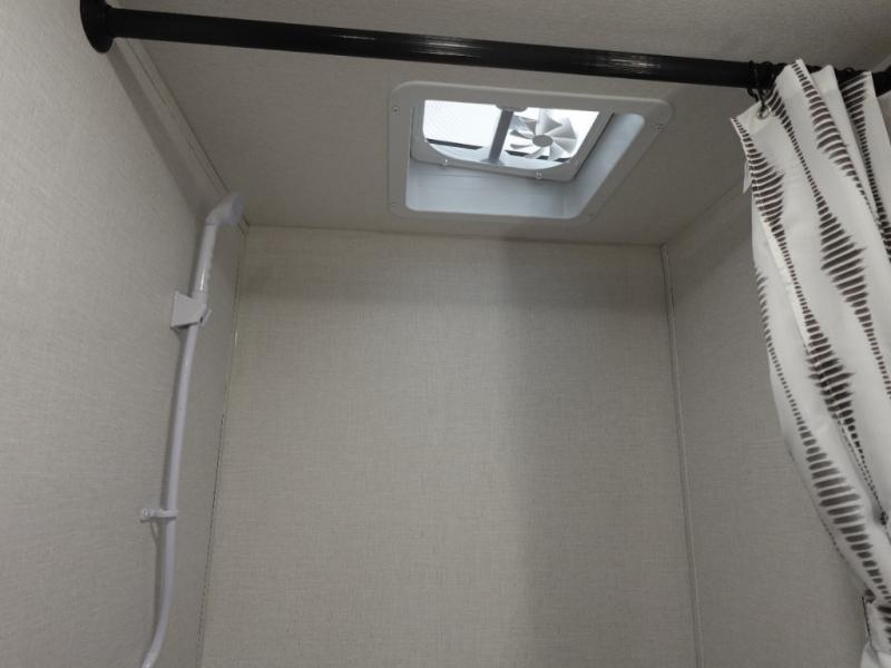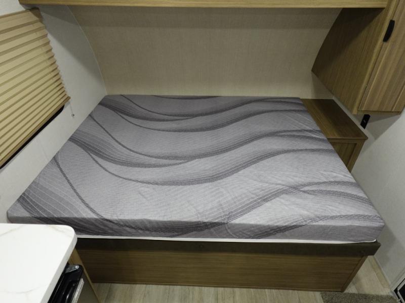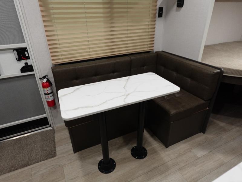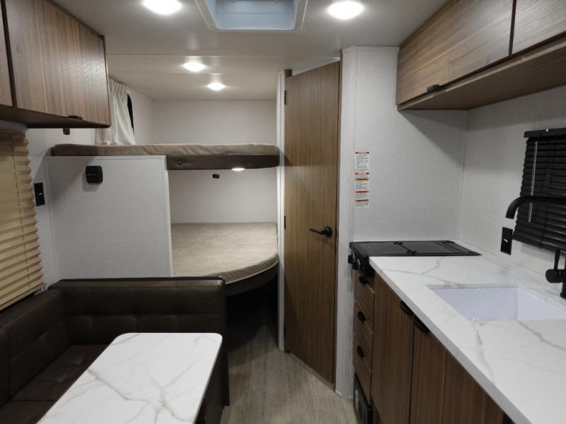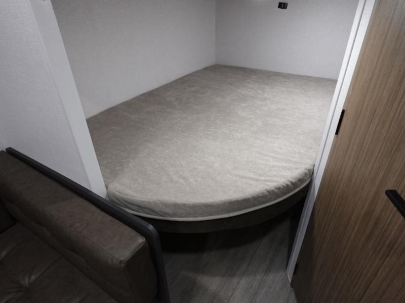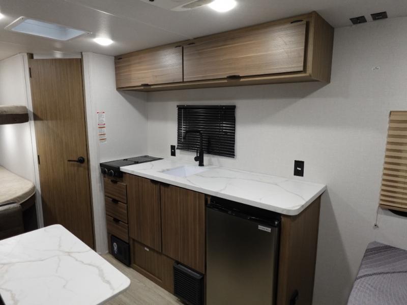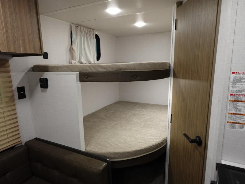 The double-size bunks with storage will be a big selling point in this travel trailer! While your guests take the bunks, you can have the front queen bed all to yourselves, and there is a wardrobe to keep your things organized. A two burner cooktop and microwave will let you make meals each day, and you can dine at the open lounge with a table.