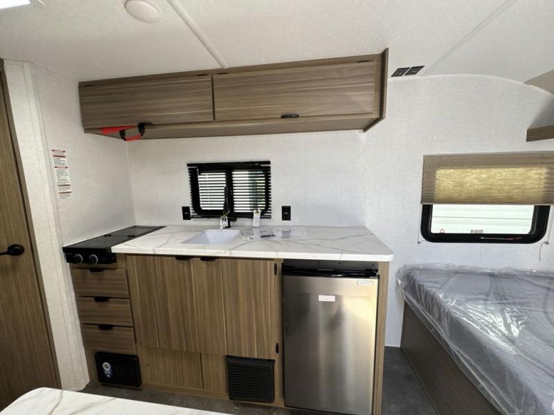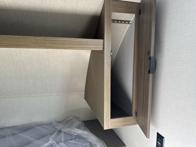 The double-size bunks with storage will be a big selling point in this travel trailer! While your guests take the bunks, you can have the front queen bed all to yourselves, and there is a wardrobe to keep your things organized. A two burner cooktop and microwave will let you make meals each day, and you can dine at the open lounge with a table.