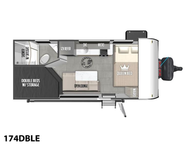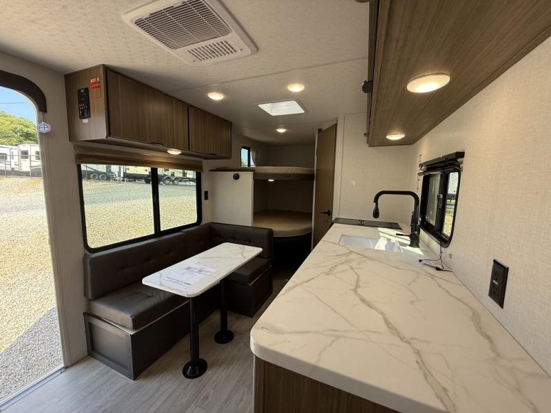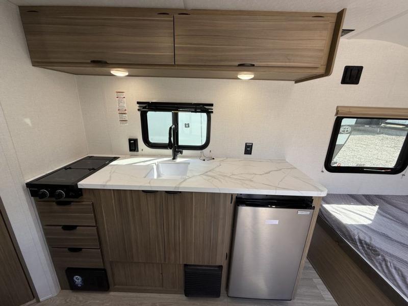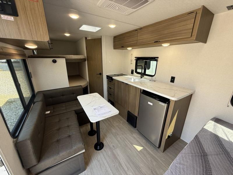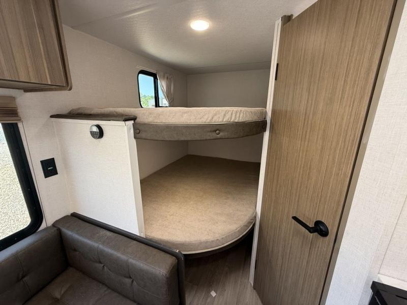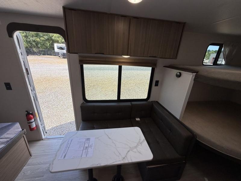The double-size bunks with storage will be a big selling point in this travel trailer! While your guests take the bunks, you can have the front queen bed all to yourselves, and there is a wardrobe to keep your things organized. A two burner cooktop and microwave will let you make meals each day, and you can dine at the open lounge with a table.