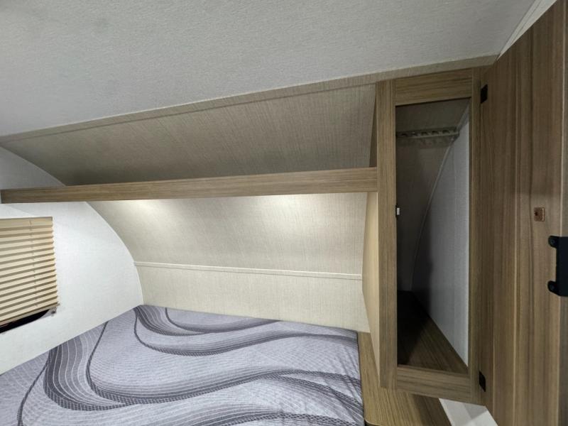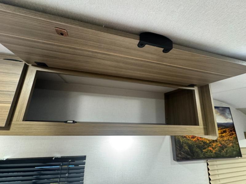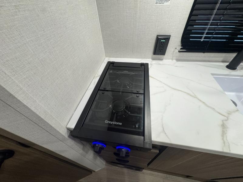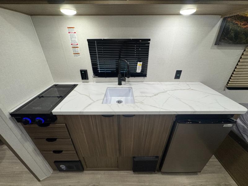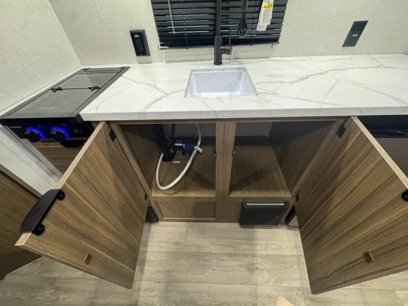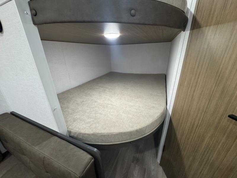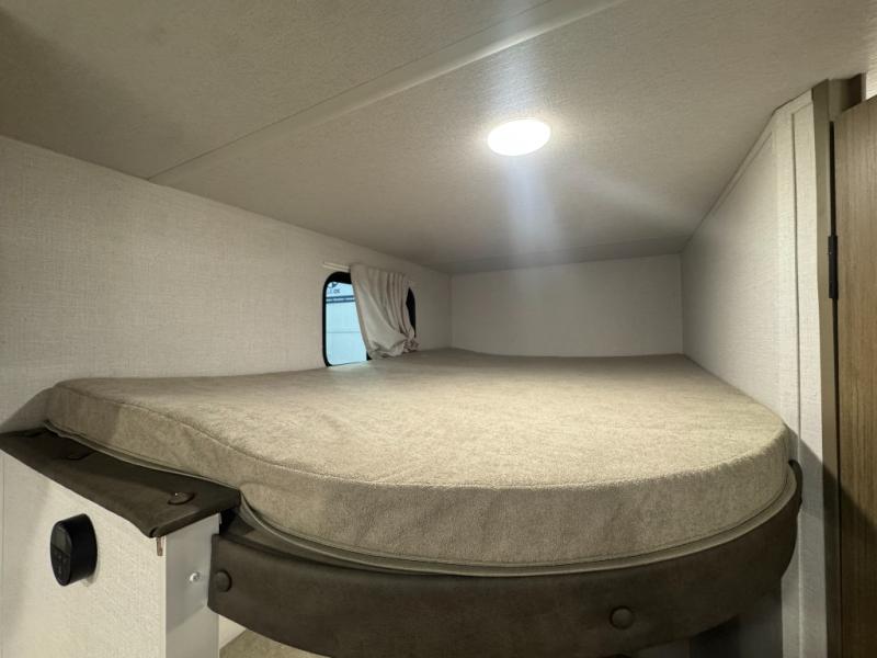 The double-size bunks with storage will be a big selling point in this travel trailer! While your guests take the bunks, you can have the front queen bed all to yourselves, and there is a wardrobe to keep your things organized. A two burner cooktop and microwave will let you make meals each day, and you can dine at the open lounge with a table.