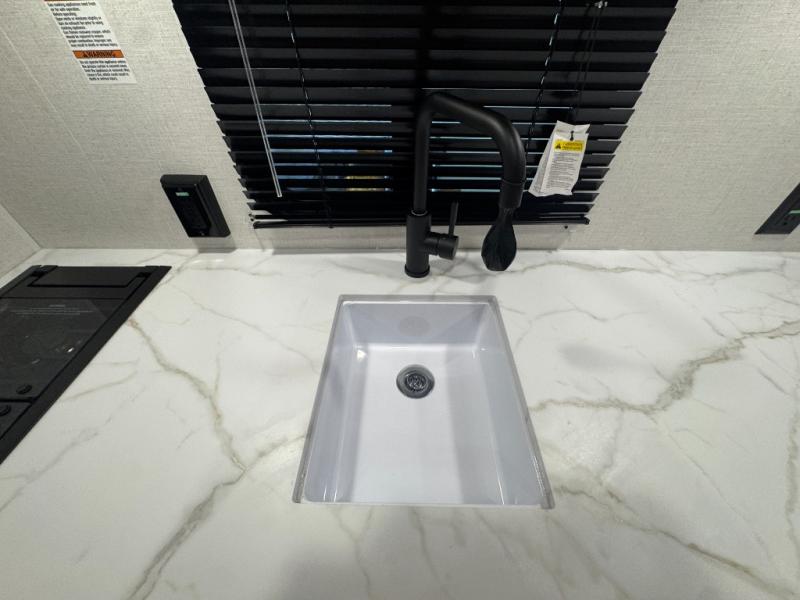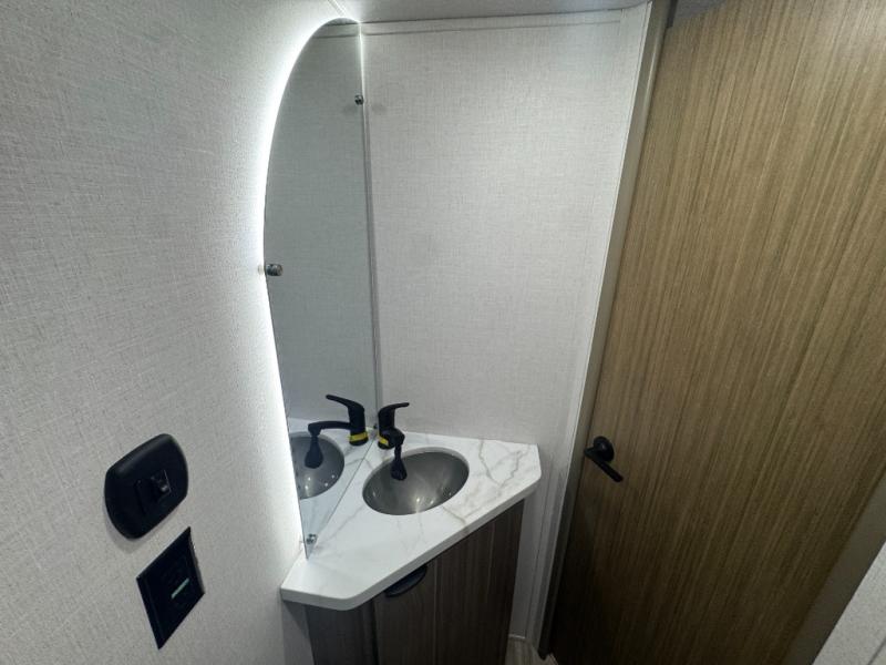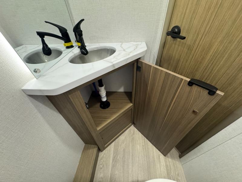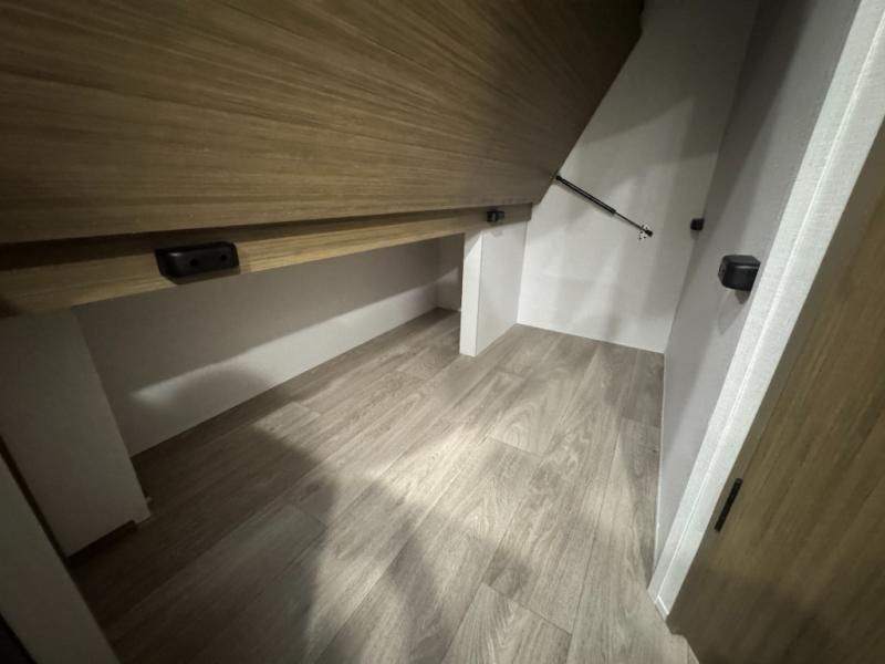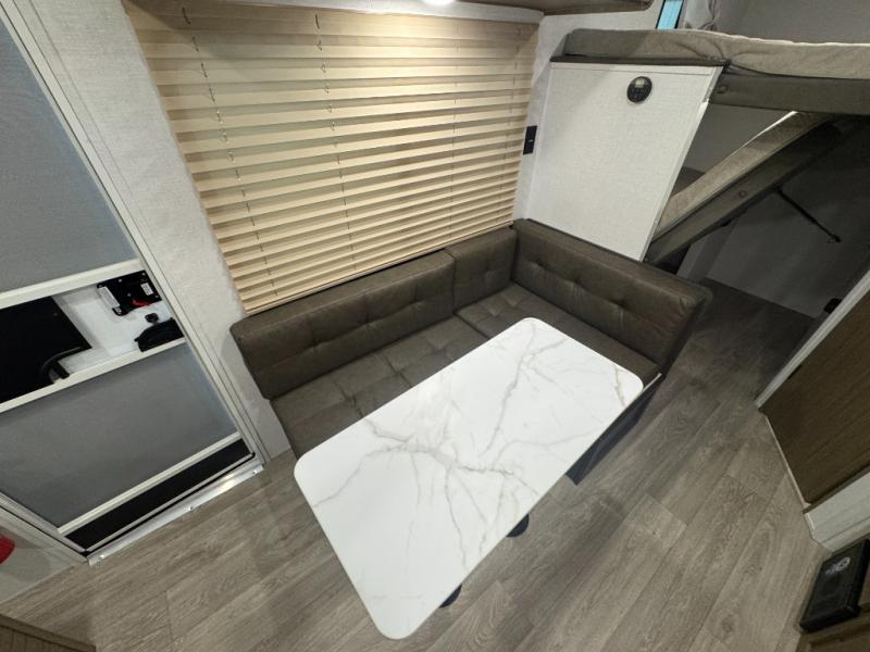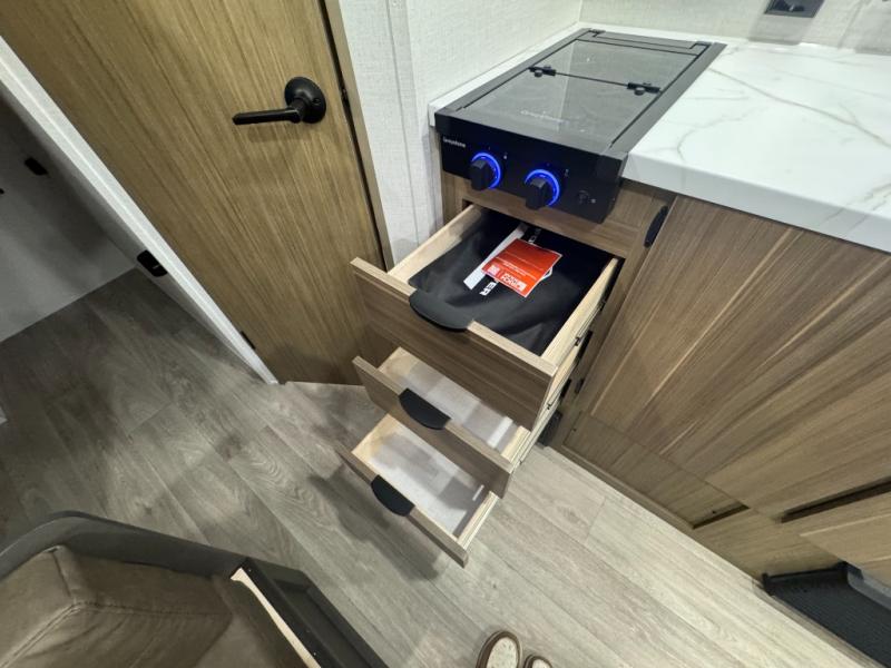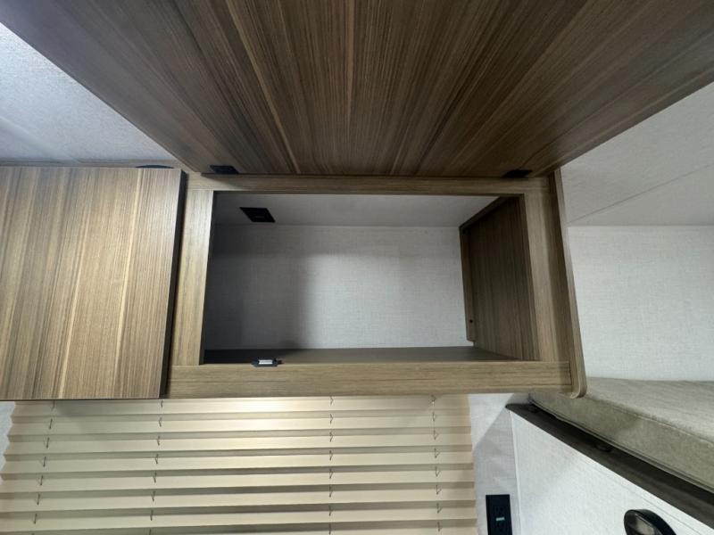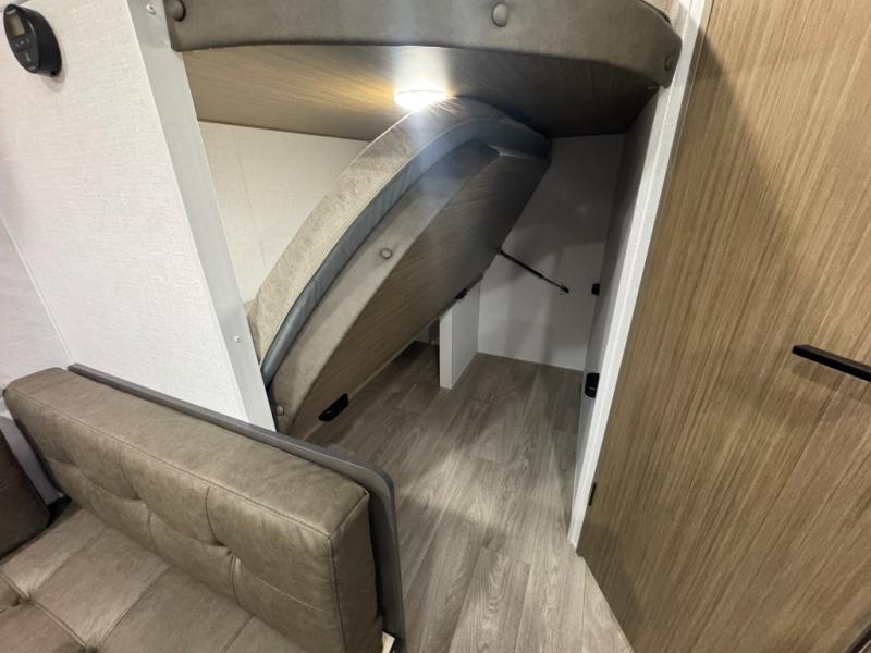 The double-size bunks with storage will be a big selling point in this travel trailer! While your guests take the bunks, you can have the front queen bed all to yourselves, and there is a wardrobe to keep your things organized. A two burner cooktop and microwave will let you make meals each day, and you can dine at the open lounge with a table.