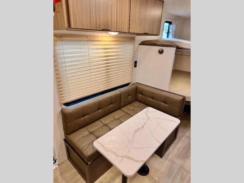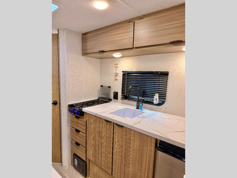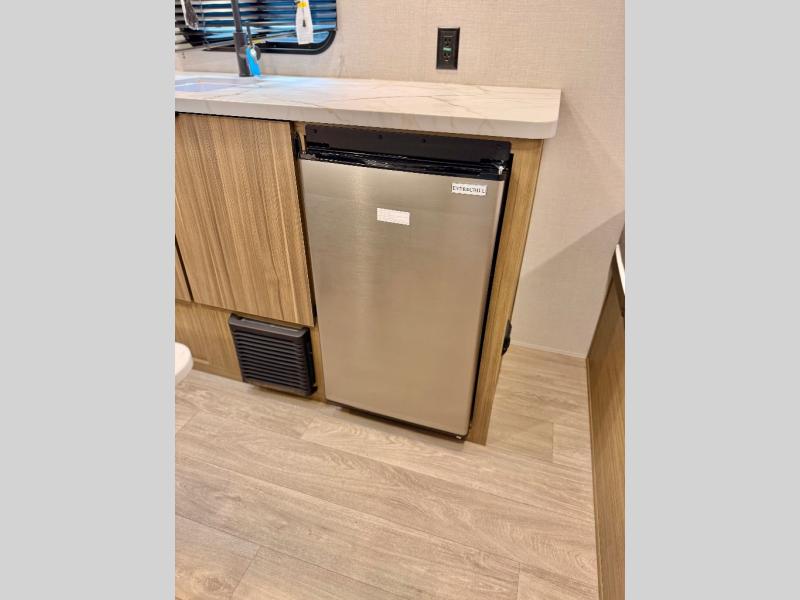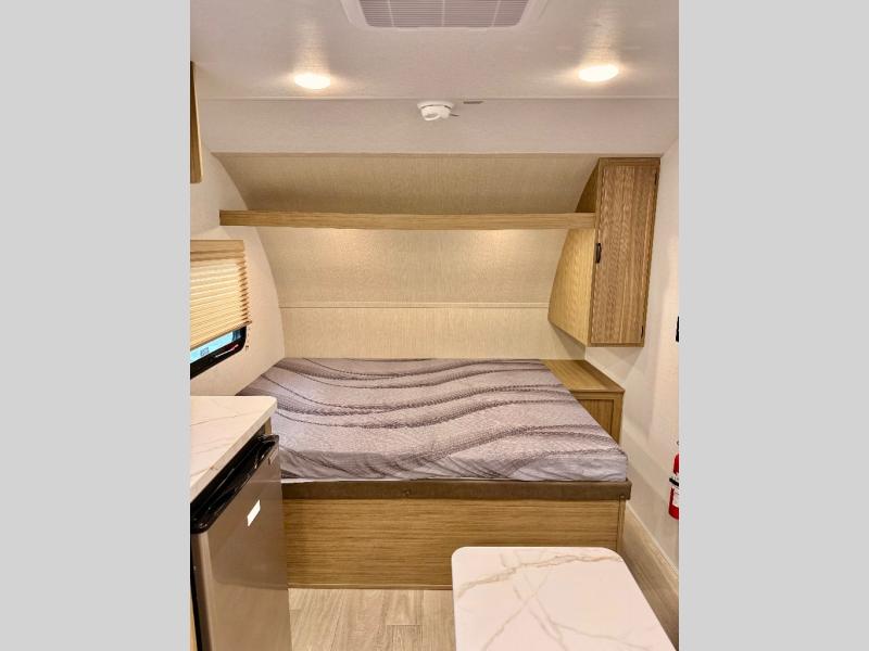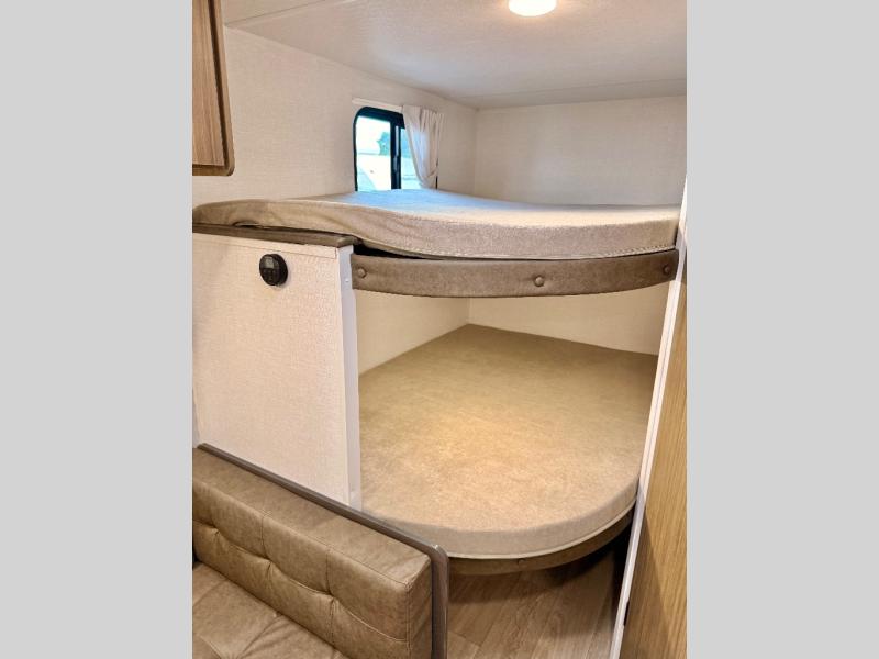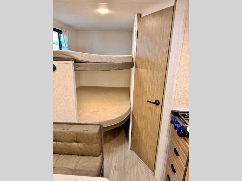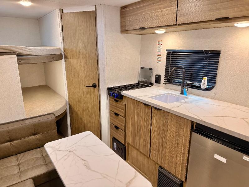 The double-size bunks with storage will be a big selling point in this travel trailer! While your guests take the bunks, you can have the front queen bed all to yourselves, and there is a wardrobe to keep your things organized. A two burner cooktop and microwave will let you make meals each day, and you can dine at the open lounge with a table.