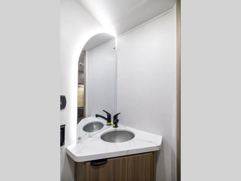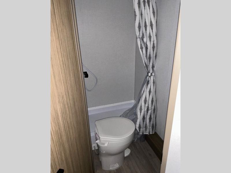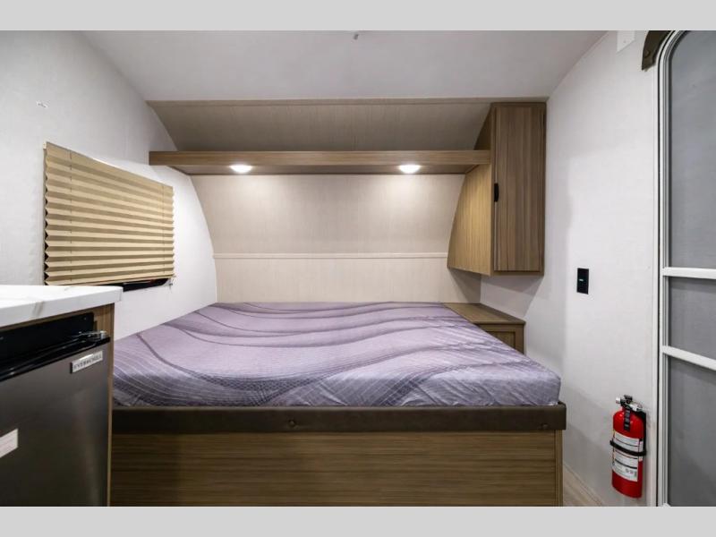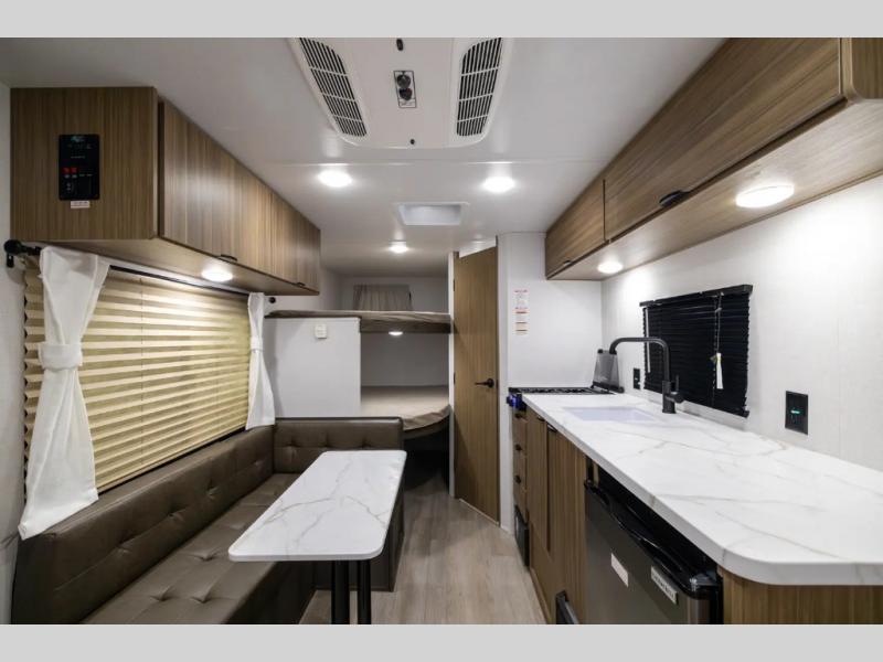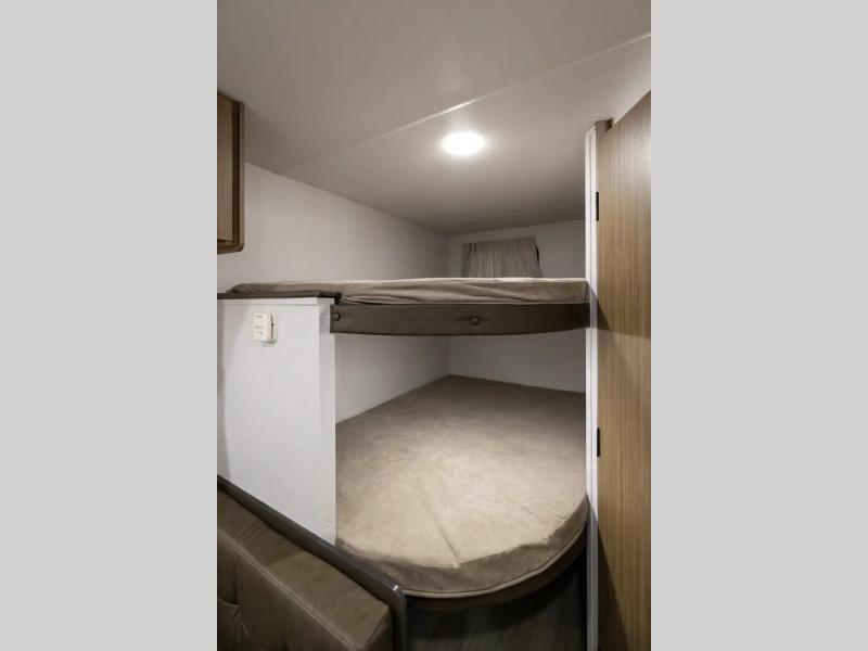 The double-size bunks with storage will be a big selling point in this travel trailer! While your guests take the bunks, you can have the front queen bed all to yourselves, and there is a wardrobe to keep your things organized. A two burner cooktop and microwave will let you make meals each day, and you can dine at the open lounge with a table.