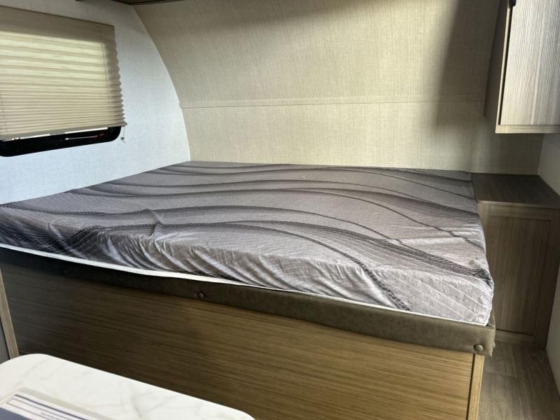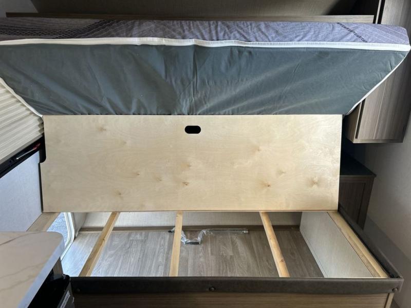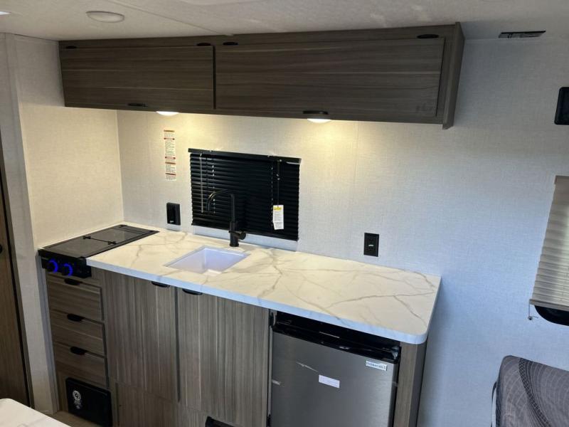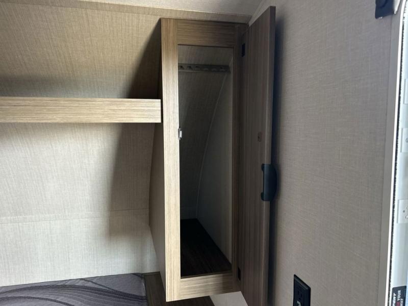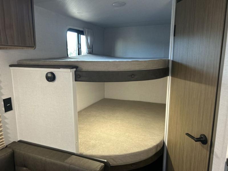 The double-size bunks with storage will be a big selling point in this travel trailer! While your guests take the bunks, you can have the front queen bed all to yourselves, and there is a wardrobe to keep your things organized. A two burner cooktop and microwave will let you make meals each day, and you can dine at the open lounge with a table.