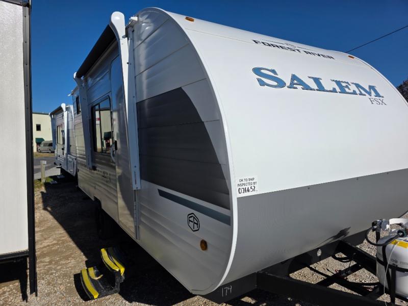The Forest River Salem FSX travel trailers and toy hauler travel trailers are ultra comfortable and lightweight, perfect for first time or seasoned campers alike! You will love how easy it will be to relax with residential features that will make your space feel just like home, and the durable construction means you can enjoy your RV for years to come. There are a wide variety of floorplans to choose from, including couple's trailers, bunk models, and toy haulers, all with full bath and kitchen amenities and plenty of storage for all your gear!
