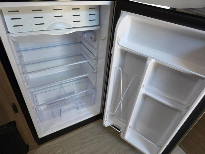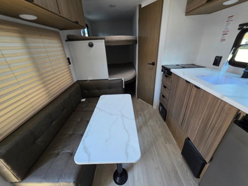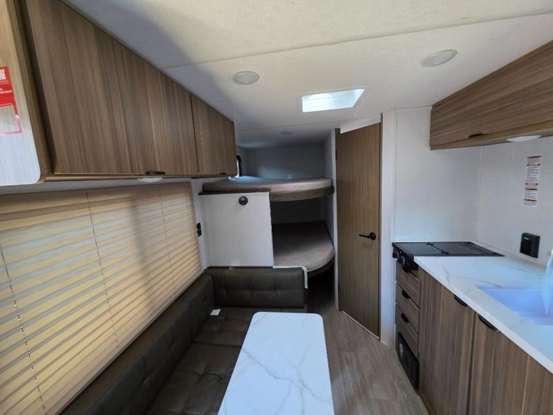 The double-size bunks with storage will be a big selling point in this travel trailer! While your guests take the bunks, you can have the front queen bed all to yourselves, and there is a wardrobe to keep your things organized. A two burner cooktop and microwave will let you make meals each day, and you can dine at the open lounge with a table.