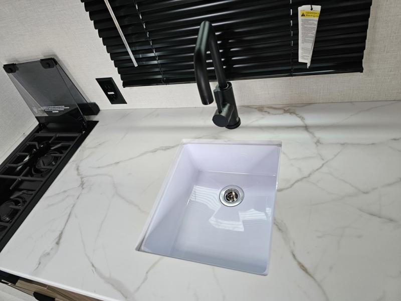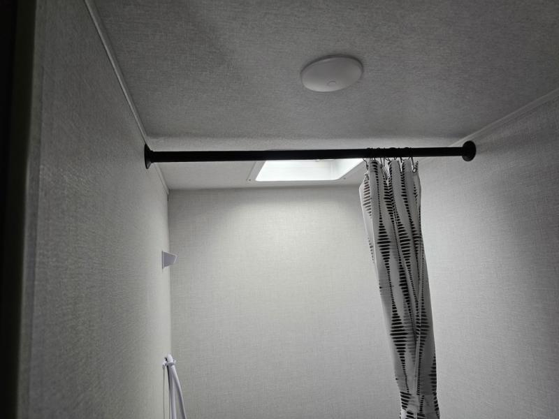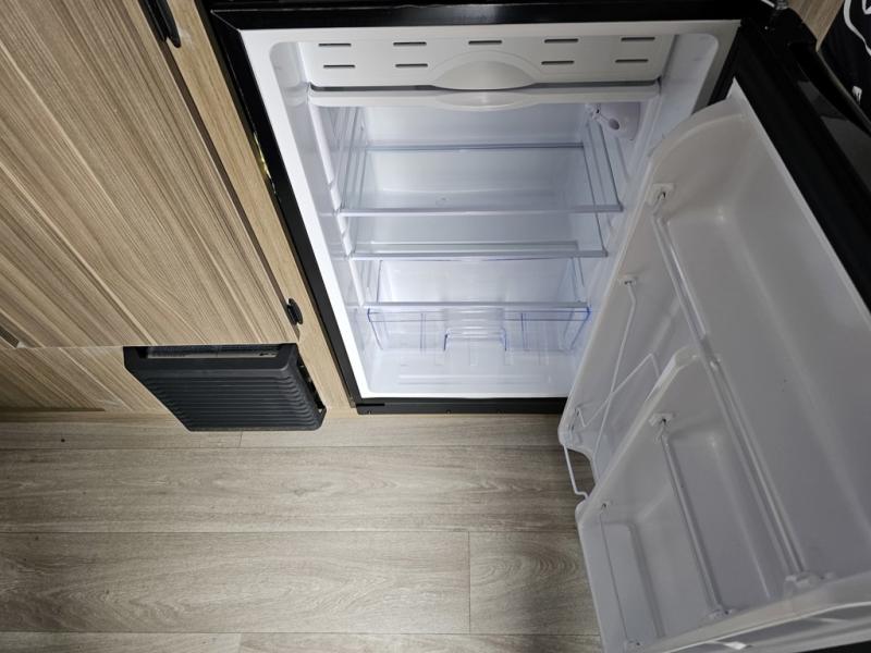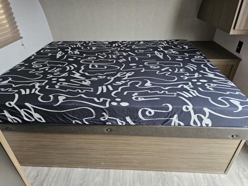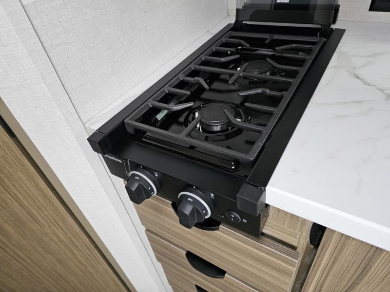 The double-size bunks with storage will be a big selling point in this travel trailer! While your guests take the bunks, you can have the front queen bed all to yourselves, and there is a wardrobe to keep your things organized. A two burner cooktop and microwave will let you make meals each day, and you can dine at the open lounge with a table.