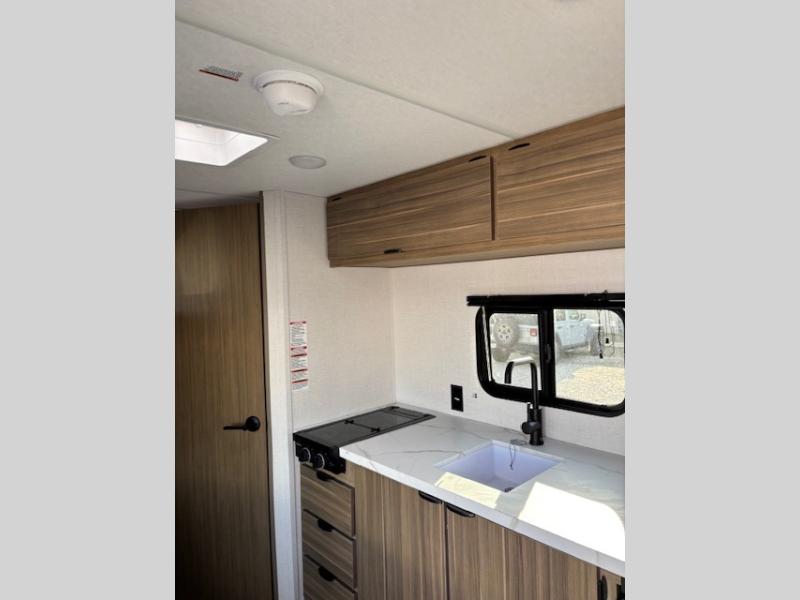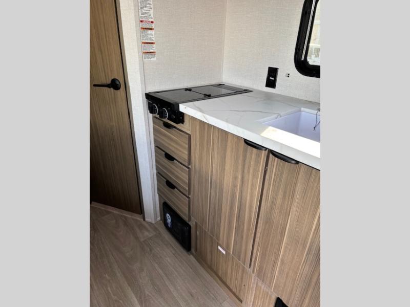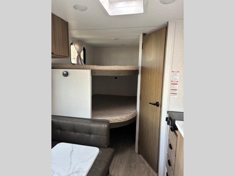 The double-size bunks with storage will be a big selling point in this travel trailer! While your guests take the bunks, you can have the front queen bed all to yourselves, and there is a wardrobe to keep your things organized. A two burner cooktop and microwave will let you make meals each day, and you can dine at the open lounge with a table.