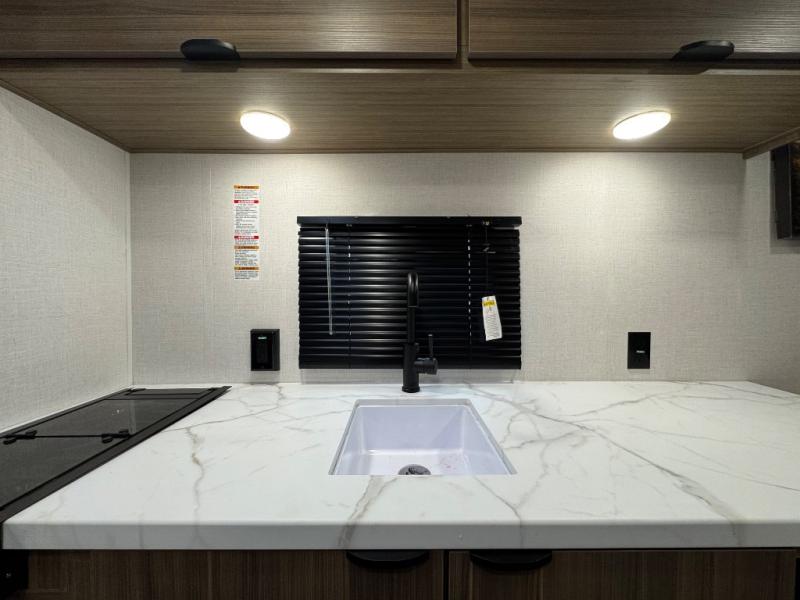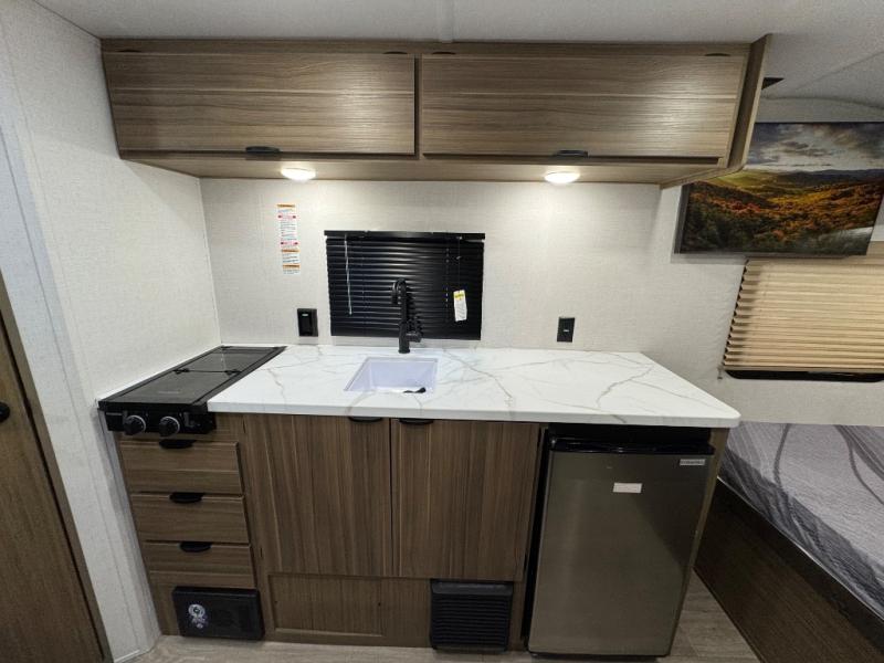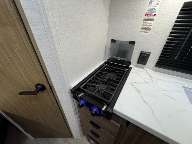 The double-size bunks with storage will be a big selling point in this travel trailer! While your guests take the bunks, you can have the front queen bed all to yourselves, and there is a wardrobe to keep your things organized. A two burner cooktop and microwave will let you make meals each day, and you can dine at the open lounge with a table.
