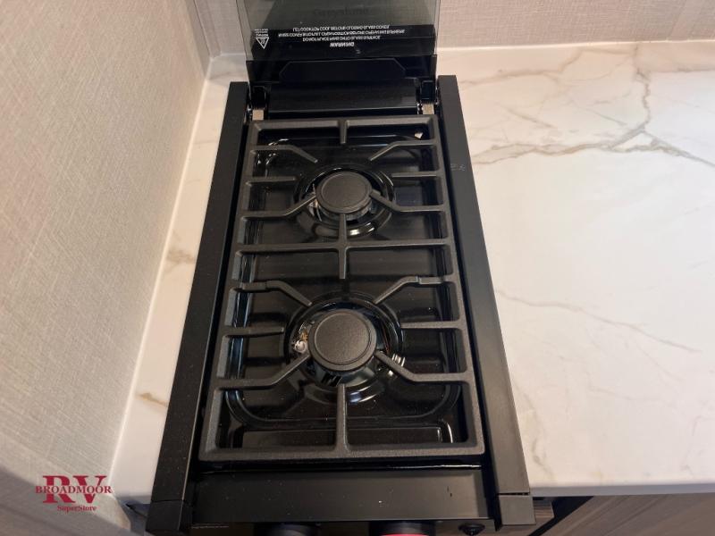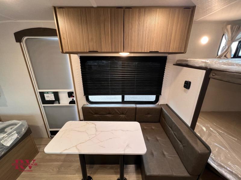 The double-size bunks with storage will be a big selling point in this travel trailer! While your guests take the bunks, you can have the front queen bed all to yourselves, and there is a wardrobe to keep your things organized. A two burner cooktop and microwave will let you make meals each day, and you can dine at the open lounge with a table.