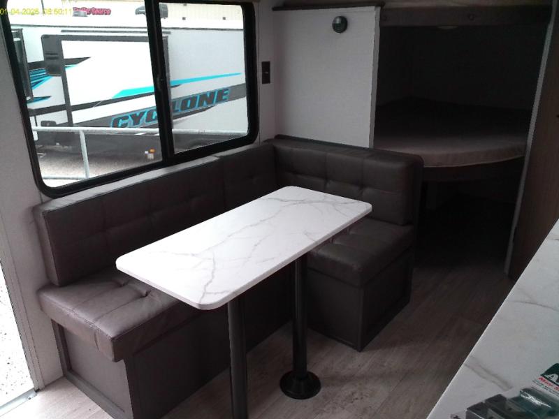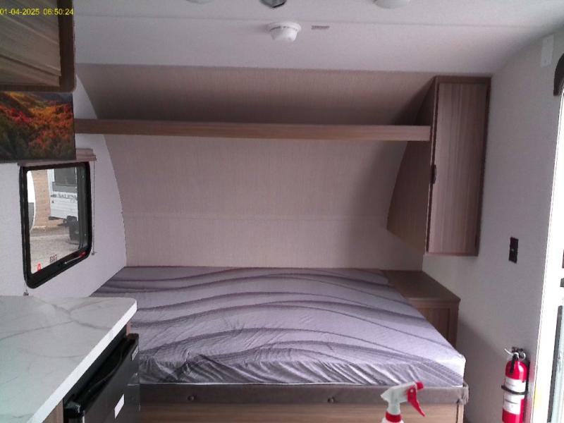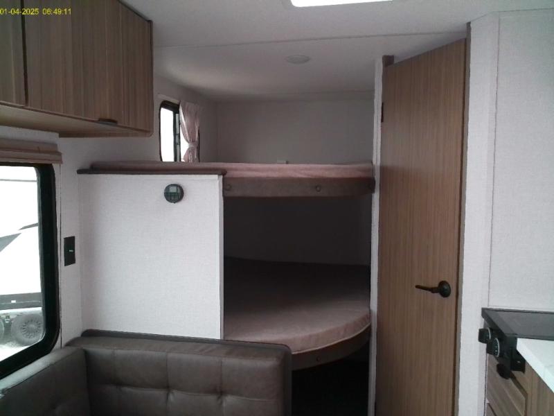 The double-size bunks with storage will be a big selling point in this travel trailer! While your guests take the bunks, you can have the front queen bed all to yourselves, and there is a wardrobe to keep your things organized. A two burner cooktop and microwave will let you make meals each day, and you can dine at the open lounge with a table.