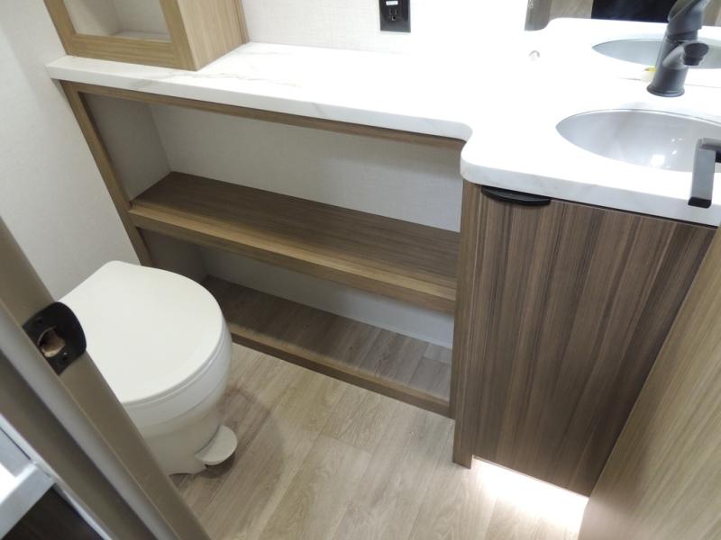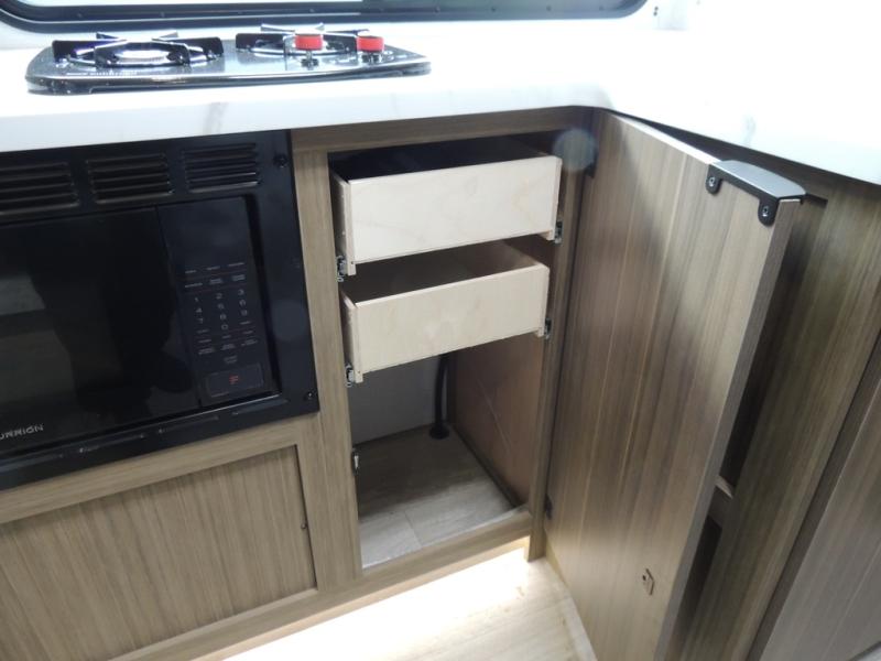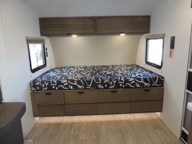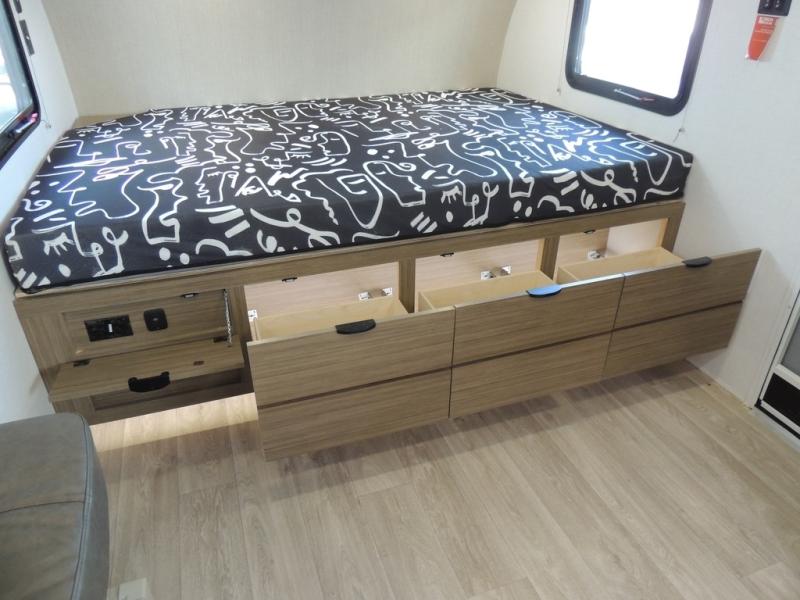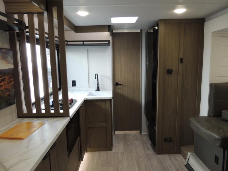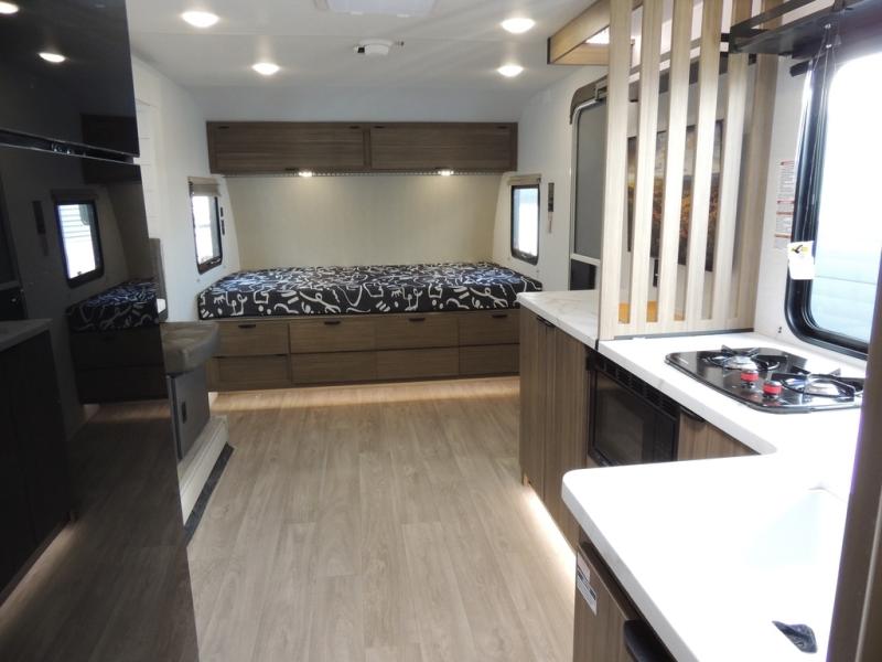 It will be so easy to enjoy time spent in this travel trailer for three. The front queen bed provides a great night's rest, and there is an overhead cabinet to keep your things organized. A two-burner cooktop in the kitchen will let you make meals for your crew, and a refrigerator keeps leftovers fresh. You can dine at the booth dinette within the slide out or take your plate outdoors to sit under the 12' power awning. And a full rear bath with a shower, toilet, and large vanity counter lets you stay clean each day!