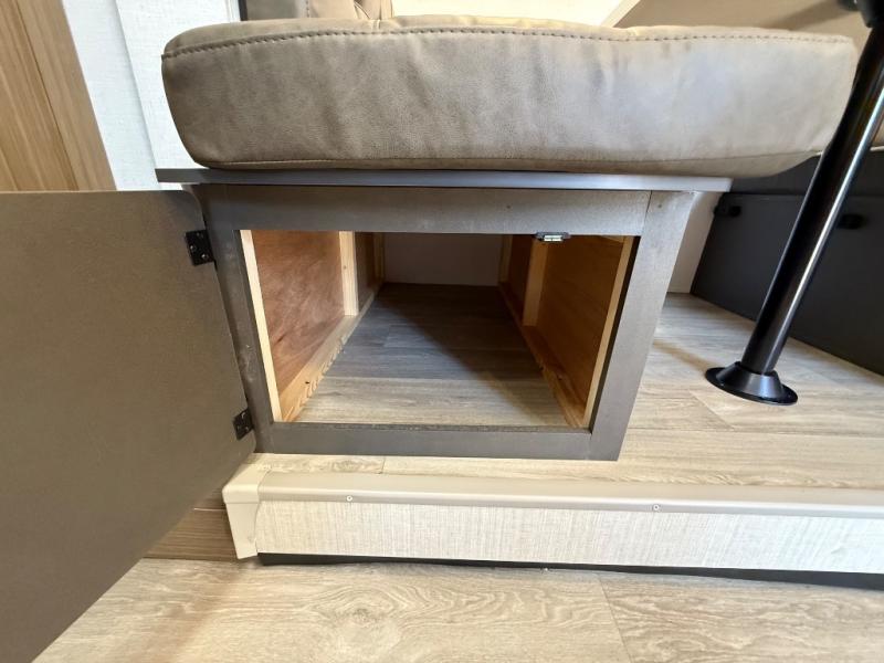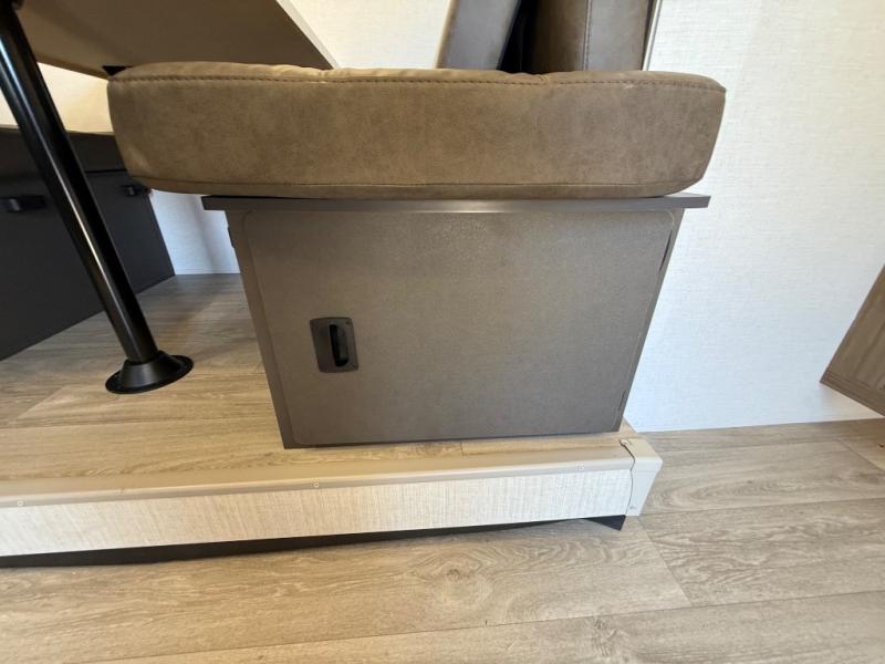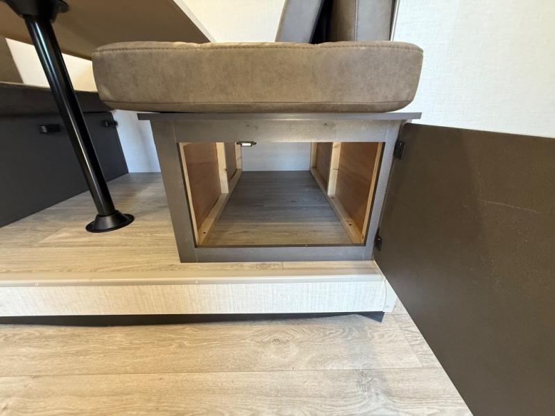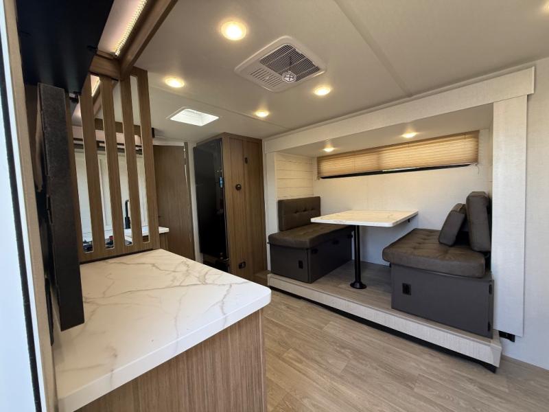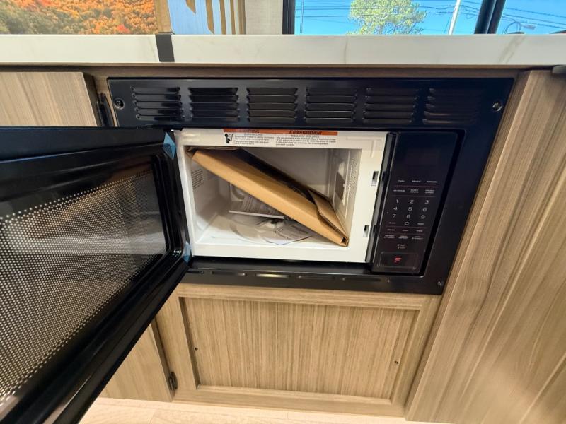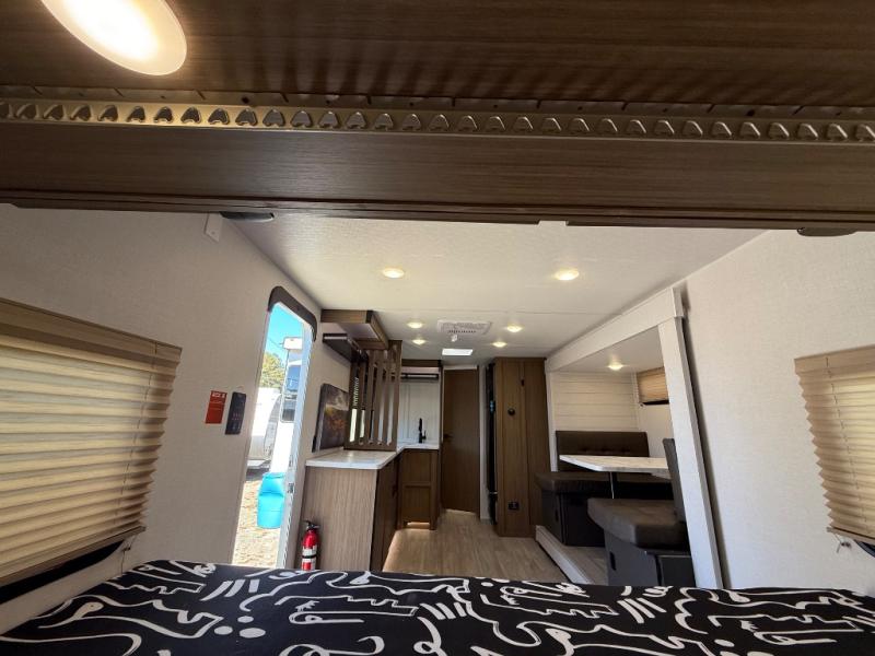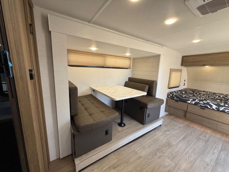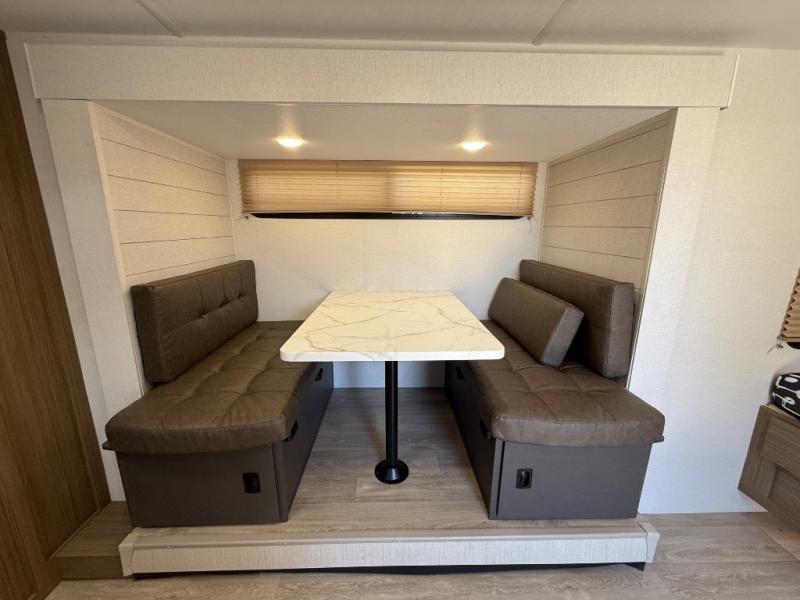 It will be so easy to enjoy time spent in this travel trailer for three. The front queen bed provides a great night's rest, and there is an overhead cabinet to keep your things organized. A two-burner cooktop in the kitchen will let you make meals for your crew, and a refrigerator keeps leftovers fresh. You can dine at the booth dinette within the slide out or take your plate outdoors to sit under the 12' power awning. And a full rear bath with a shower, toilet, and large vanity counter lets you stay clean each day!