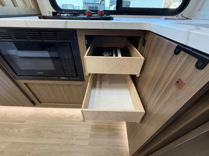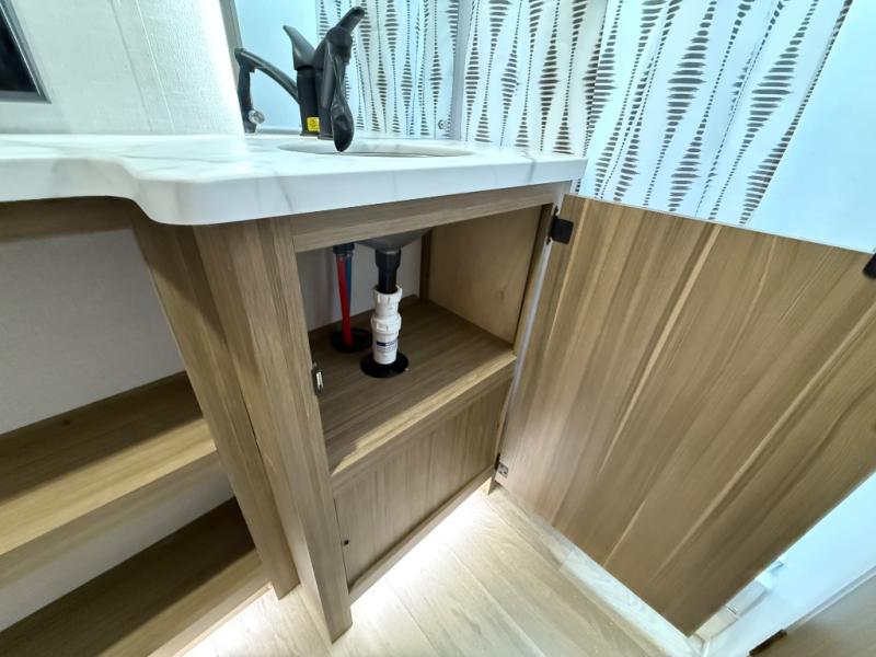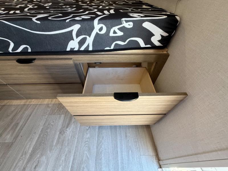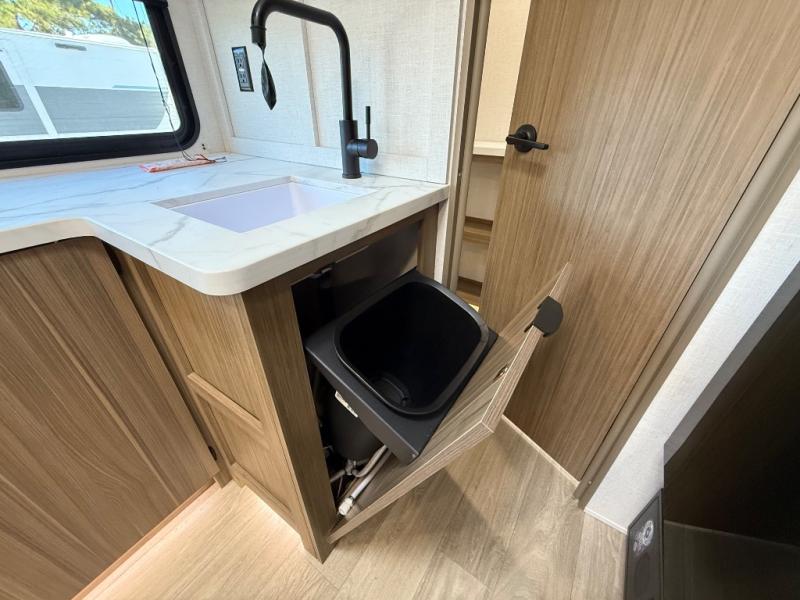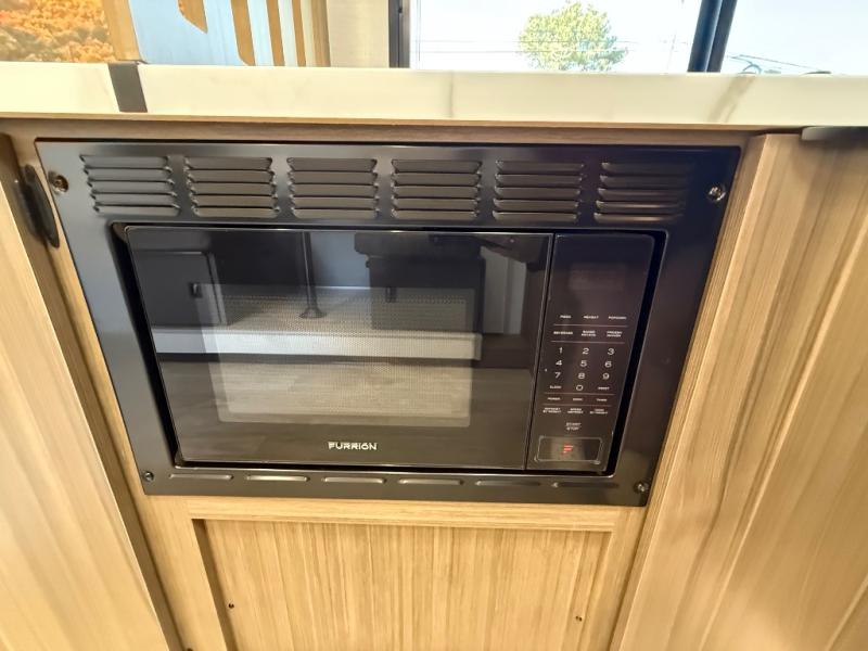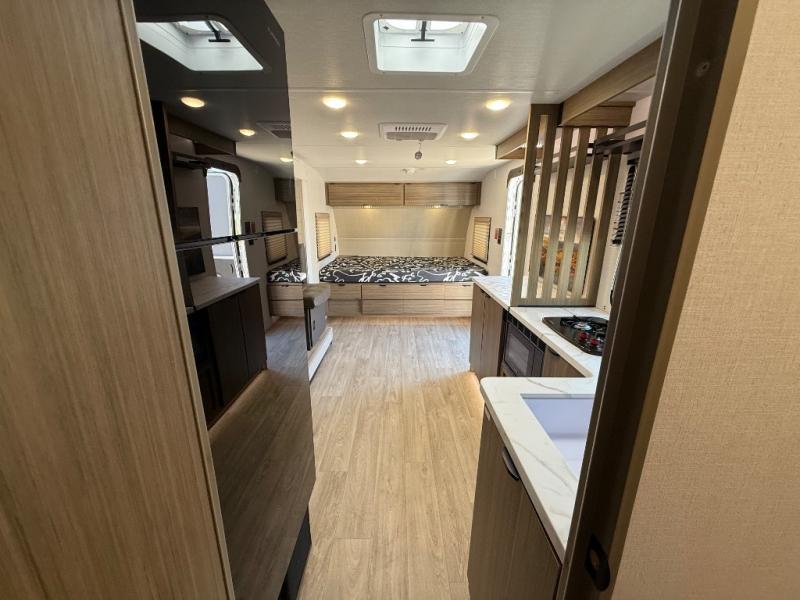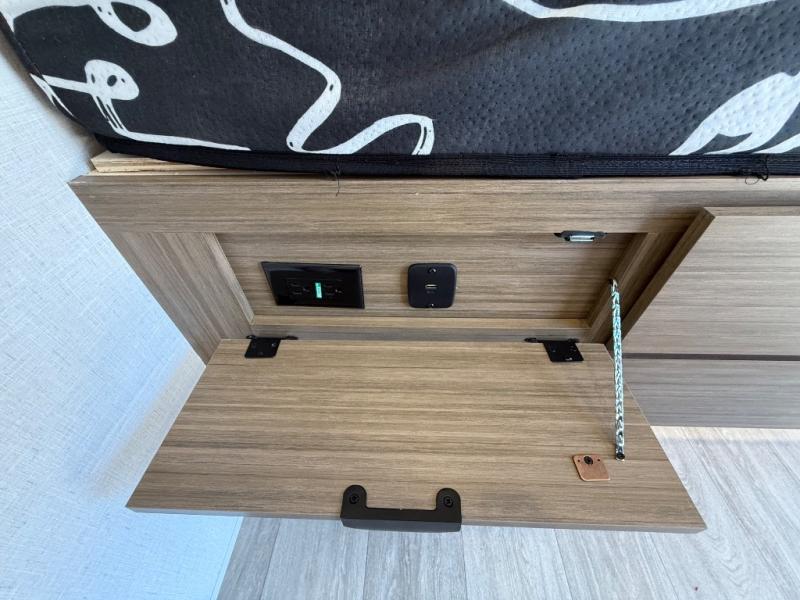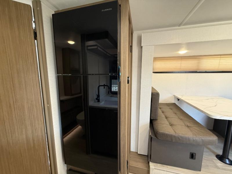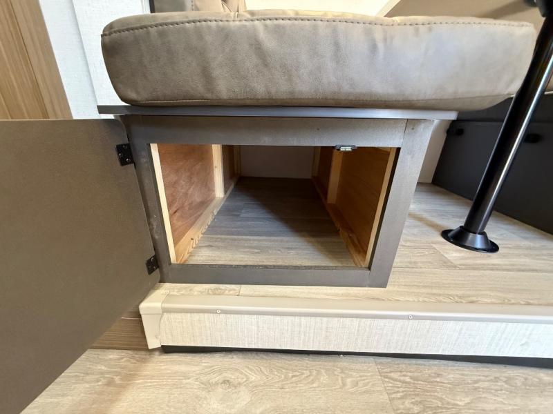 It will be so easy to enjoy time spent in this travel trailer for three. The front queen bed provides a great night's rest, and there is an overhead cabinet to keep your things organized. A two-burner cooktop in the kitchen will let you make meals for your crew, and a refrigerator keeps leftovers fresh. You can dine at the booth dinette within the slide out or take your plate outdoors to sit under the 12' power awning. And a full rear bath with a shower, toilet, and large vanity counter lets you stay clean each day!