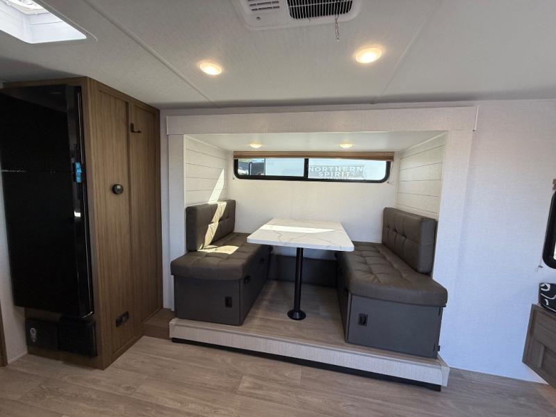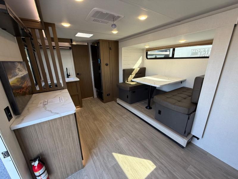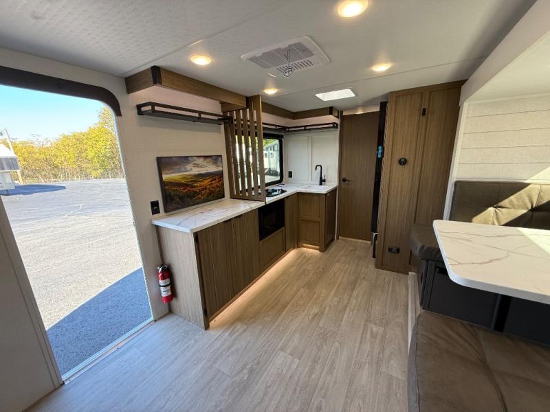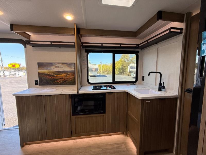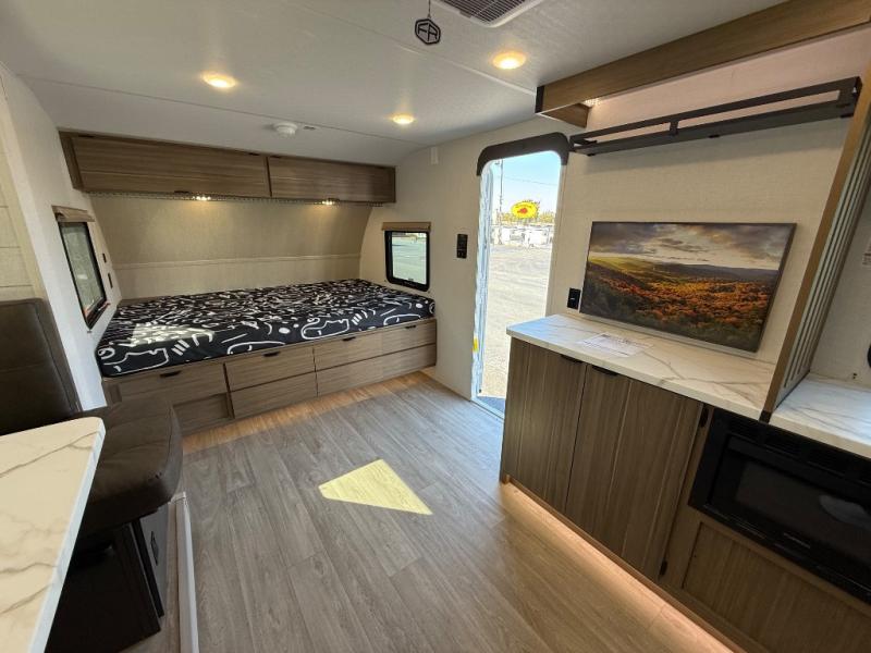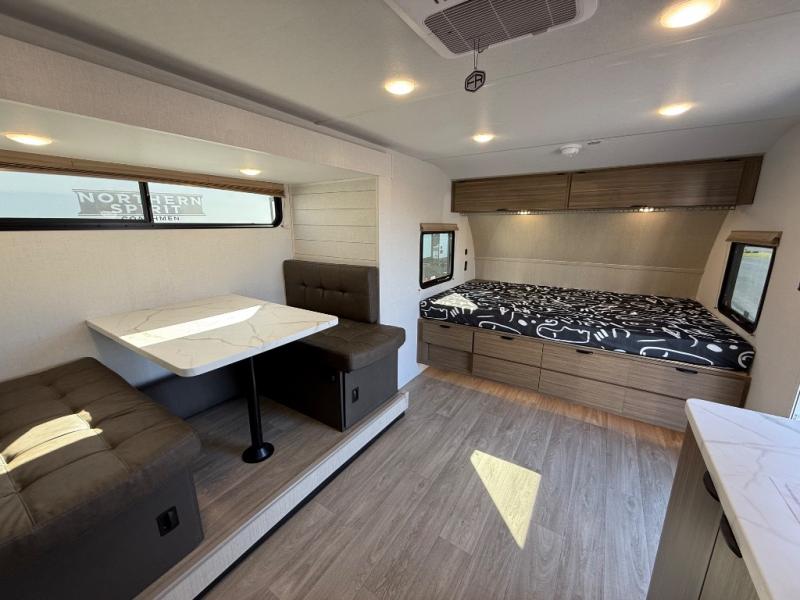 It will be so easy to enjoy time spent in this travel trailer for three. The front queen bed provides a great night's rest, and there is an overhead cabinet to keep your things organized. A two-burner cooktop in the kitchen will let you make meals for your crew, and a refrigerator keeps leftovers fresh. You can dine at the booth dinette within the slide out or take your plate outdoors to sit under the 12' power awning. And a full rear bath with a shower, toilet, and large vanity counter lets you stay clean each day!