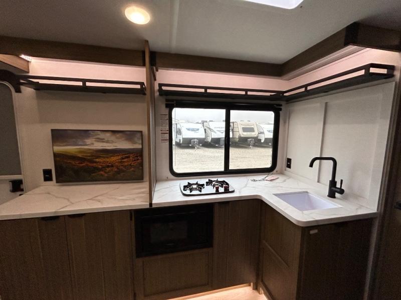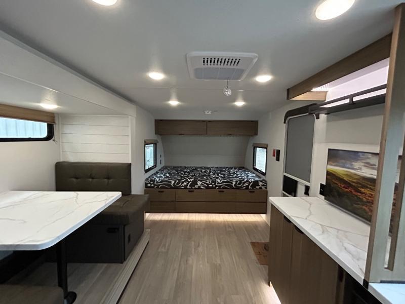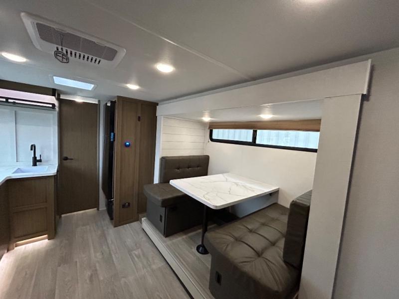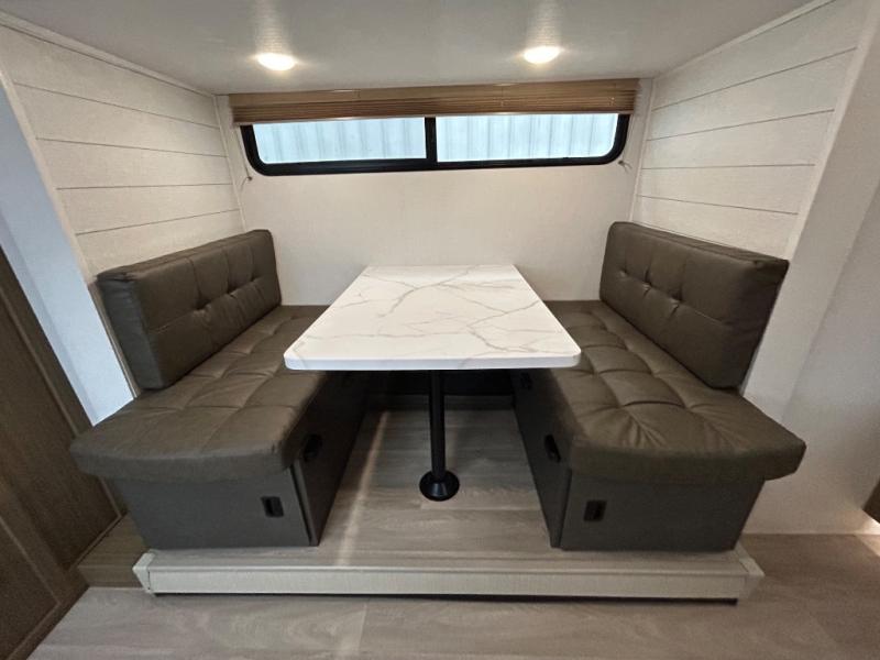 It will be so easy to enjoy time spent in this travel trailer for three. The front queen bed provides a great night's rest, and there is an overhead cabinet to keep your things organized. A two-burner cooktop in the kitchen will let you make meals for your crew, and a refrigerator keeps leftovers fresh. You can dine at the booth dinette within the slide out or take your plate outdoors to sit under the 12' power awning. And a full rear bath with a shower, toilet, and large vanity counter lets you stay clean each day!