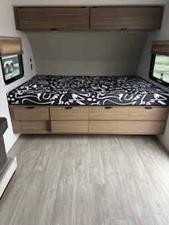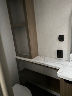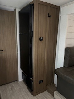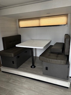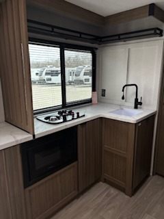 It will be so easy to enjoy time spent in this travel trailer for three. The front queen bed provides a great night's rest, and there is an overhead cabinet to keep your things organized. A two-burner cooktop in the kitchen will let you make meals for your crew, and a refrigerator keeps leftovers fresh. You can dine at the booth dinette within the slide out or take your plate outdoors to sit under the 12' power awning. And a full rear bath with a shower, toilet, and large vanity counter lets you stay clean each day!