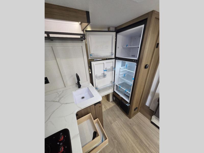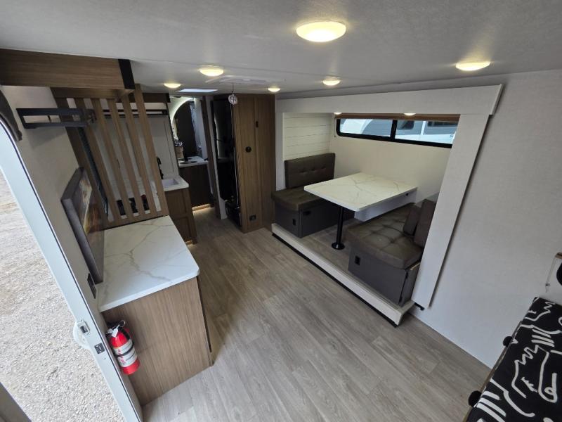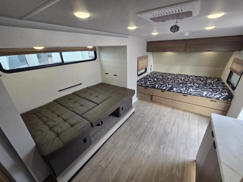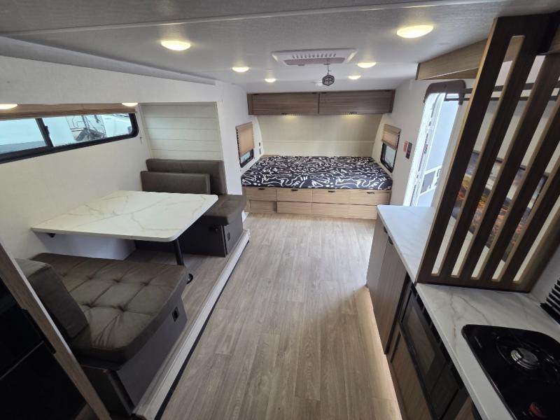 It will be so easy to enjoy time spent in this travel trailer for three. The front queen bed provides a great night's rest, and there is an overhead cabinet to keep your things organized. A two-burner cooktop in the kitchen will let you make meals for your crew, and a refrigerator keeps leftovers fresh. You can dine at the booth dinette within the slide out or take your plate outdoors to sit under the 12' power awning. And a full rear bath with a shower, toilet, and large vanity counter lets you stay clean each day!