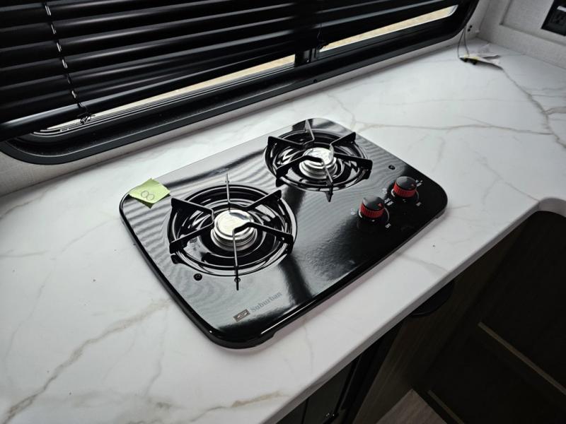 It will be so easy to enjoy time spent in this travel trailer for three. The front queen bed provides a great night's rest, and there is an overhead cabinet to keep your things organized. A two-burner cooktop in the kitchen will let you make meals for your crew, and a refrigerator keeps leftovers fresh. You can dine at the booth dinette within the slide out or take your plate outdoors to sit under the 12' power awning. And a full rear bath with a shower, toilet, and large vanity counter lets you stay clean each day!