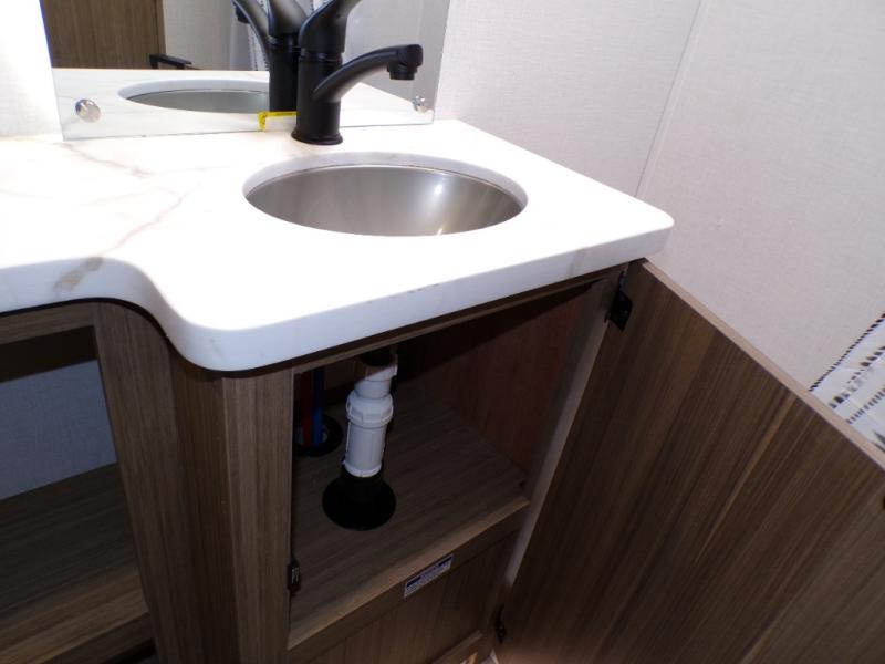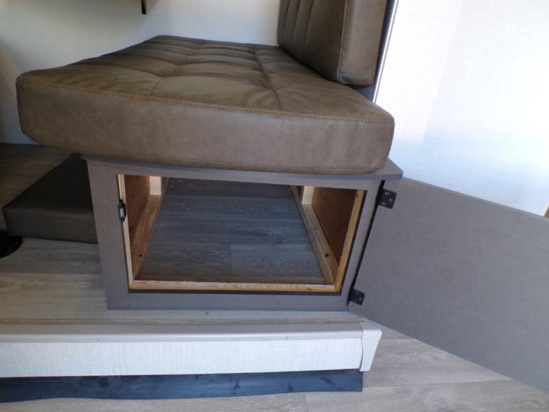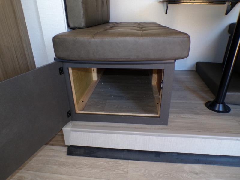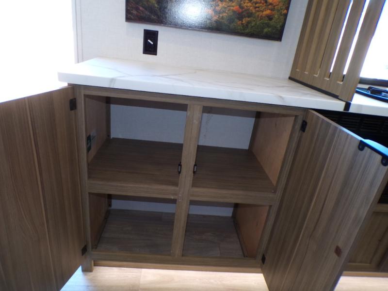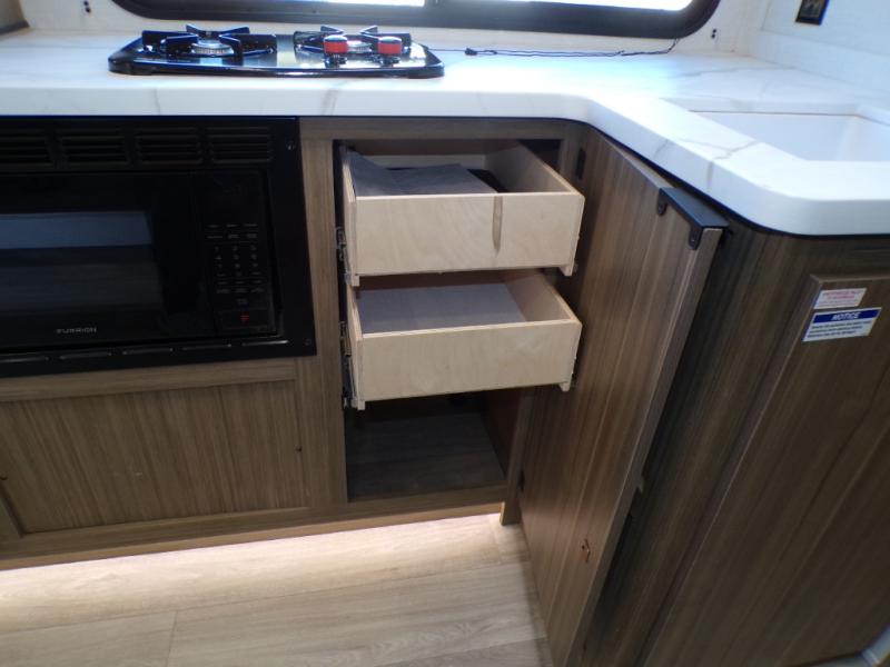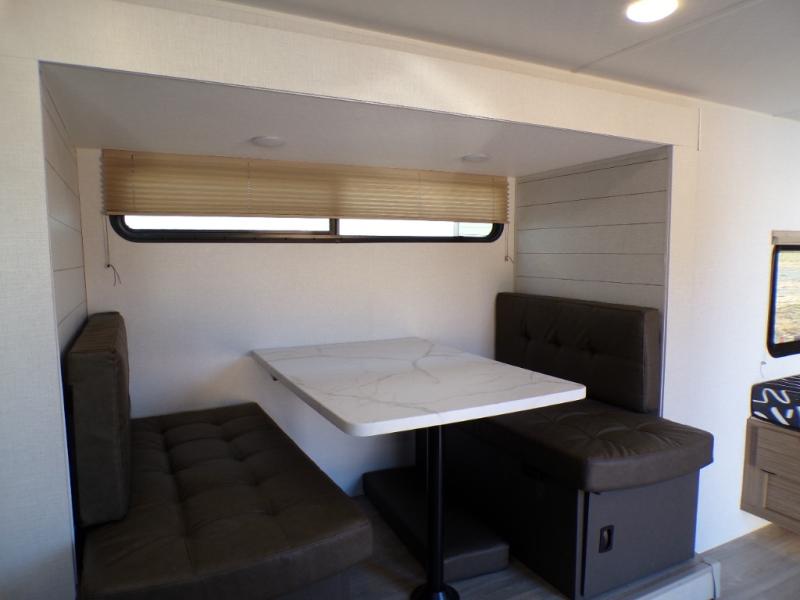 It will be so easy to enjoy time spent in this travel trailer for three. The front queen bed provides a great night's rest, and there is an overhead cabinet to keep your things organized. A two-burner cooktop in the kitchen will let you make meals for your crew, and a refrigerator keeps leftovers fresh. You can dine at the booth dinette within the slide out or take your plate outdoors to sit under the 12' power awning. And a full rear bath with a shower, toilet, and large vanity counter lets you stay clean each day!