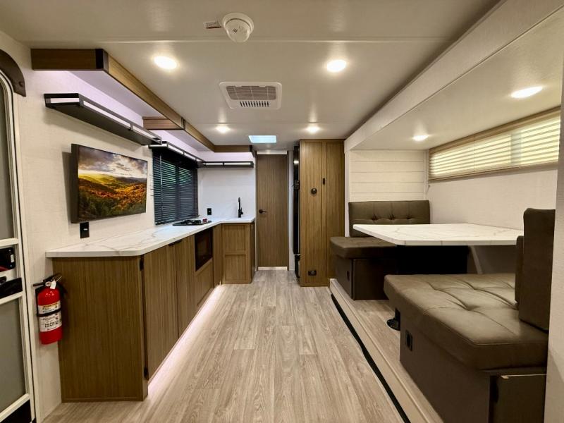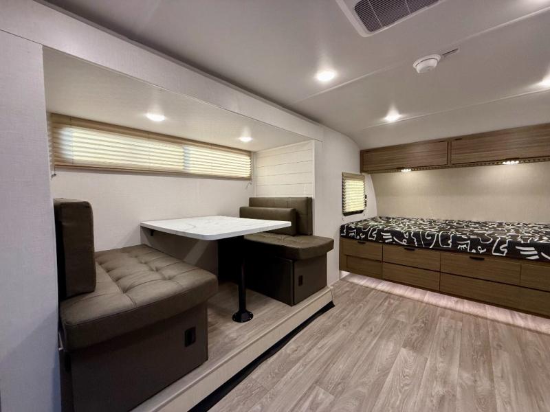 It will be so easy to enjoy time spent in this travel trailer for three. The front queen bed provides a great night's rest, and there is an overhead cabinet to keep your things organized. A two-burner cooktop in the kitchen will let you make meals for your crew, and a refrigerator keeps leftovers fresh. You can dine at the booth dinette within the slide out or take your plate outdoors to sit under the 12' power awning. And a full rear bath with a shower, toilet, and large vanity counter lets you stay clean each day!