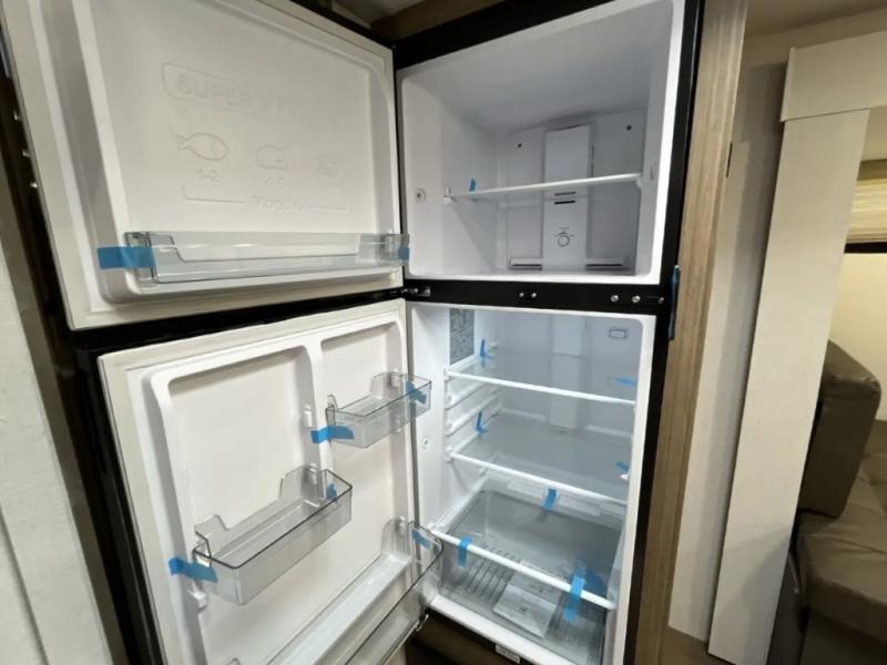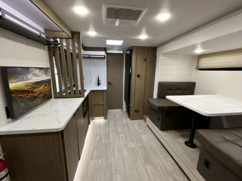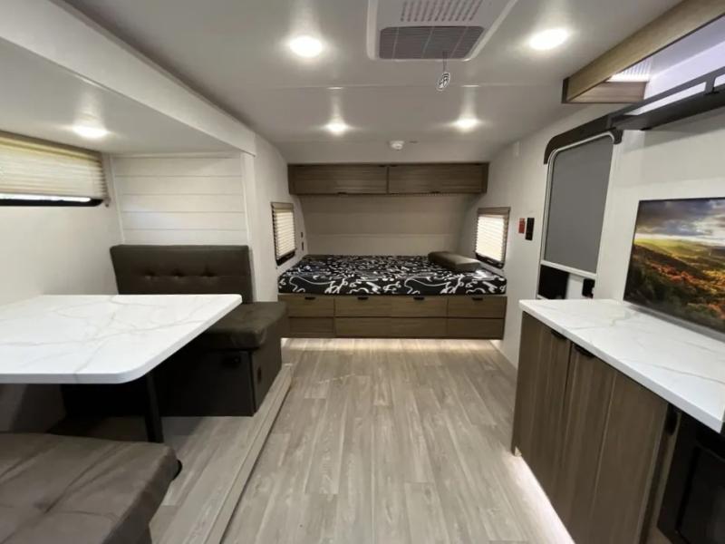 It will be so easy to enjoy time spent in this travel trailer for three. The front queen bed provides a great night's rest, and there is an overhead cabinet to keep your things organized. A two-burner cooktop in the kitchen will let you make meals for your crew, and a refrigerator keeps leftovers fresh. You can dine at the booth dinette within the slide out or take your plate outdoors to sit under the 12' power awning. And a full rear bath with a shower, toilet, and large vanity counter lets you stay clean each day!
