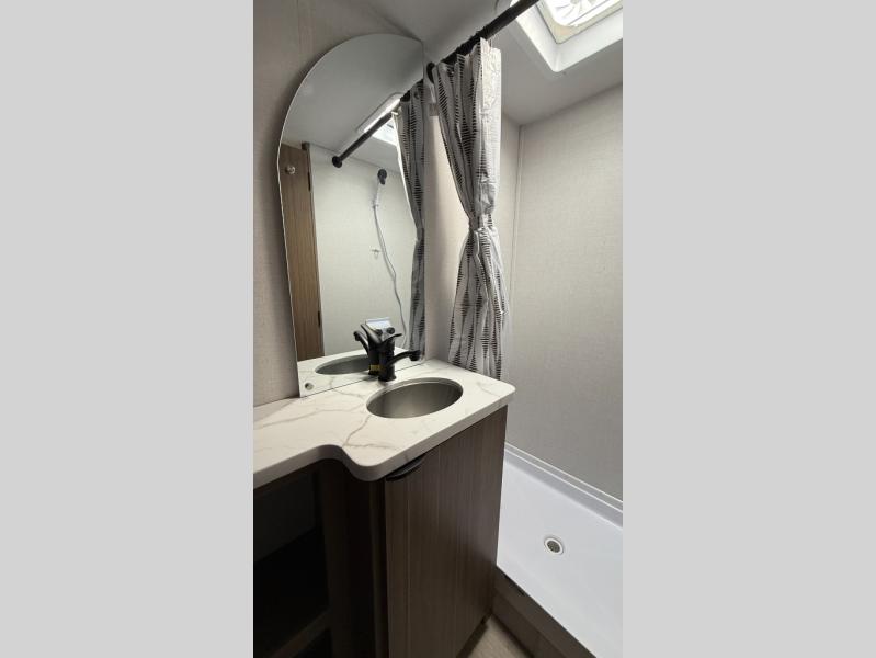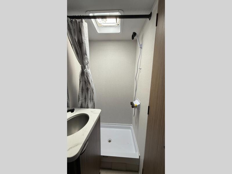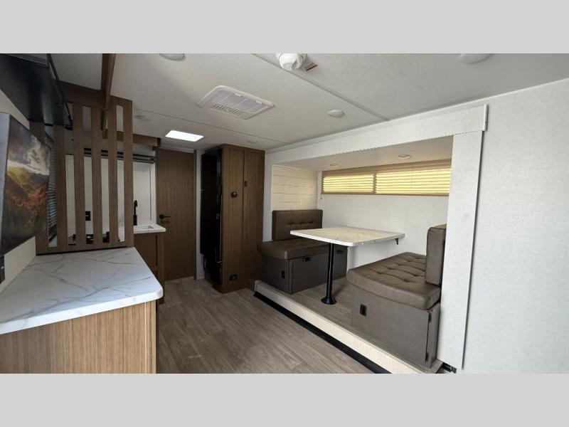 It will be so easy to enjoy time spent in this travel trailer for three. The front queen bed provides a great night's rest, and there is an overhead cabinet to keep your things organized. A two-burner cooktop in the kitchen will let you make meals for your crew, and a refrigerator keeps leftovers fresh. You can dine at the booth dinette within the slide out or take your plate outdoors to sit under the 12' power awning. And a full rear bath with a shower, toilet, and large vanity counter lets you stay clean each day!
