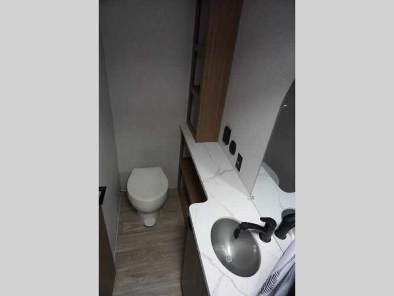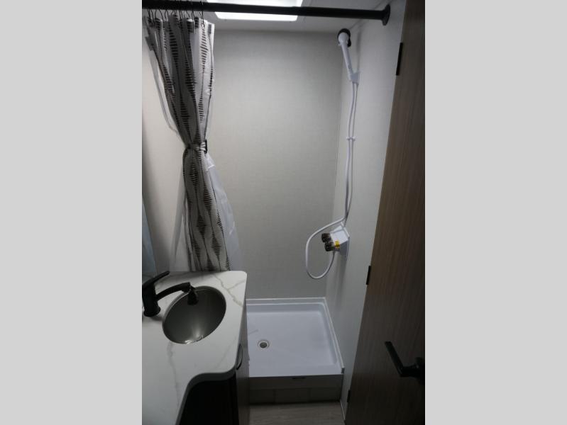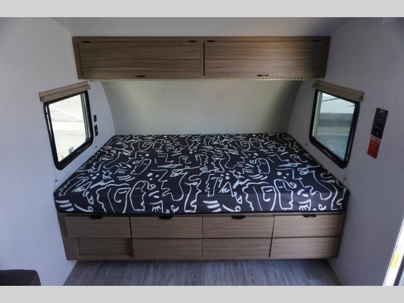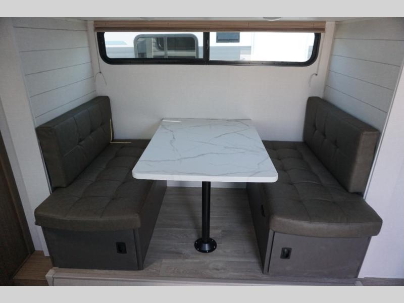 It will be so easy to enjoy time spent in this travel trailer for three. The front queen bed provides a great night's rest, and there is an overhead cabinet to keep your things organized. A two-burner cooktop in the kitchen will let you make meals for your crew, and a refrigerator keeps leftovers fresh. You can dine at the booth dinette within the slide out or take your plate outdoors to sit under the 12' power awning. And a full rear bath with a shower, toilet, and large vanity counter lets you stay clean each day!