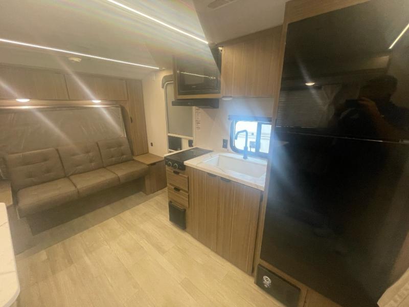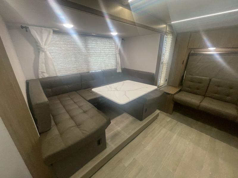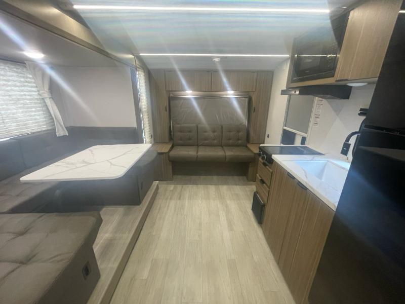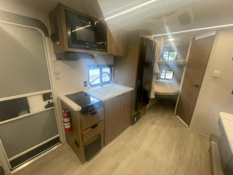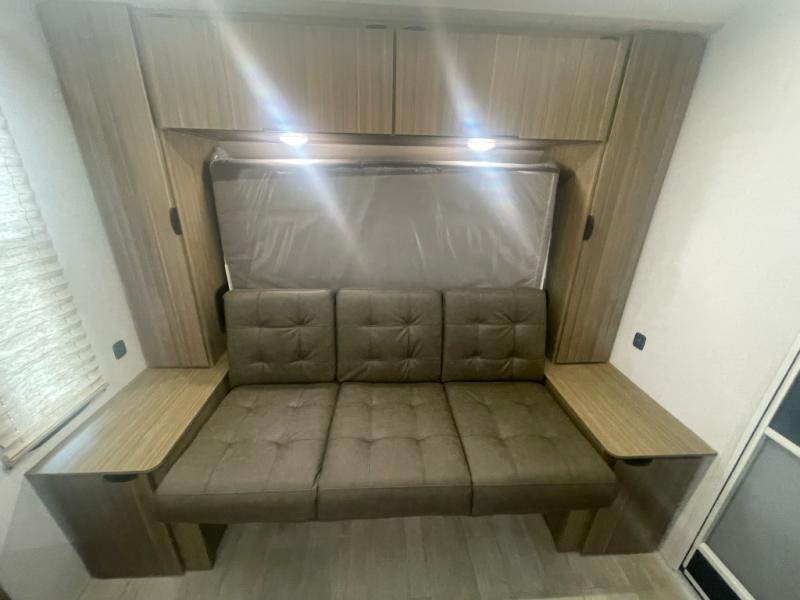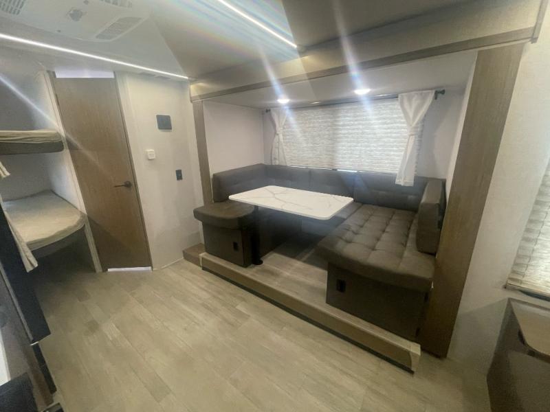 Start camping the right way in this travel trailer! It features a front Murphy bed that will double as your seating and sleeping space each day. The corner set of double-size bunk beds come with storage to keep things out of the way and are conveniently next to the rear corner bathroom with a shower with a skylight to freshen up in each morning. You can prepare your best home cooked meals indoors with the two burner cooktop or head to the outside kitchen to fry up some burgers while breathing in some fresh air. Enjoy your meals, play card games, and even sleep at the U-shaped dinette slide. You will also appreciate the outside shower and the exterior full pass-through storage for camp gear!