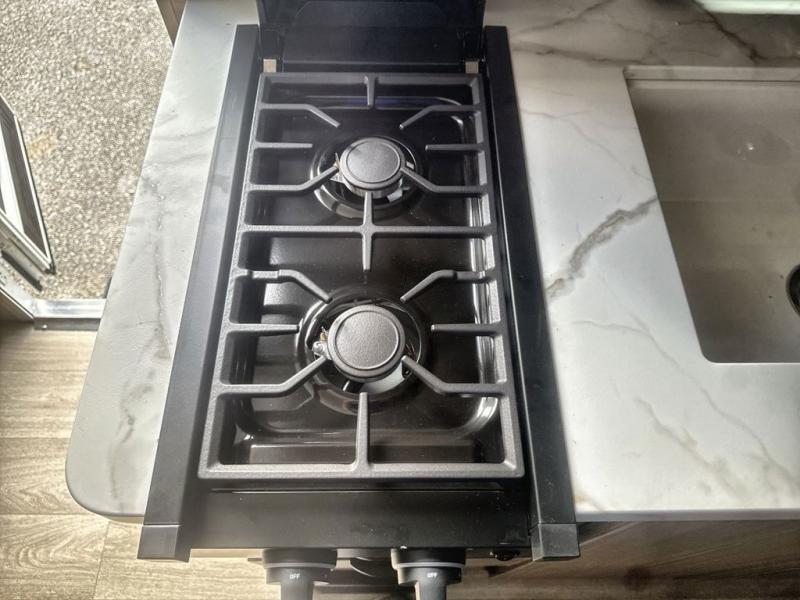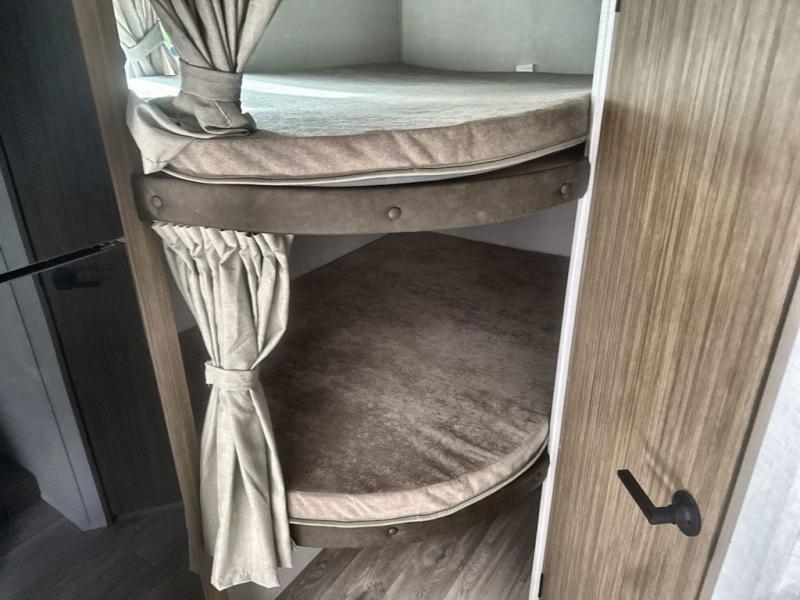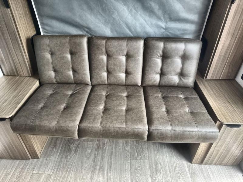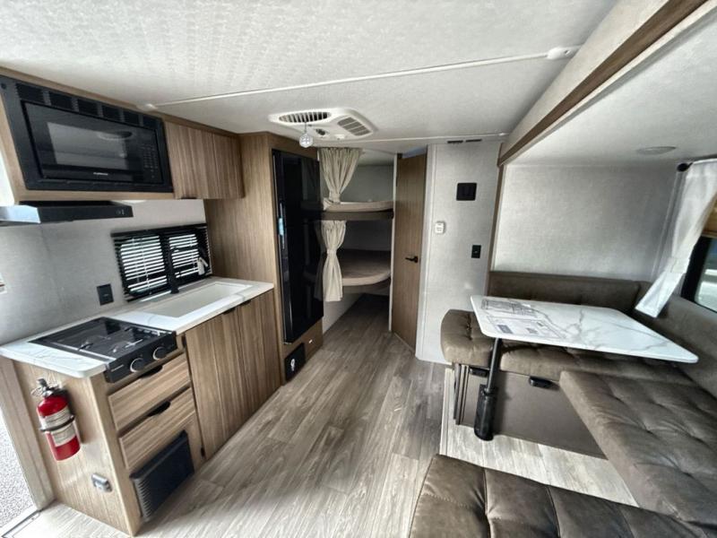 Start camping the right way in this travel trailer! It features a front Murphy bed that will double as your seating and sleeping space each day. The corner set of double-size bunk beds come with storage to keep things out of the way and are conveniently next to the rear corner bathroom with a shower with a skylight to freshen up in each morning. You can prepare your best home cooked meals indoors with the two burner cooktop or head to the outside kitchen to fry up some burgers while breathing in some fresh air. Enjoy your meals, play card games, and even sleep at the U-shaped dinette slide. You will also appreciate the outside shower and the exterior full pass-through storage for camp gear!